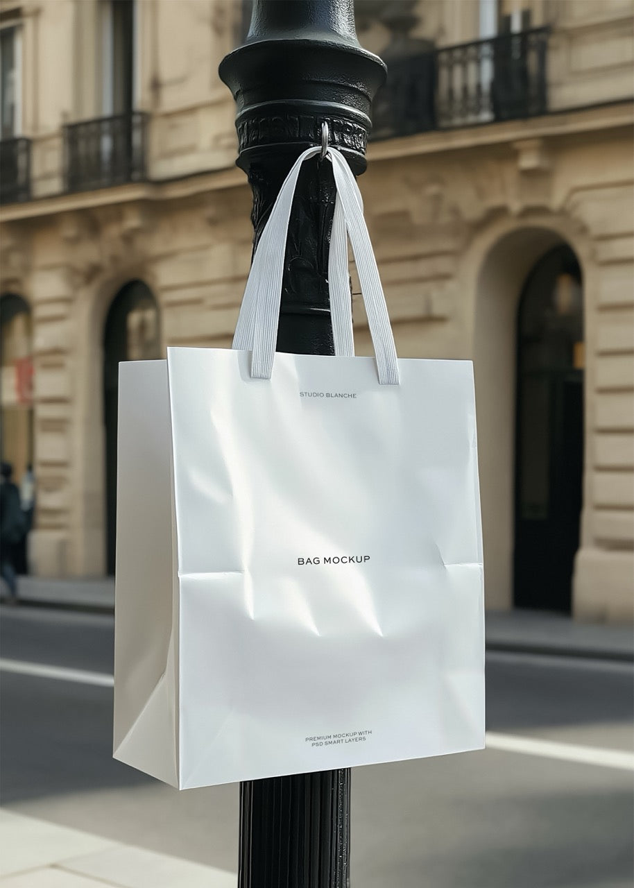 Introducing our Shopping Bag Mockup, the ultimate tool for designers looking to elevate their branding presentations. This mockup features a contemporary shopping bag, complete with stylish handles, gracefully hanging from a lamppost against a chic architectural backdrop. Ideal for showcasing your creative projects, this high-resolution mockup captures the essence of modern sophistication, making it perfect for impressing clients and enhancing your portfolio.