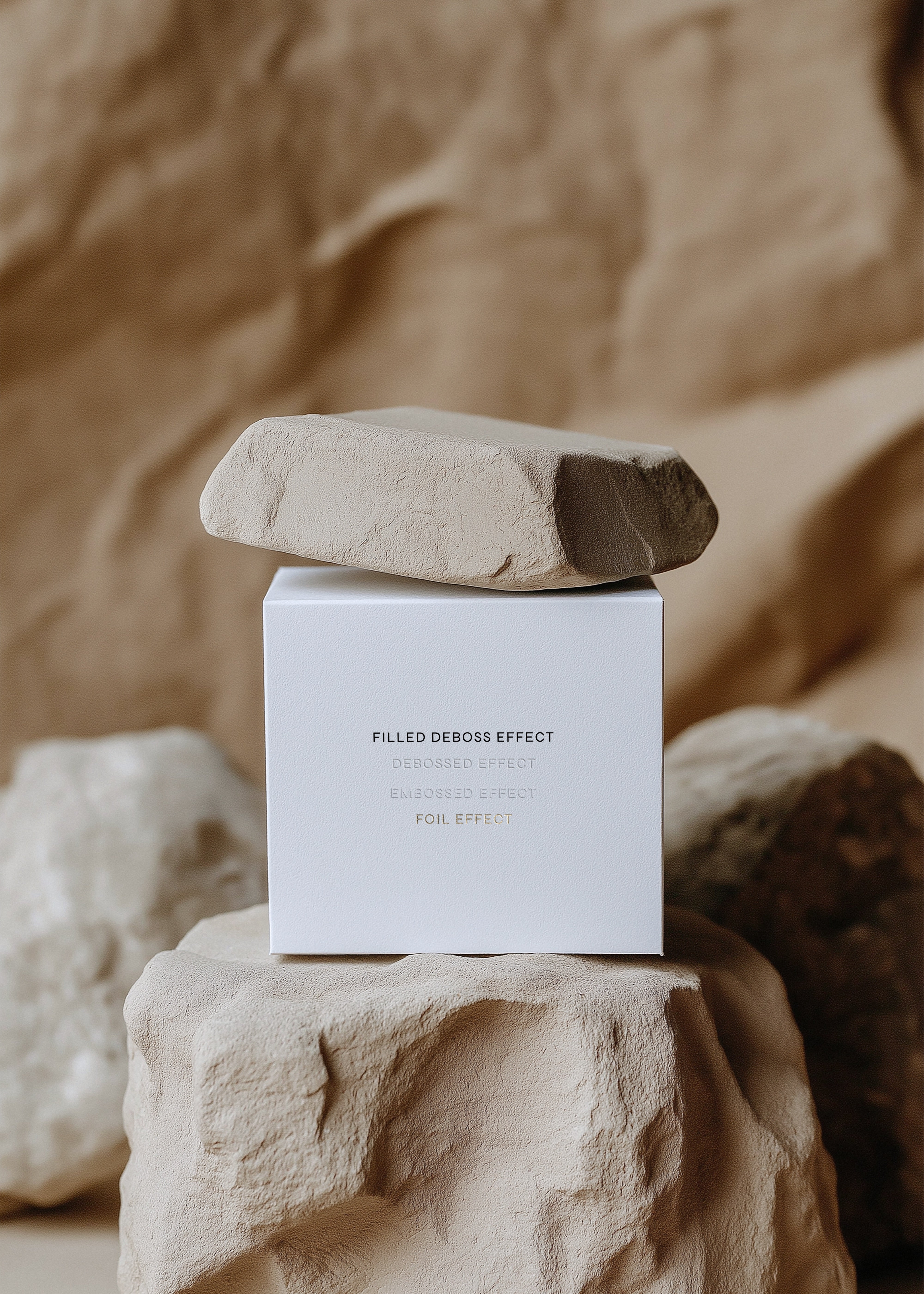 Presenting our Packaging Box Mockup - the white cardboard box, with its perfect square shape, is a blank canvas waiting for your design to bring it to life. Set against a neutral backdrop featuring artfully arranged stone props, this mockup evokes an understated aesthetic that puts the spotlight on your design. The minimal setting ensures that your work commands attention, enabling your clients to fully appreciate your design's intention. As a brand designer, we know that you strive to create designs that not only look good but also resonate with the audience and our Packaging Box Mockup is here to help you do just that.
