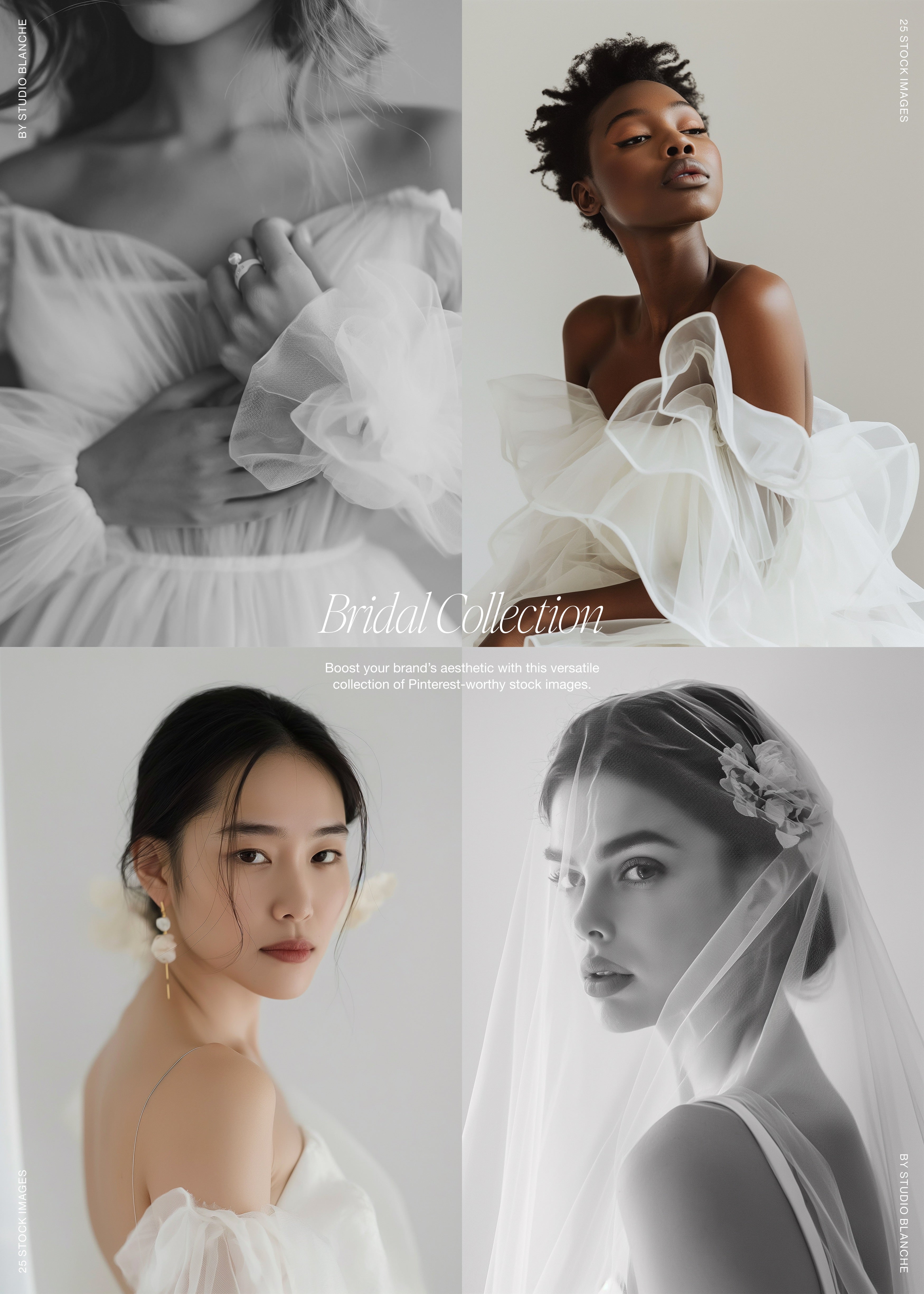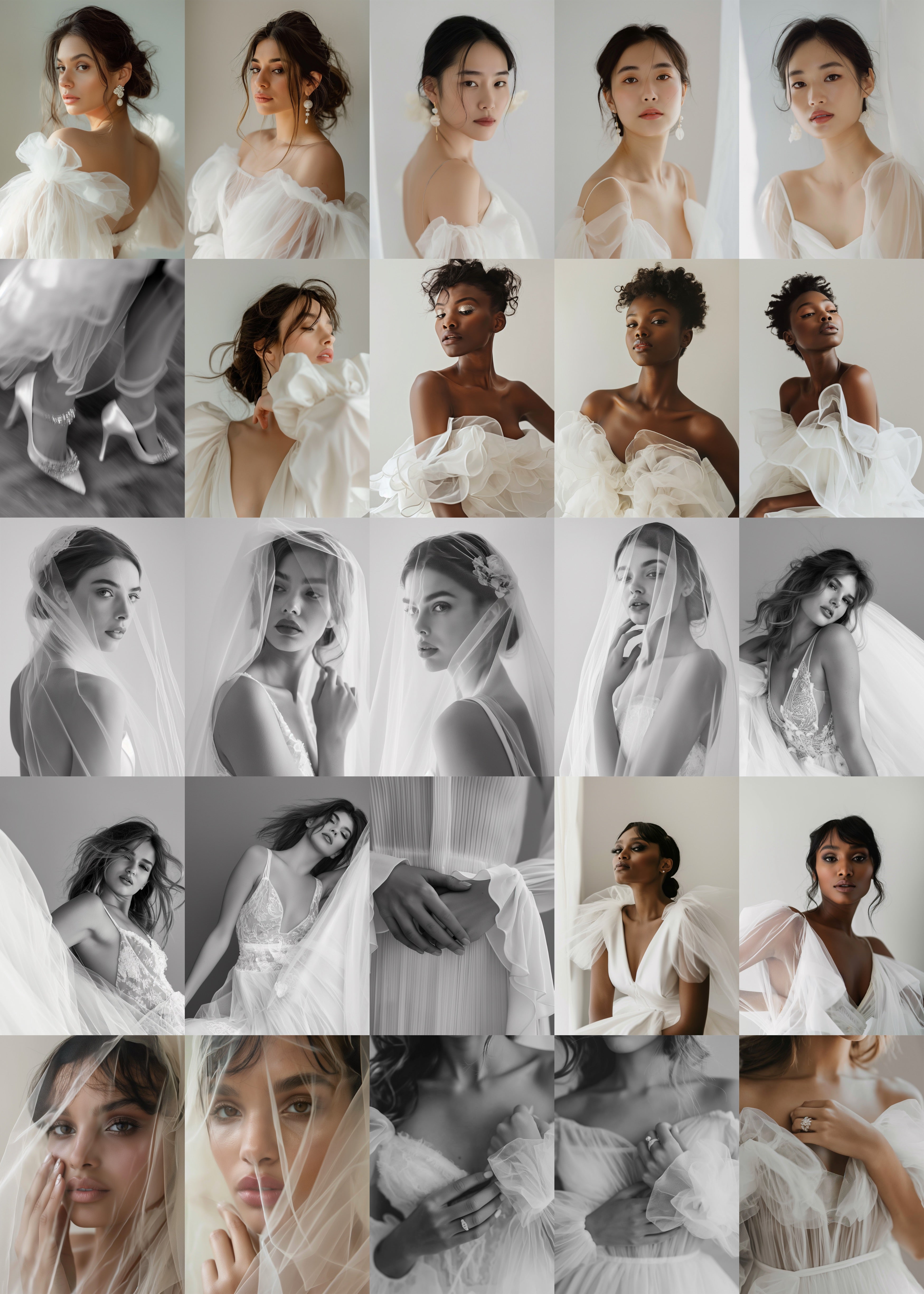 This collection is a compilation of fashion-forward images of brides in wedding dresses, stunning close-ups, and heartwarming portraits. Ideal for wedding bloggers, bridal boutiques, brand designers, wedding planners, and content creators aiming to paint a picture-perfect wedding narrative. Our collection includes editorial images featuring brides in a variety of wedding dresses.