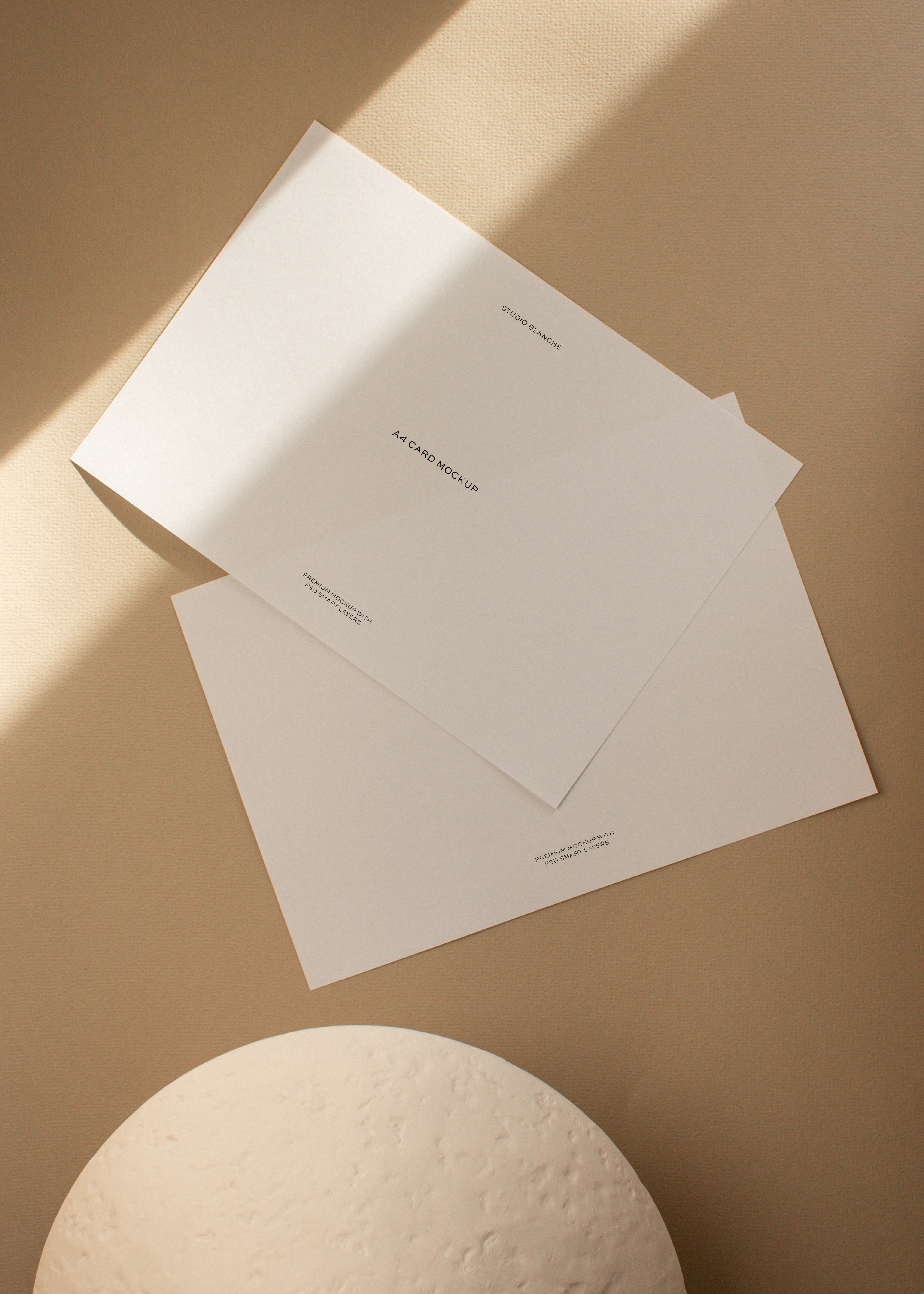 Present your designs in style with this two-sheet Stationery Mockup, featuring A4 paper sheets set elegantly against a neutral background. The mockup, lit by natural sunlight, offers a fresh and authentic visual representation. The distinctive feature of this mockup is its four print effect layers that add depth, texture, and a real-world feel to your presentations. This functionality allows you to display different print effects, giving your clients a realistic expectation of the final printed design. This Two-Sheet A4 Paper Card Mockup is a part of our Carte Mockup Collection.