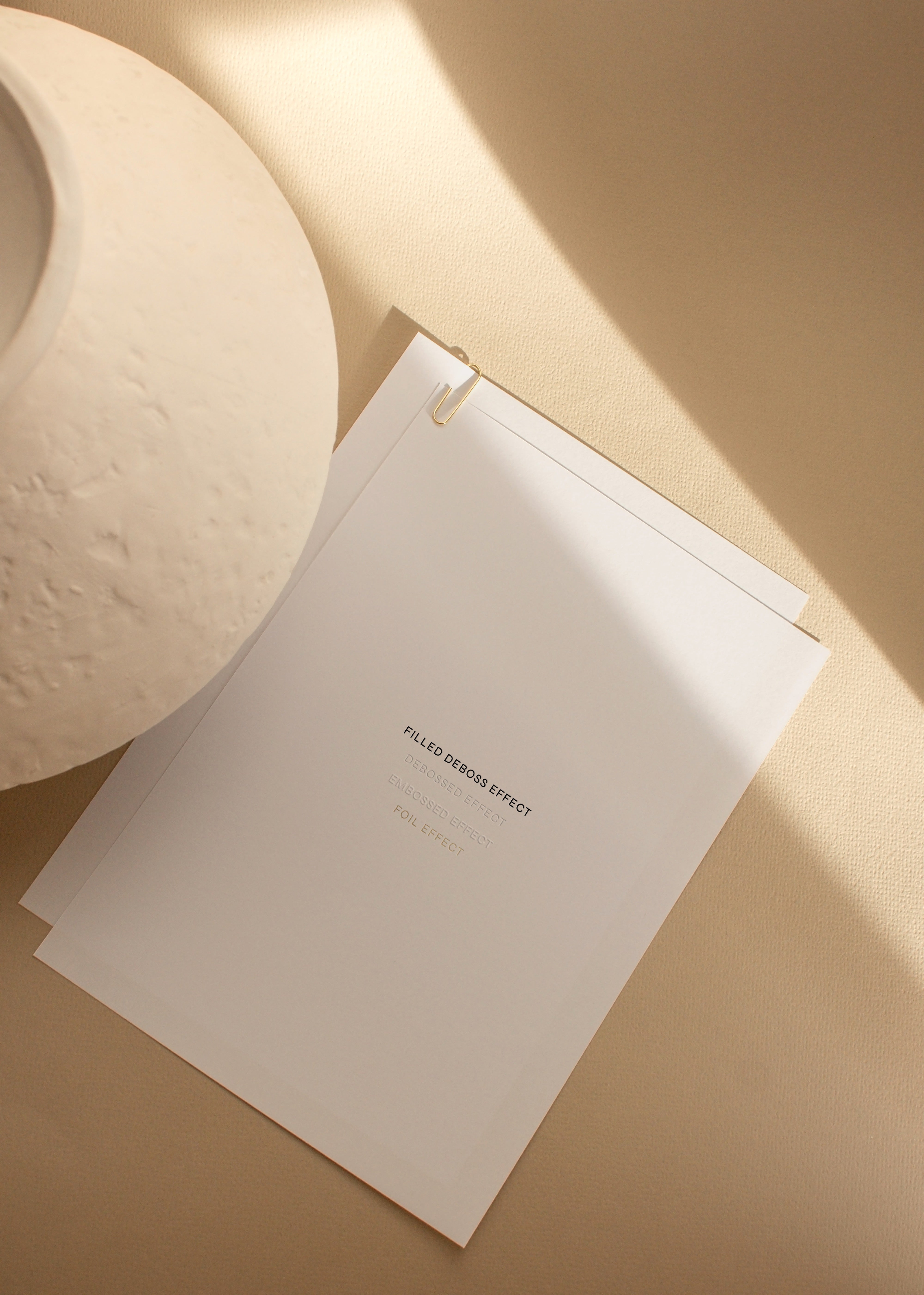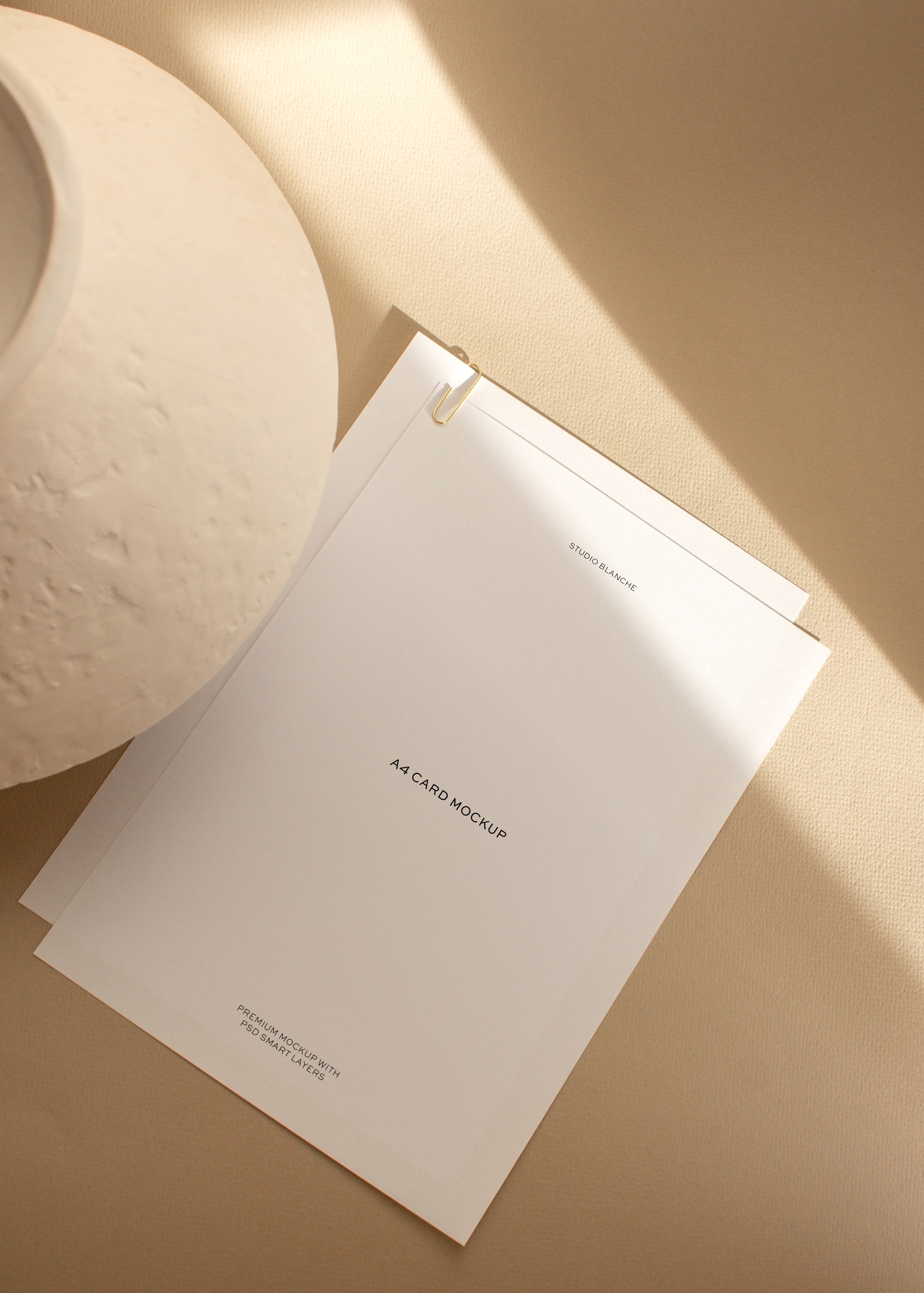 This stationery mockup showcases two sheets of A4 paper, set against a pleasing, neutral backdrop. It's simple and elegant at the same time. The mockup is illuminated with natural sunlight, giving it a vibrant and authentic look. It's a fantastic choice for designers wanting to display their work in a high-end format. One of the unique things about this mockup is that it includes four distinct print effect layers. These layers can enhance your presentations with a sense of depth, texture, and realism. This means you can demonstrate various print effects, giving your clients a clear idea of how the final printed design will appear. This double-sheet A4 Paper Card Mockup is part of our Carte Mockup Collection.