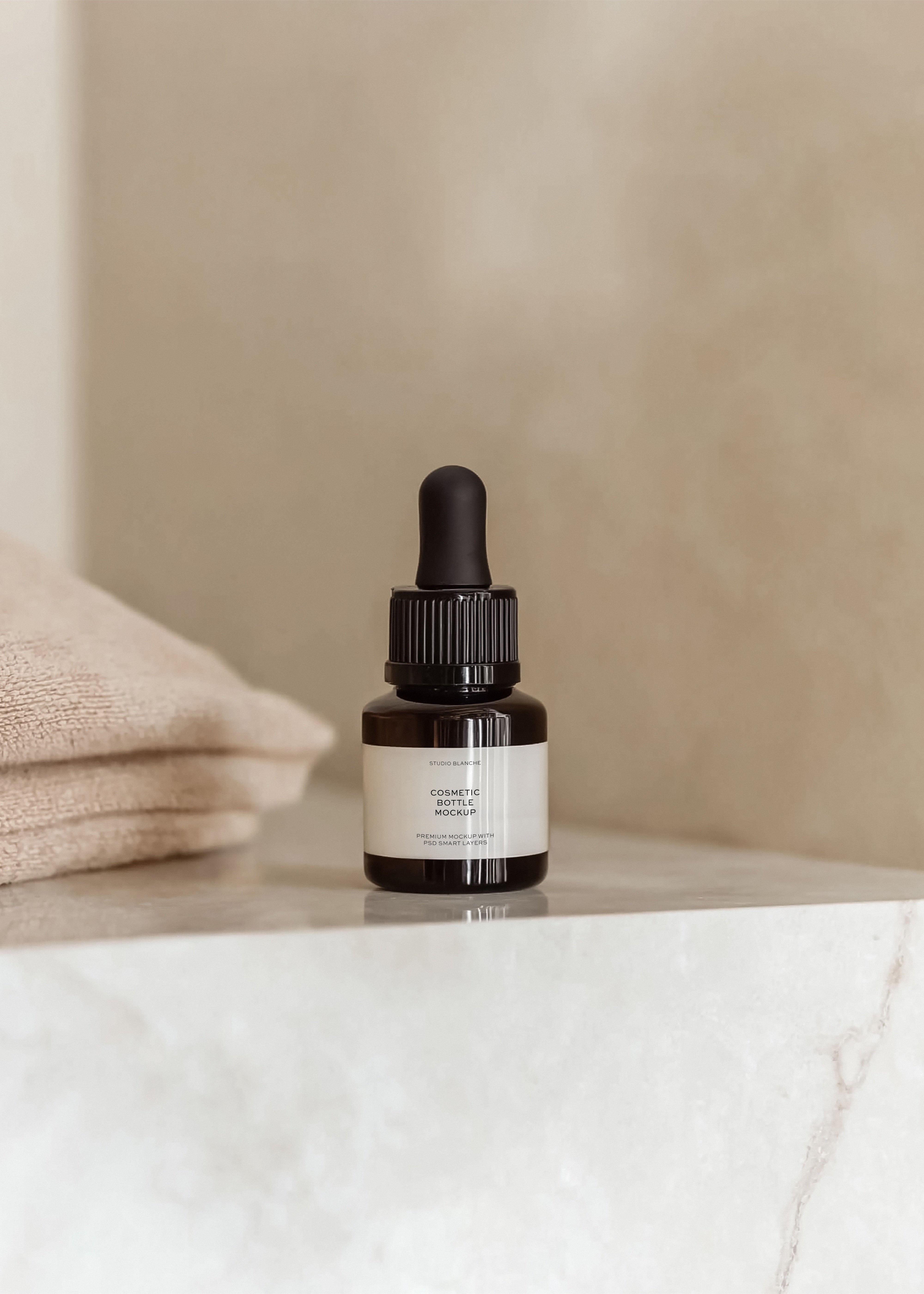 Showcase your cosmetic or skincare label designs with our Dropper Bottle Mockup, featuring a small amber glass serum bottle placed on a sleek marble shelf under soft, natural light. The contemporary, luxurious setting evokes a lifestyle of indulgence and refinement, making it ideal for premium brands or designers who want to elevate their presentations.This mockup goes beyond the ordinary, allowing you to apply gold foil, blind emboss, or other premium print effects to your labels, bringing them to life with sophistication and detail.