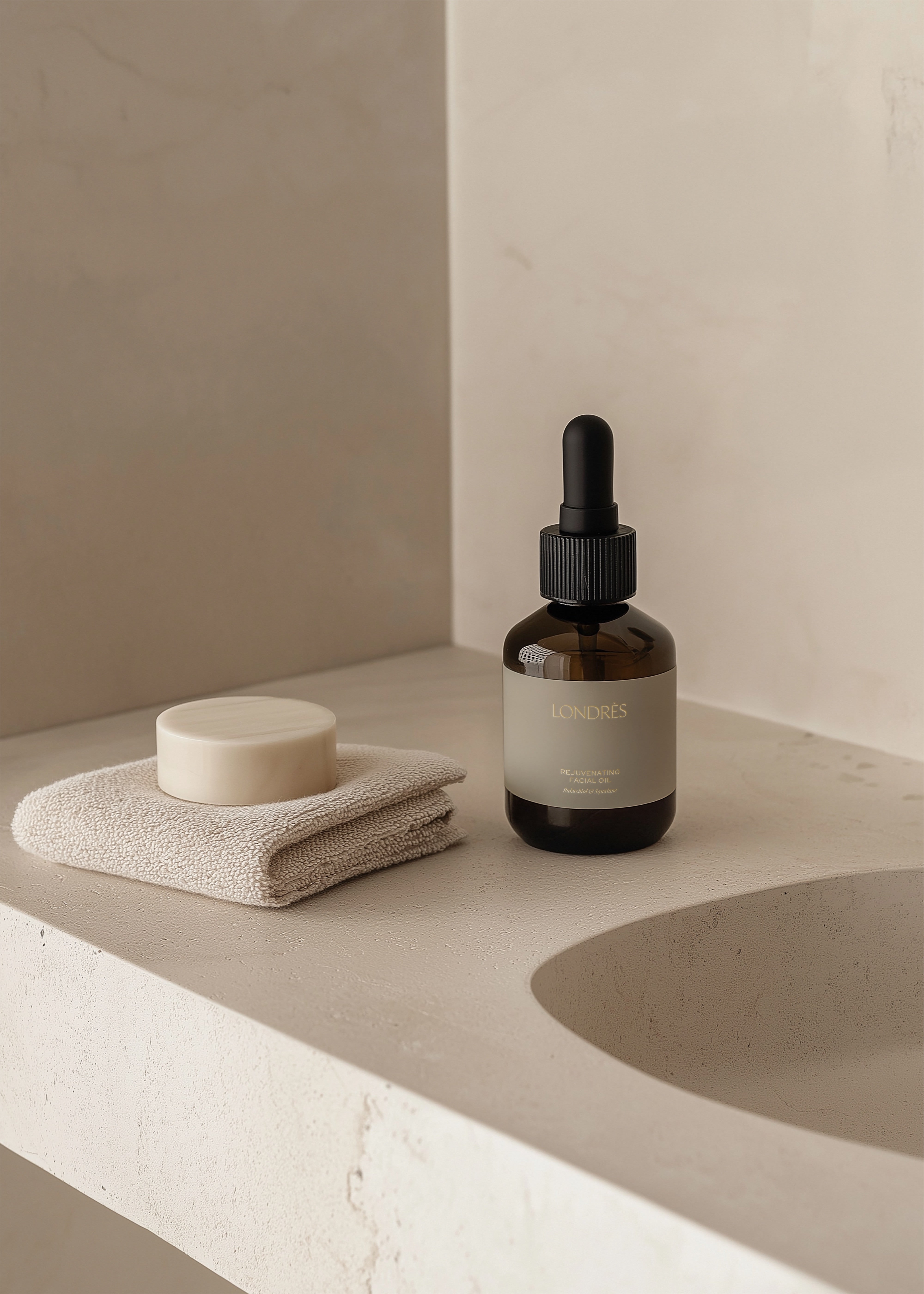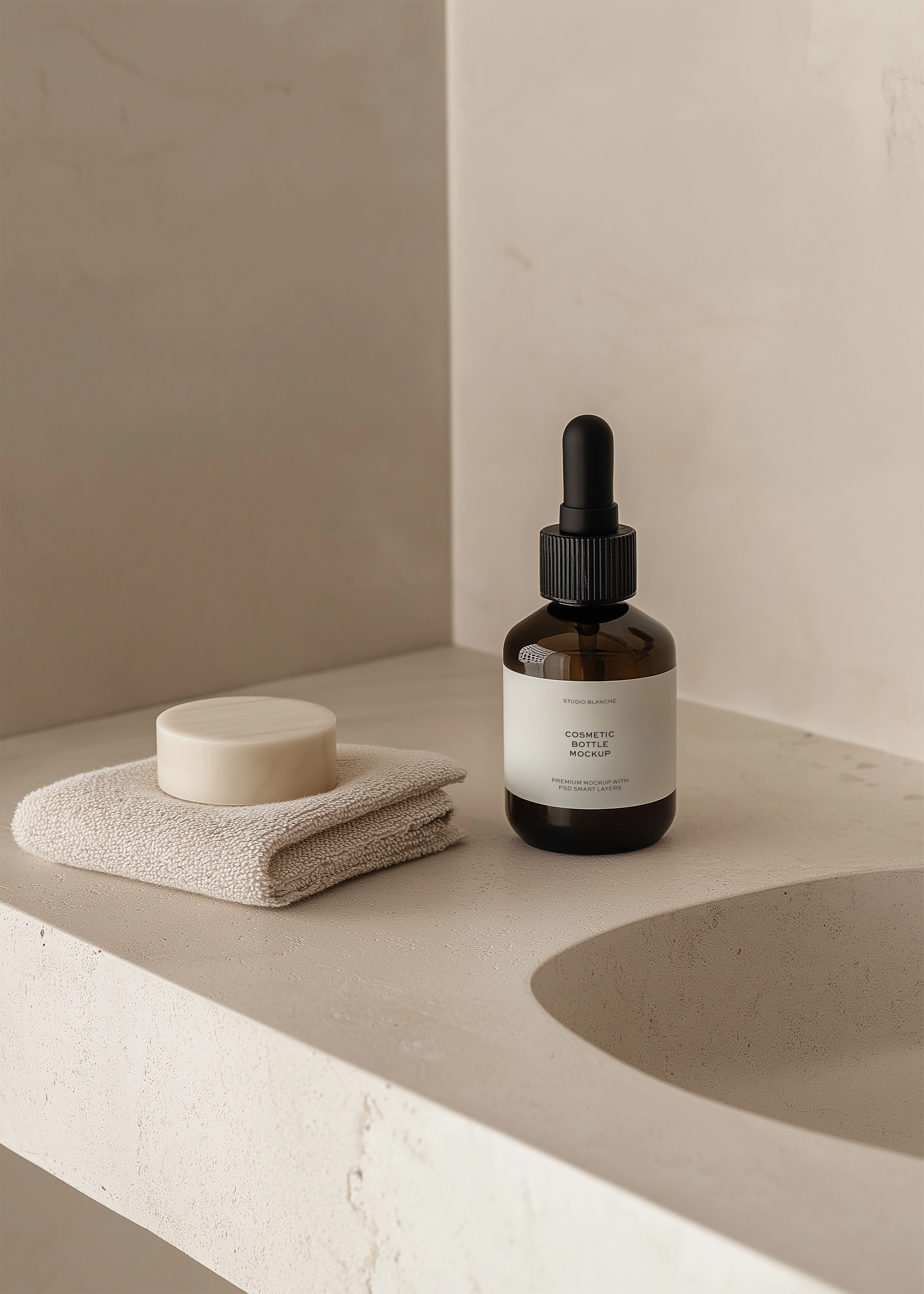 Showcase your cosmetic or skincare label designs with our Dropper Bottle Mockup, featuring a small amber glass serum bottle placed on a sleek marble sink under soft, natural light. The contemporary, luxurious setting evokes a lifestyle of indulgence and refinement, making it ideal for premium brands or designers who want to elevate their presentations. This mockup goes beyond the ordinary, allowing you to apply gold foil, blind emboss, or other premium print effects to your labels, bringing them to life with sophistication and detail.