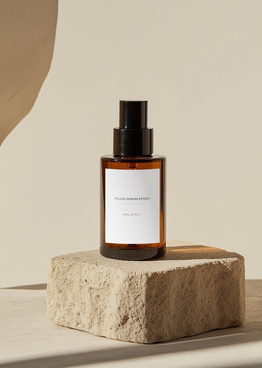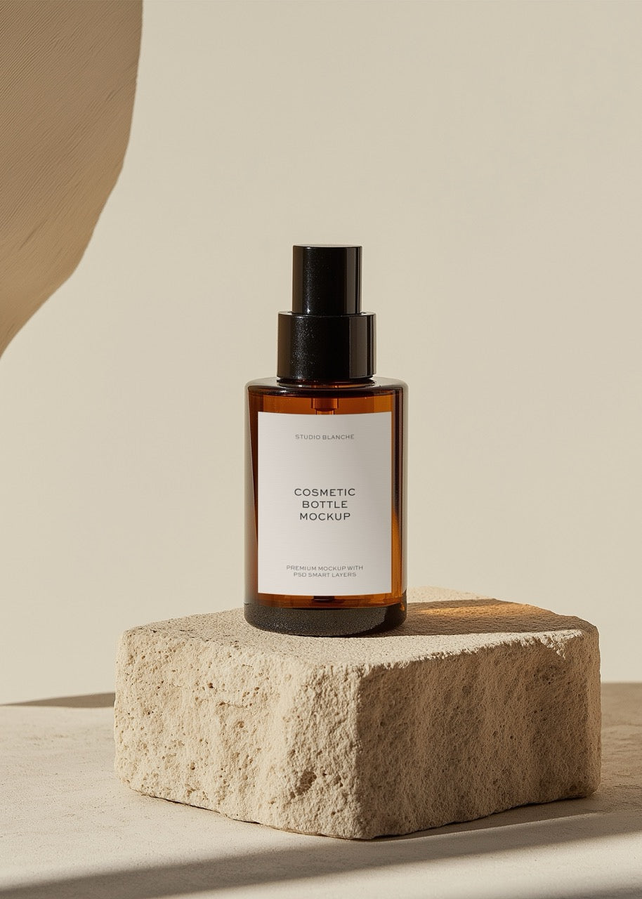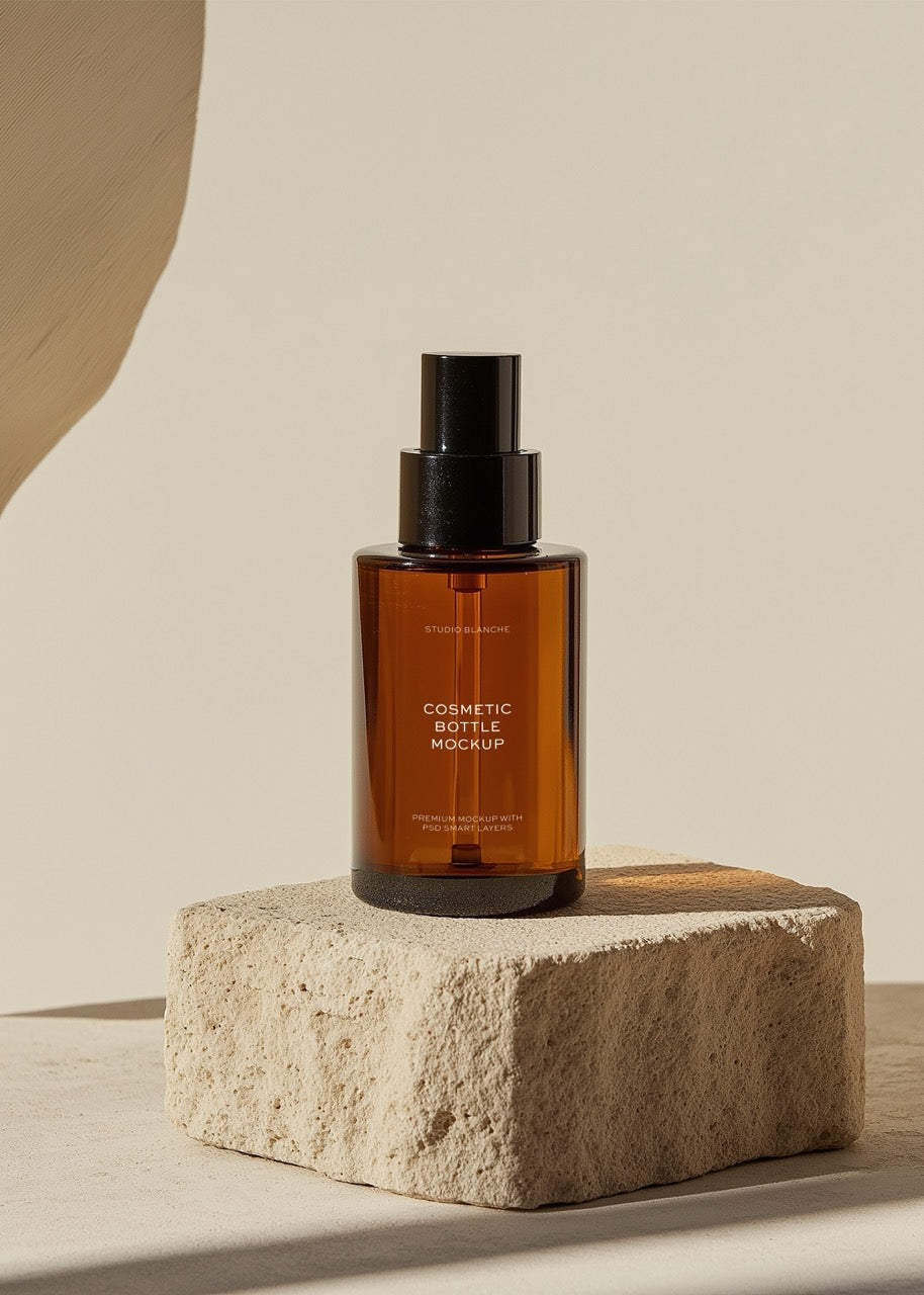This Cosmetic Glass Bottle Mockup features a sleek and elegant amber glass bottle designed specifically for cosmetic packaging. Whether you're launching a new line of skincare products or simply want to showcase your label design, this glass bottle mockup is the perfect tool to bring your vision to life. The high-resolution rendering captures every detail and provides a blank canvas for your label design, allowing you to seamlessly integrate your branding and create a captivating visual representation of your product. Transforming your ideas into reality has never been easier with this versatile and visually pleasing glass bottle mockup.
