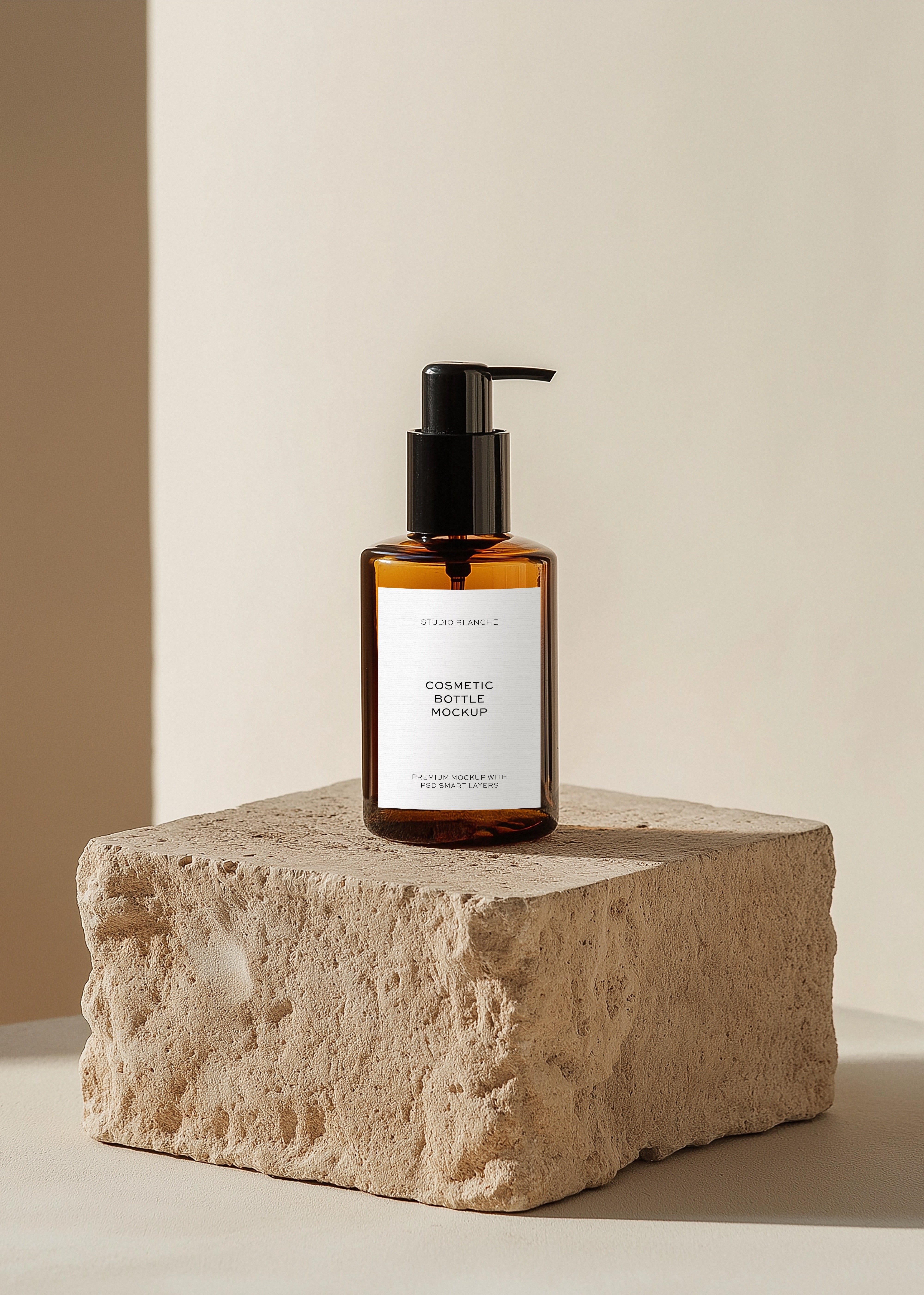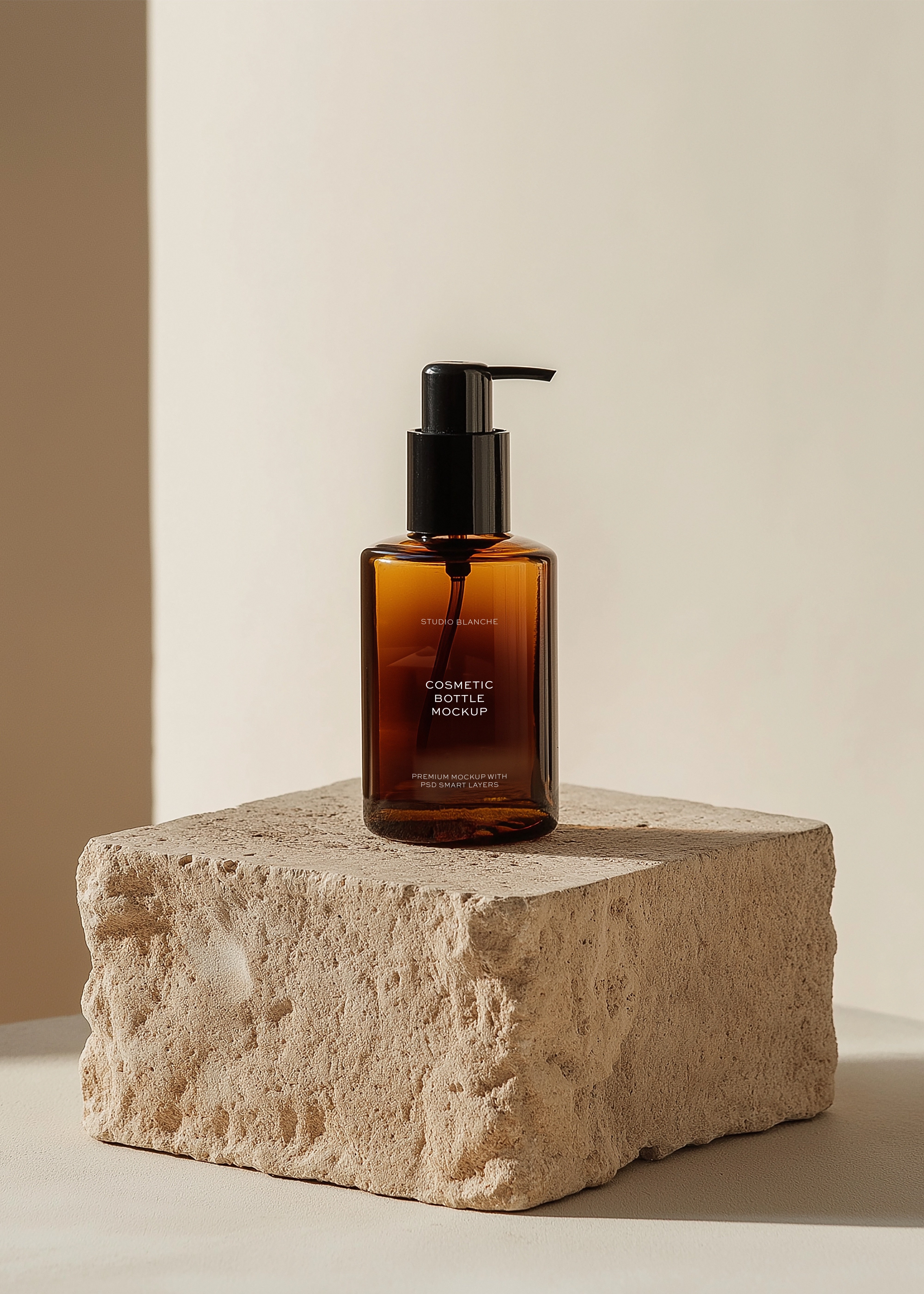 The Glass Pump Bottle Mockup features a sleek and elegant amber glass bottle designed specifically for cosmetic packaging. Whether you're launching a new line of skincare products or simply want to showcase your label design, this glass bottle mockup is the perfect tool to bring your vision to life. The high-resolution rendering captures every detail and provides a blank canvas for your label design, allowing you to seamlessly integrate your branding and create a captivating visual representation of your product. Transforming your ideas into reality has never been easier with this versatile and visually pleasing glass bottle mockup.