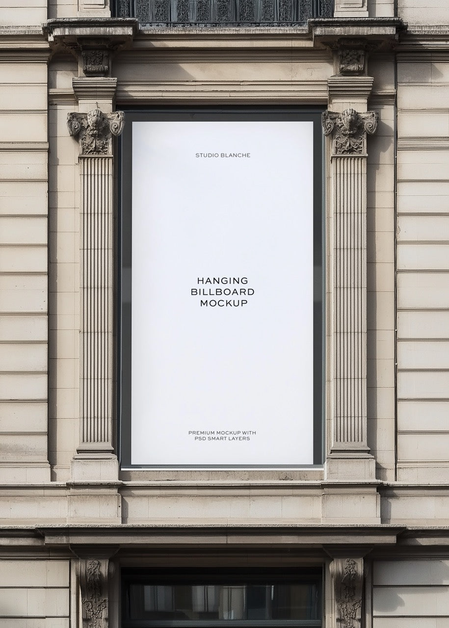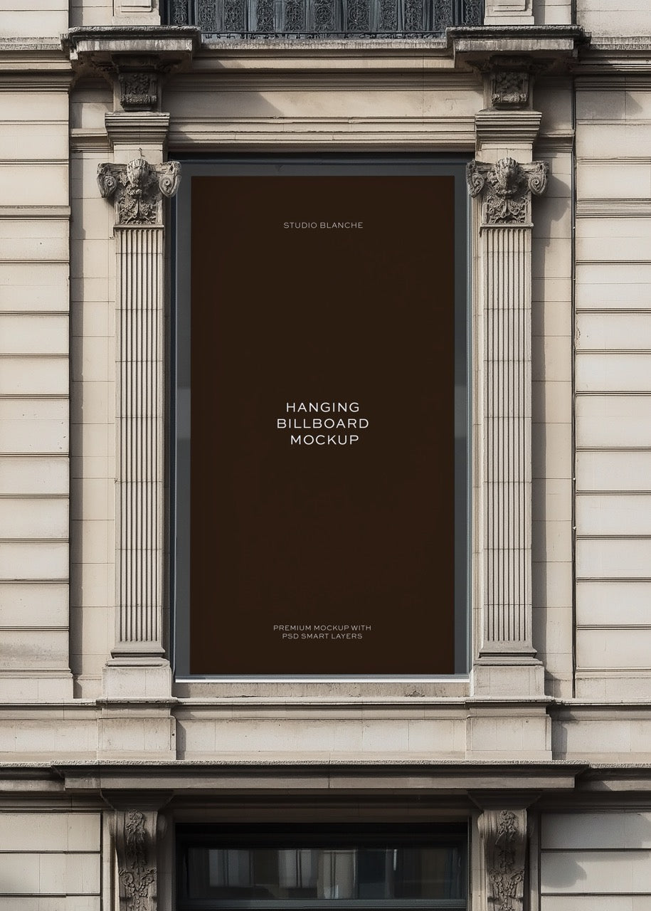 This hanging billboard mockup is designed to showcase your artwork in a realistic way. With its attention to detail, this mockup will give your poster sign a professional and polished look. This poster mockup is incredibly versatile and easy to use. Simply insert your design into the smart object layer, and voila! Your poster will look like it's hanging on a real-life billboard! This mockup is ideal for presentations, portfolio showcasing, or even pitching your ideas to clients. It's a convenient and cost-effective solution for anyone looking to add a touch of authenticity to their presentation.