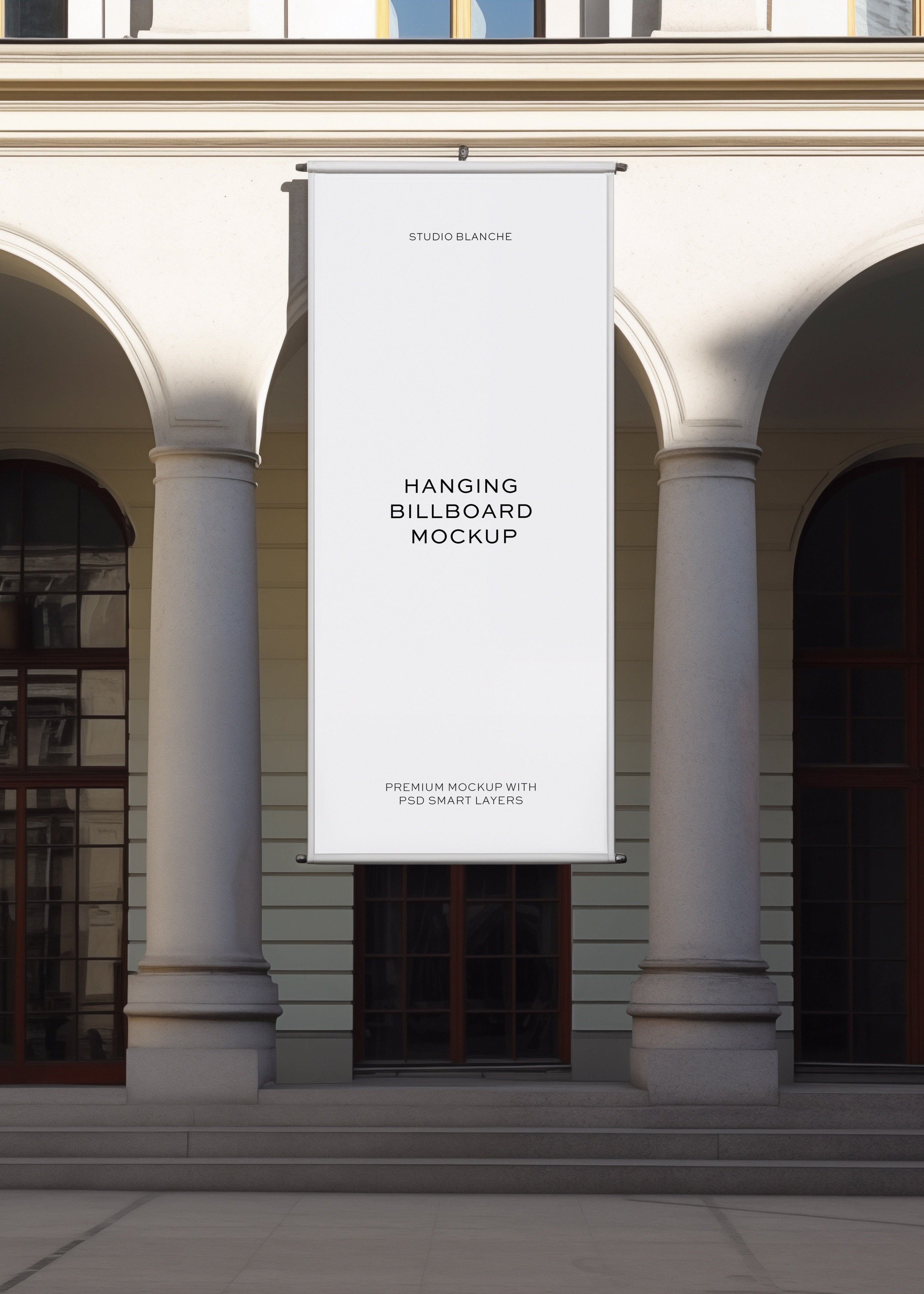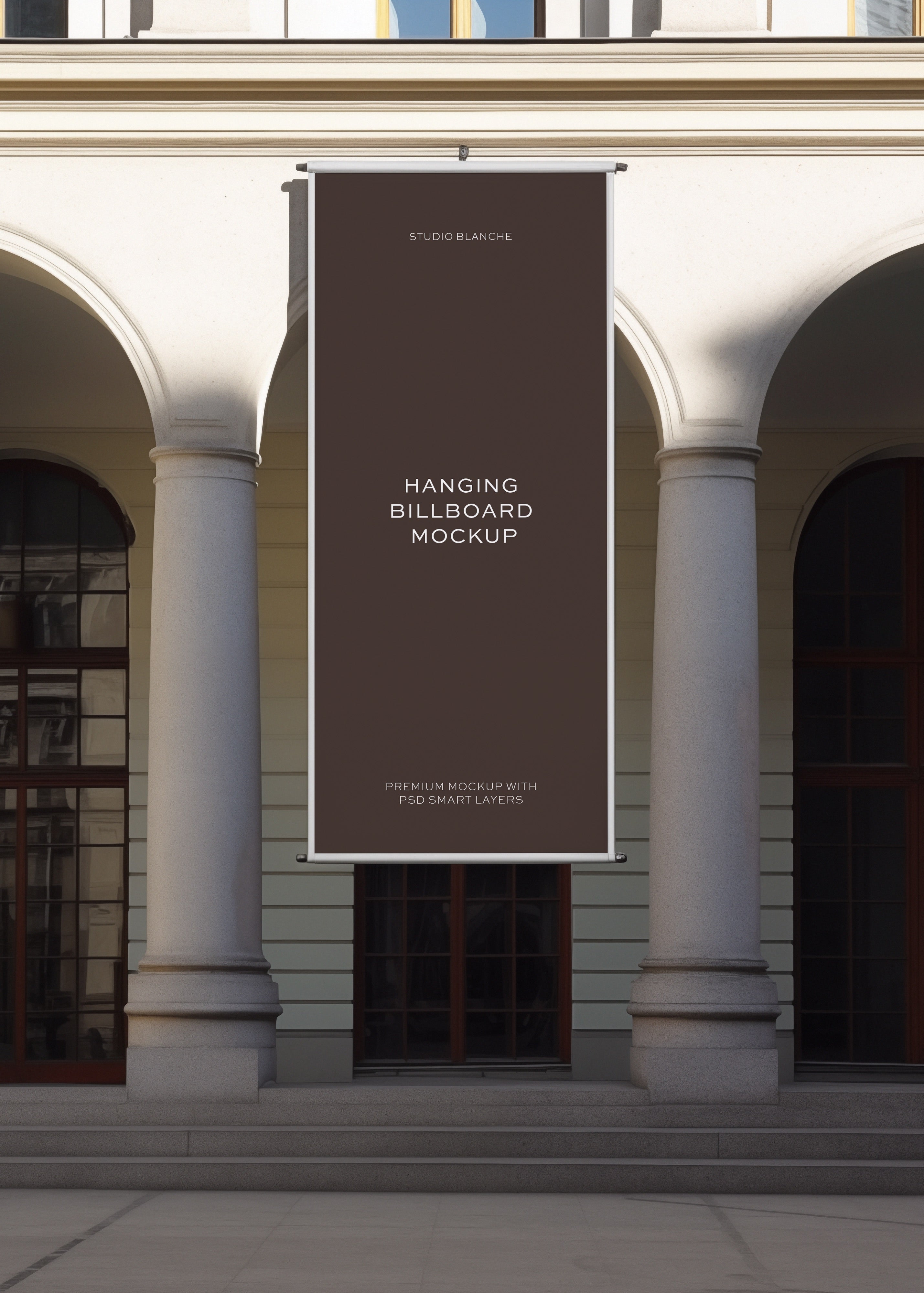 This hanging billboard mockup is designed to showcase your artwork in a realistic way. With its attention to detail, this mockup will give your poster sign a professional and polished look. This poster mockup is incredibly versatile and easy to use. Simply insert your design into the smart object layer, and voila! Your poster will look like it's hanging on a real-life billboard! This mockup is ideal for presentations, portfolio showcasing, or even pitching your ideas to clients. It's a convenient and cost-effective solution for anyone looking to add a touch of authenticity to their presentation.