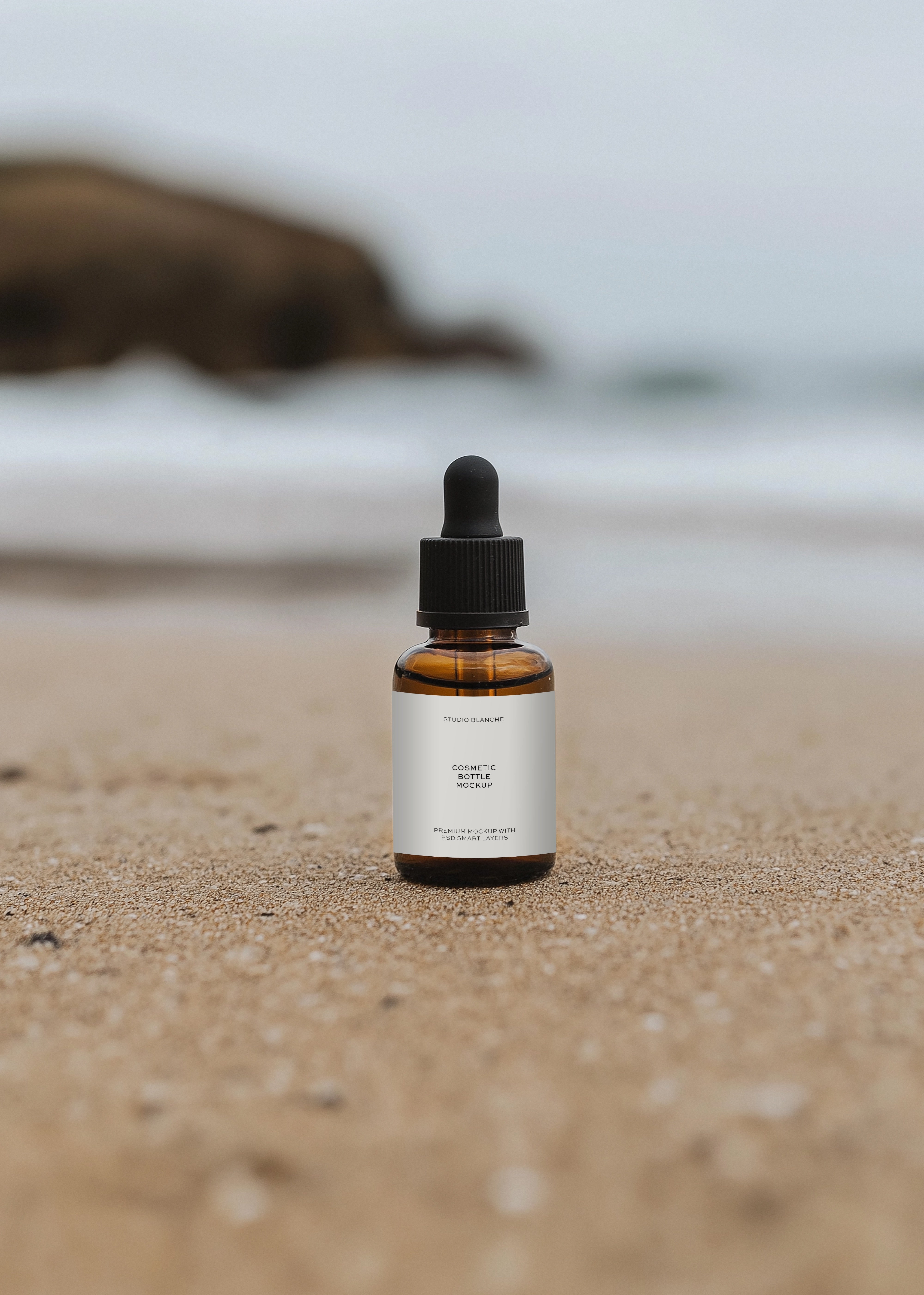 Introducing our Glass Dropper Bottle Mockup - a design inspired by the mesmerising beauty of the sea. As a part of our 'La Mer Mockup Collection', this mockup beautifully encapsulates the serene charm of the ocean. The glass dropper bottle sits on a sandy beach shore, bathed in the soft, warm light of a summer sunset. The calm ocean in the background paints a picture of tranquil seaside moments. With smart layers, you can add your distinct touch to the bottle label with embossing or debossing effects, allowing you to elevate your designs.