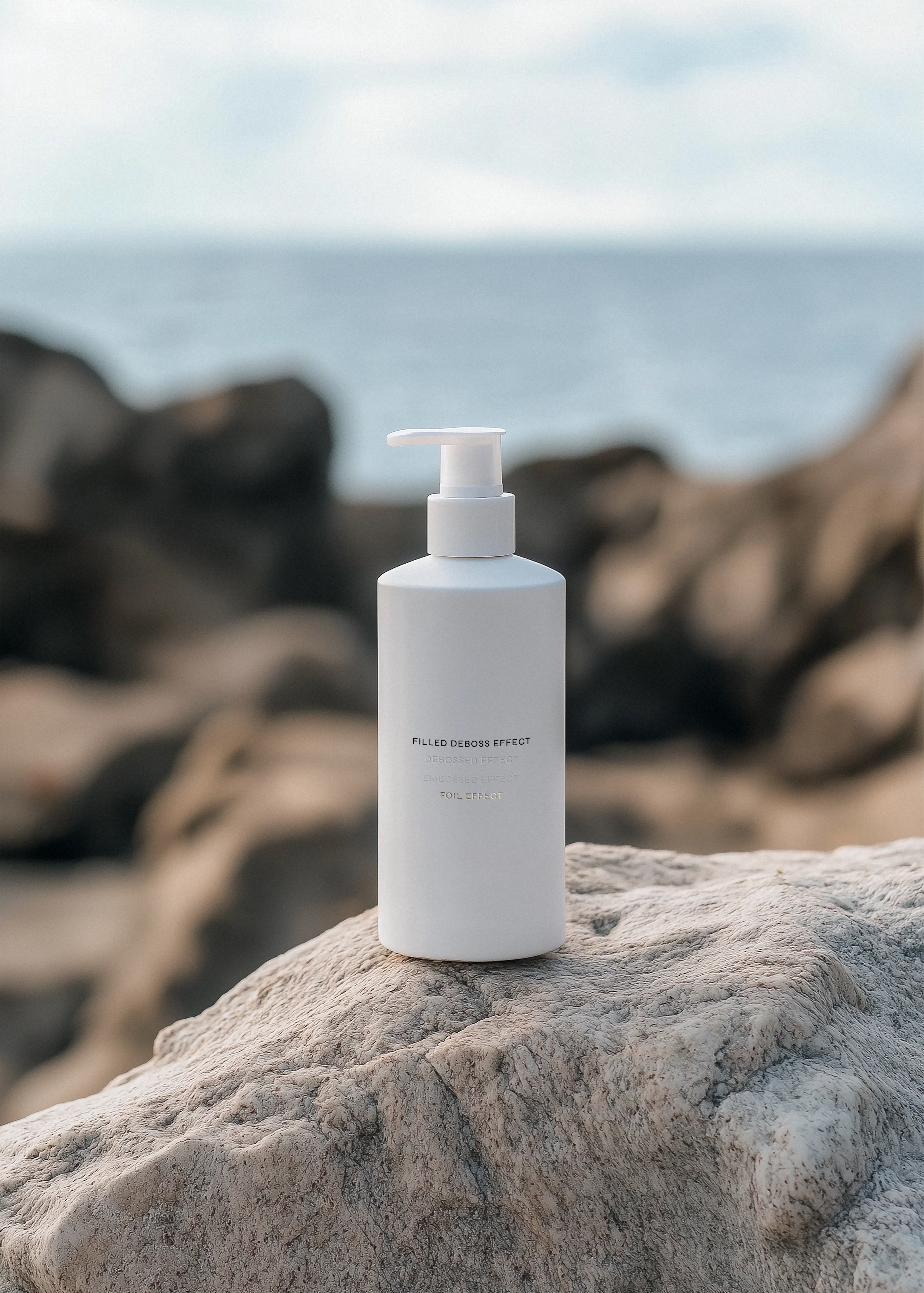 Dive into tranquility with our Cosmetic Pump Bottle Mockup - a part of our La Mer Mockup Collection. This mockup is a reflection of an idyllic summer's day by the sea, beautifully embodied in its design. With smart layers, you can personalise the bottle with your choice of embossing or debossing effects. It's a unique chance to elevate your product presentations with the serene beauty of the ocean.