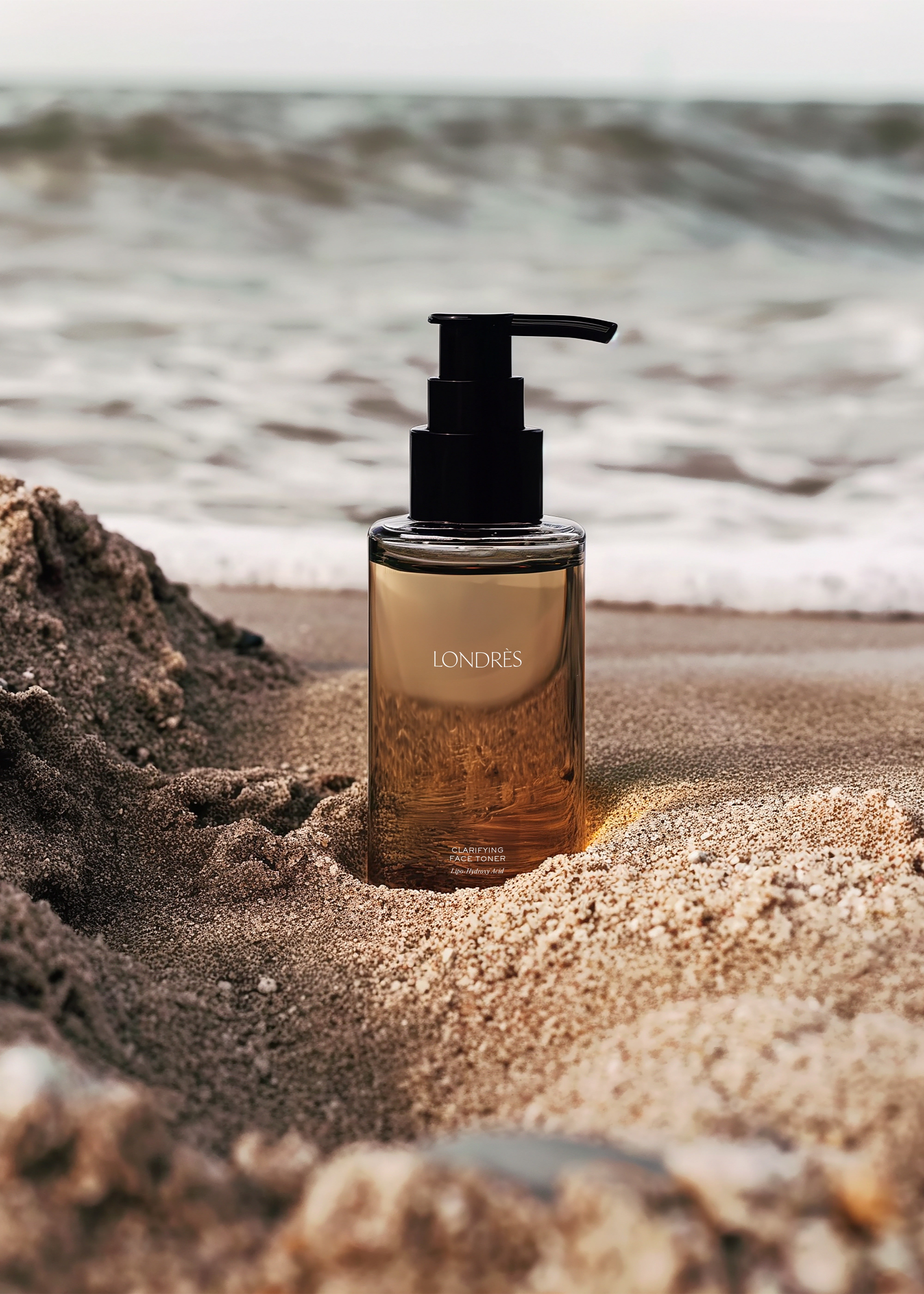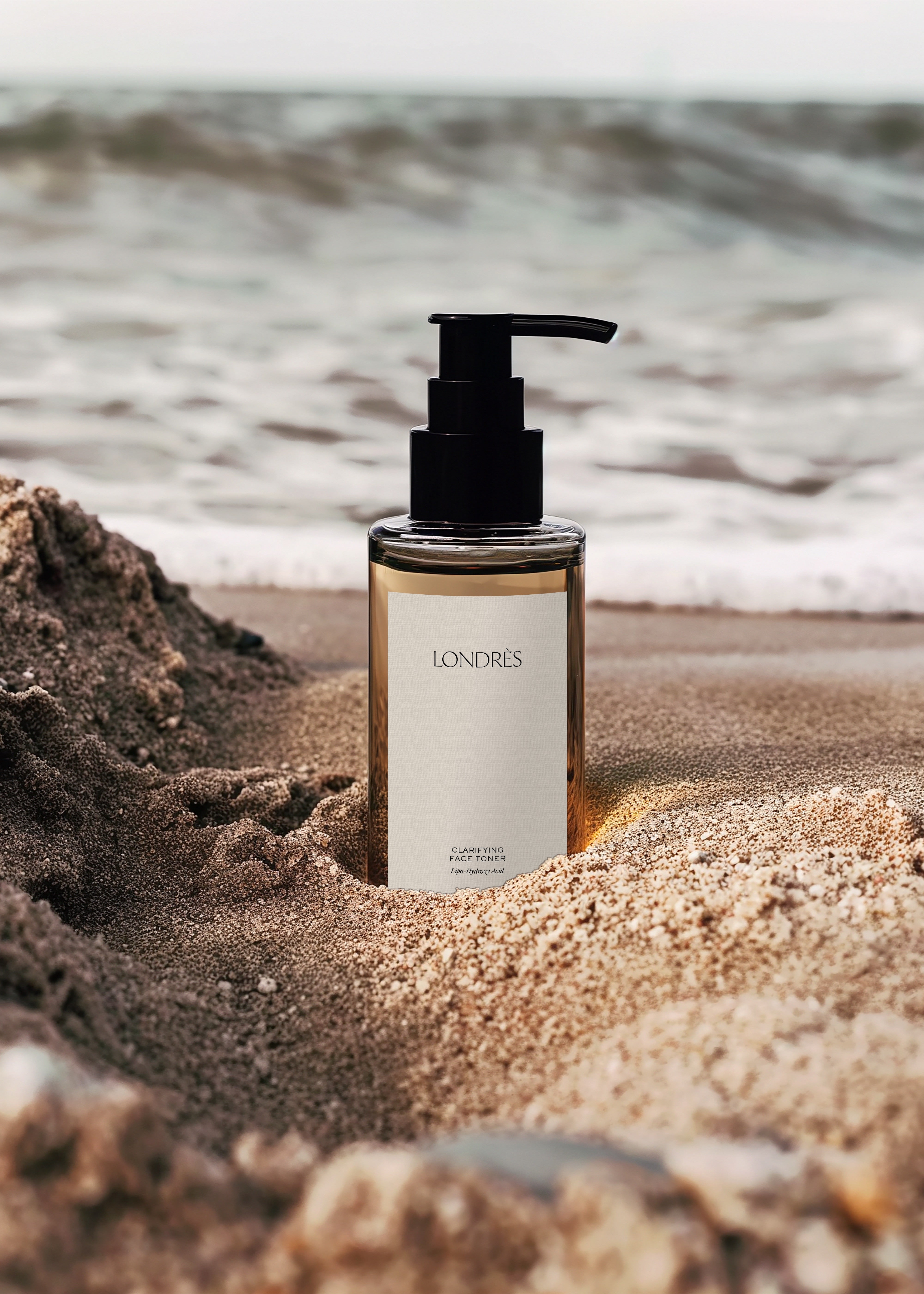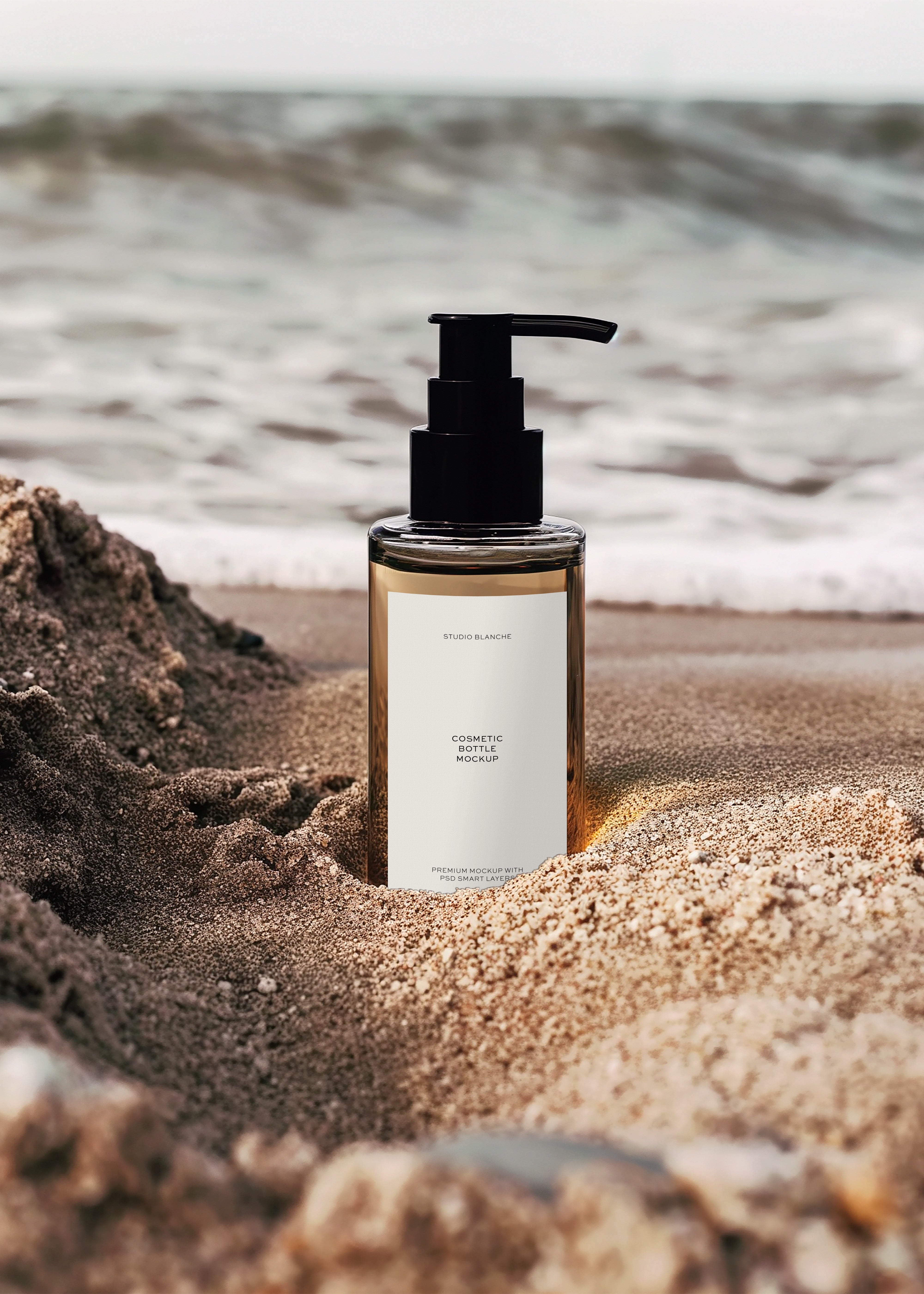 Introducing our Glass Pump Bottle Mockup - a design inspired by the mesmerising beauty of the sea. As a part of our 'La Mer Mockup Collection', this mockup beautifully encapsulates the serene charm of the ocean. The glass pump bottle sits on a sandy beach shore, bathed in the soft, warm light of a summer sunset. The calm ocean in the background paints a picture of tranquil seaside moments. With smart layers, you can add your distinct touch to the bottle label with embossing or debossing effects, allowing you to elevate your designs.