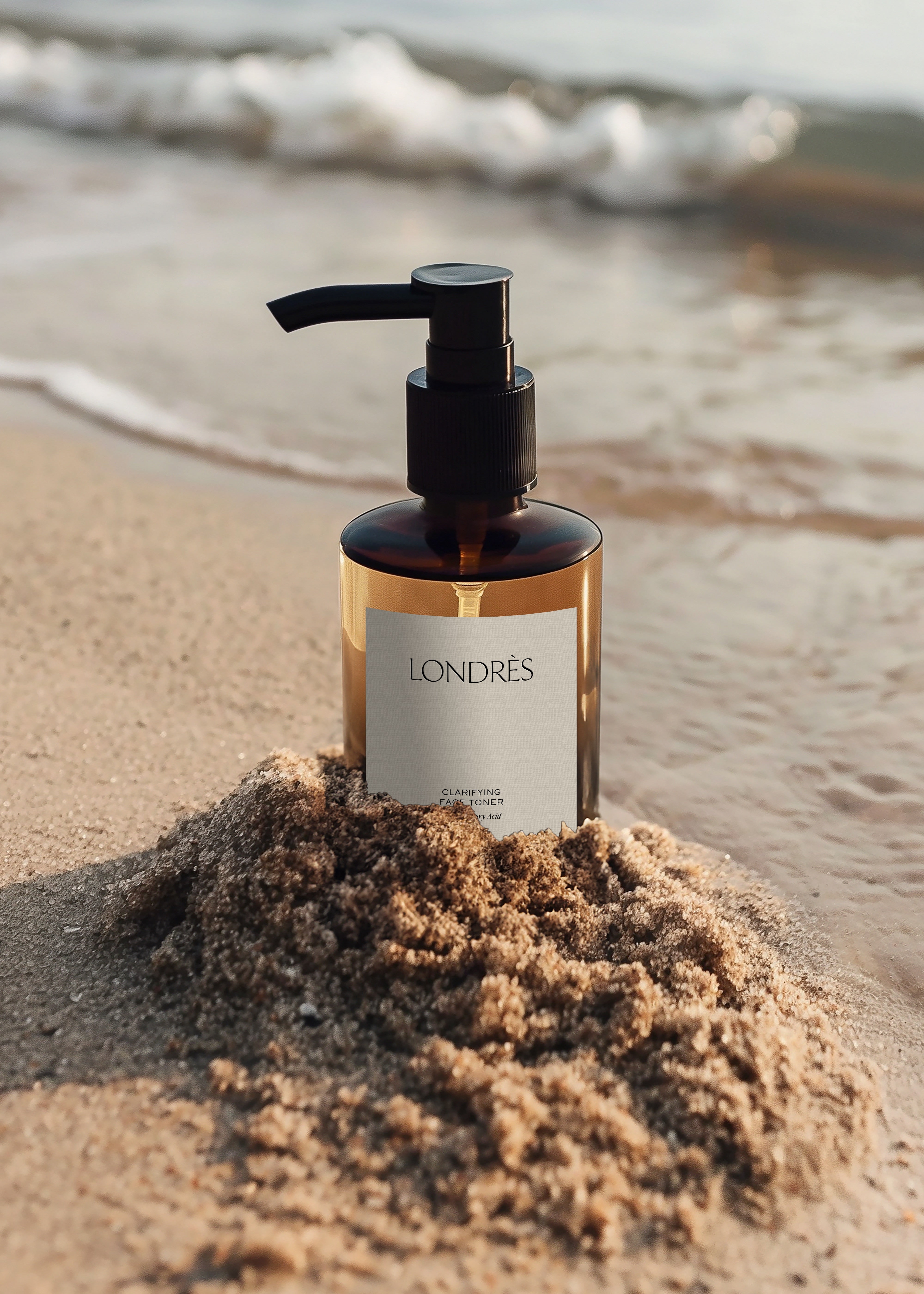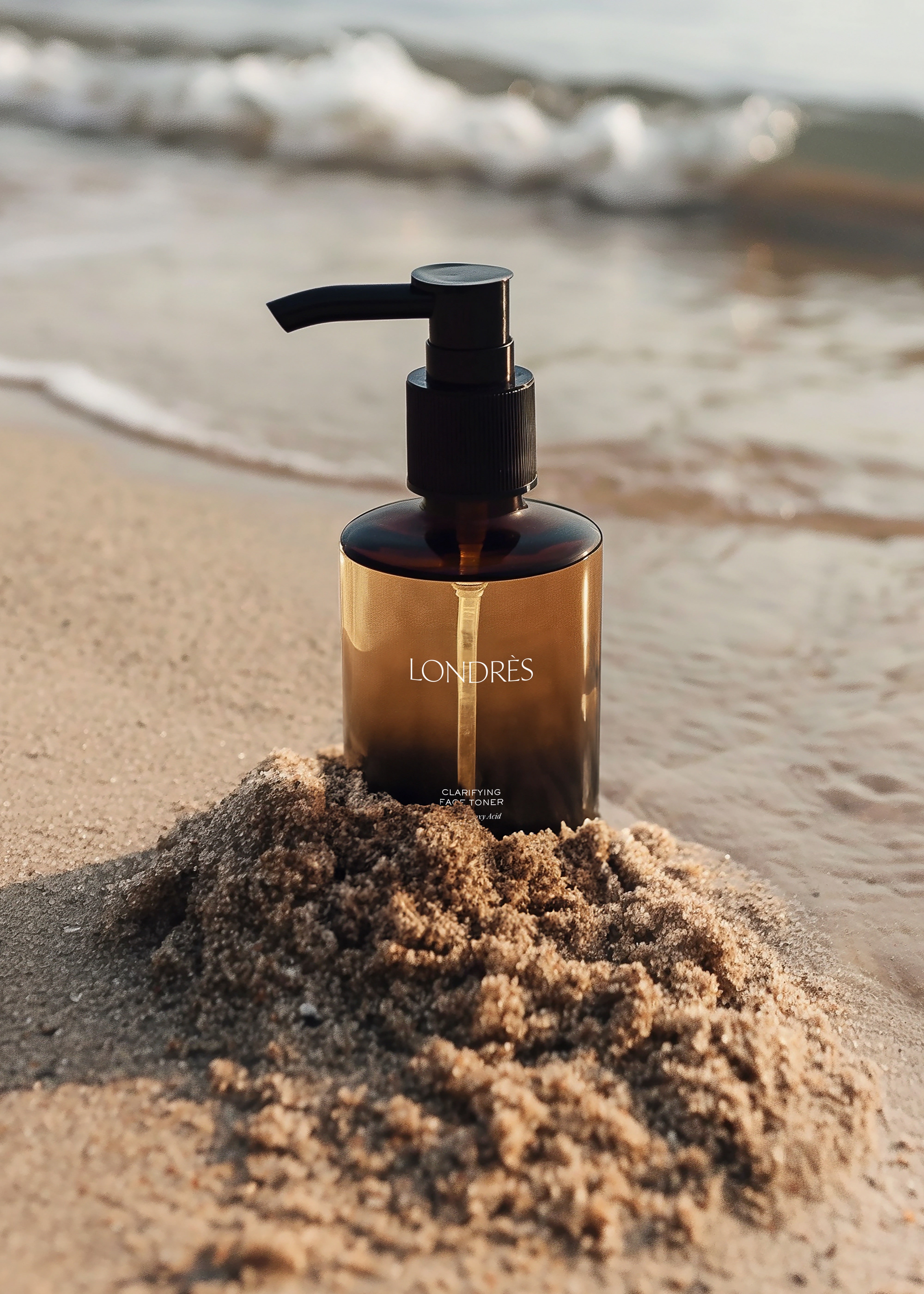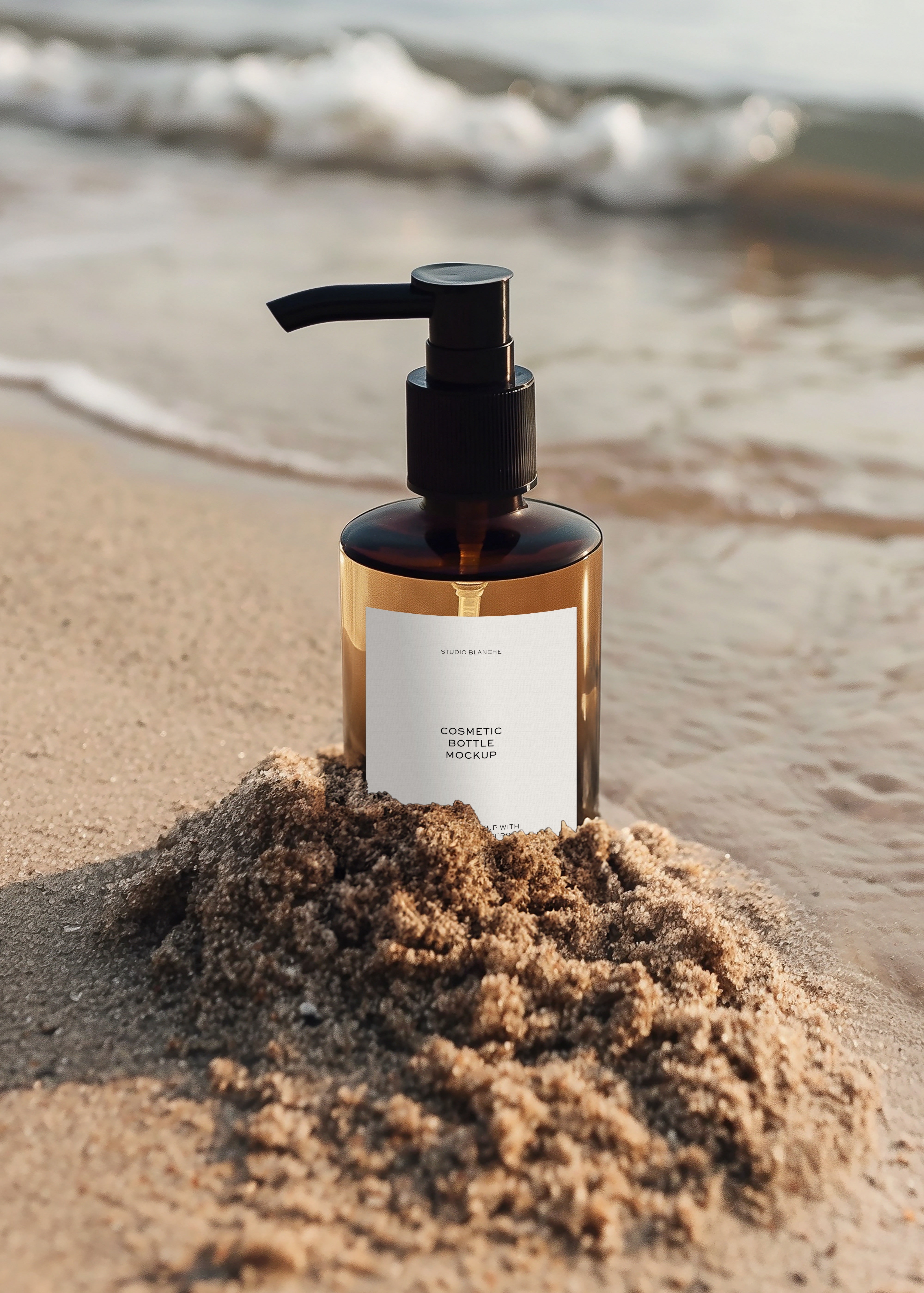Introducing our Glass Pump Bottle Mockup - a design inspired by the mesmerising beauty of the sea. As a part of our 'La Mer Mockup Collection', this mockup beautifully encapsulates the serene charm of the ocean. The glass pump bottle sits on a sandy beach shore, bathed in the soft, warm light of a summer sunset. The calm ocean in the background paints a picture of tranquil seaside moments. With smart layers, you can add your distinct touch to the bottle label with embossing or debossing effects, allowing you to elevate your designs.