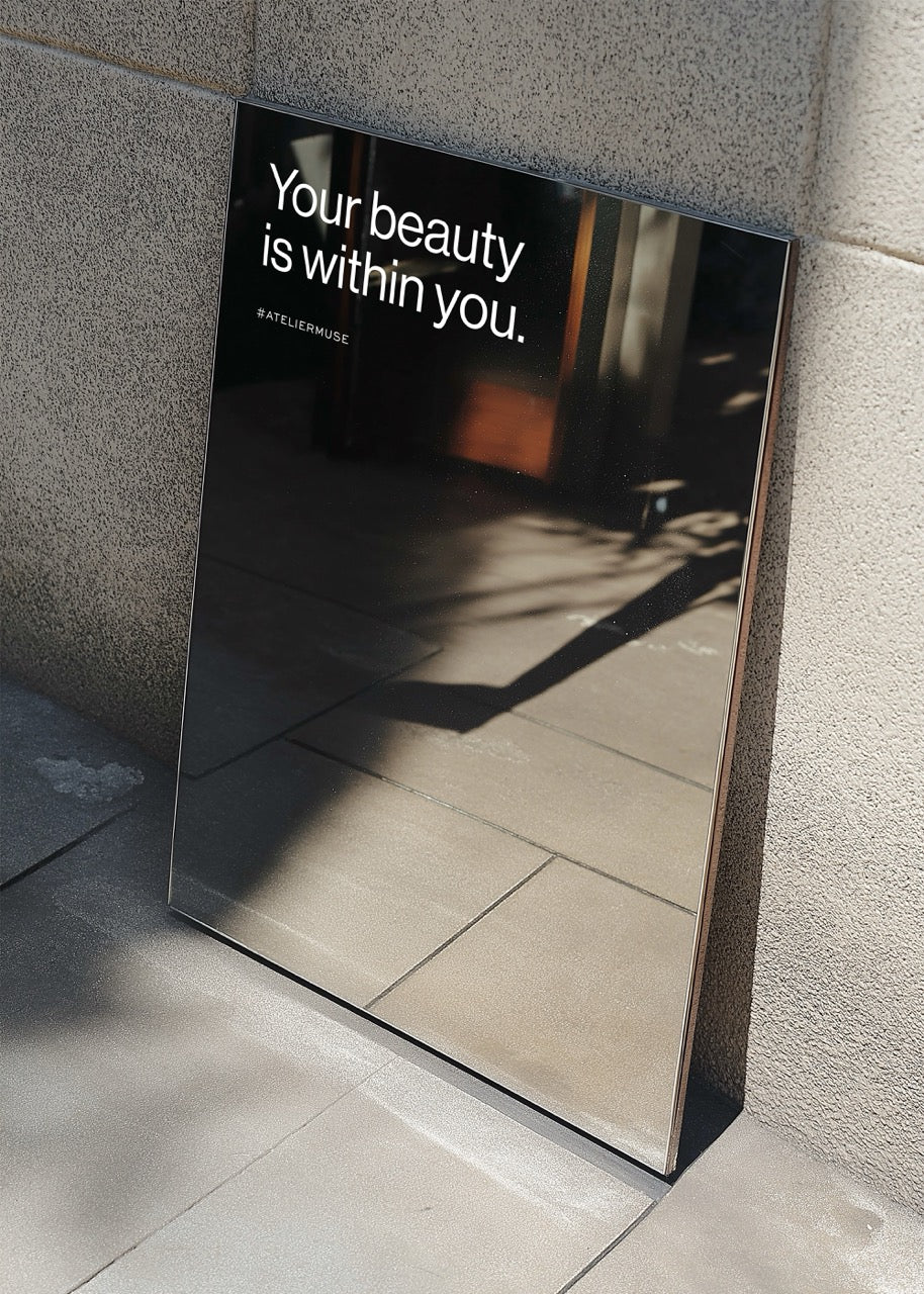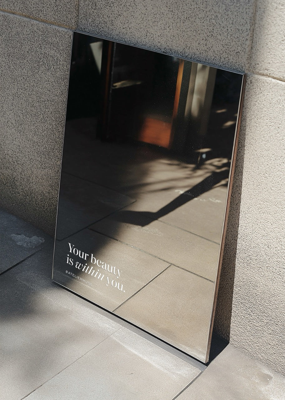 Meet our Mirror Sign Mockup, an elegant and realistic template designed with a keen eye for detail. This high-quality mockup is a game-changer for all brand designers looking to showcase their creative projects in a realistic way. The template evokes a minimal aesthetic, beautifully balancing simplicity with sophistication, it's the ideal canvas for your branding projects, providing a realistic backdrop. The realistic setting, combined with the minimal aesthetic, makes it perfect for brand designers who want to present their work in a way that is both convincing and aesthetically pleasing.