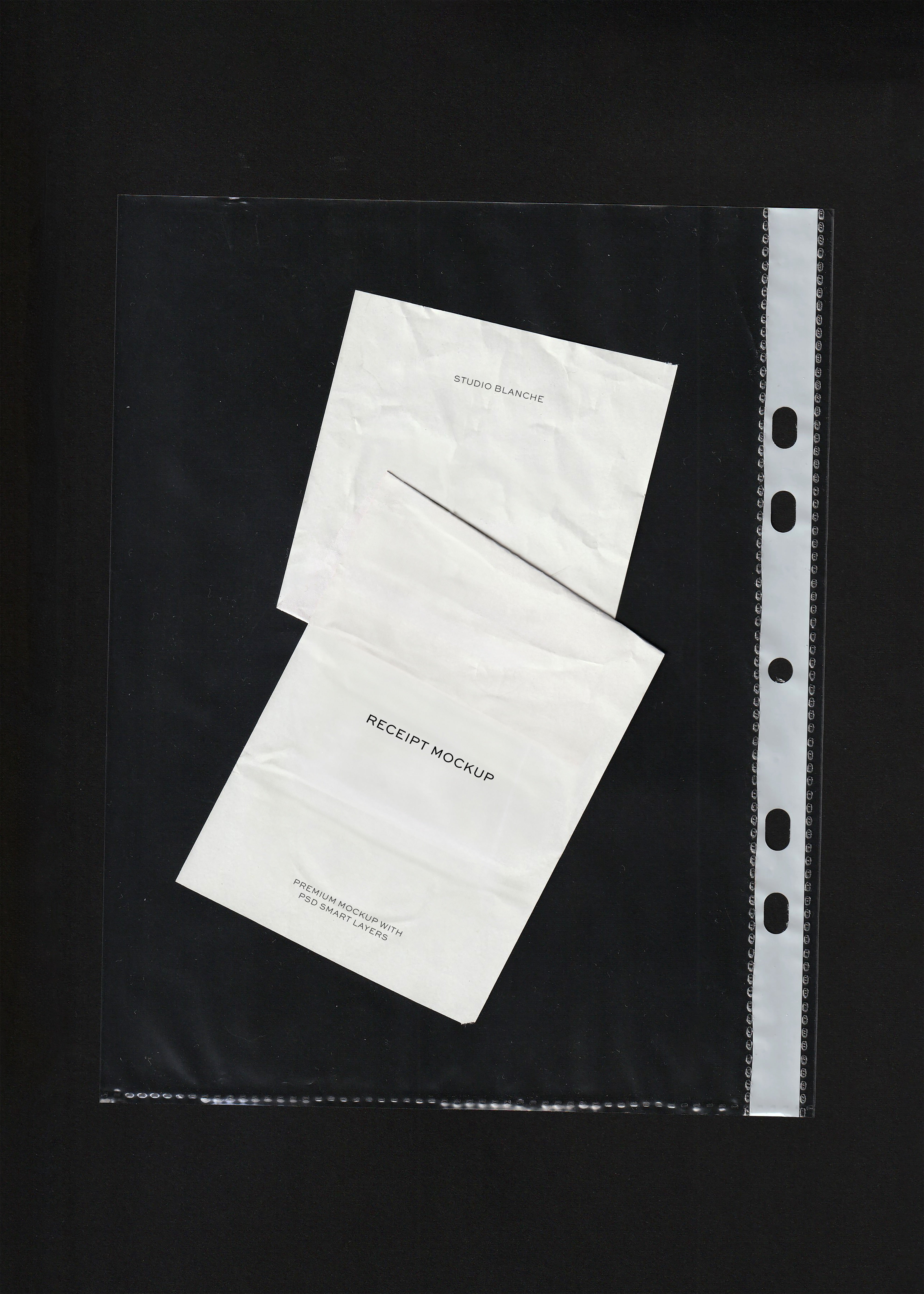 Showcase your designs with authenticity and style using the Receipt Mockup, a one-of-a-kind mockup that adds a realistic, tactile element to your presentations. Designed with incredible attention to detail, this mockup features a folded receipt placed inside a transparent, scanned plastic punched pocket, creating a visually striking and professional way to display your work. Ideal for graphic designers, branding experts, and creatives, this mockup is perfect for presenting restaurant receipts, retail branding concepts, or transactional designs to clients, or for elevating your portfolio with a touch of realism.
