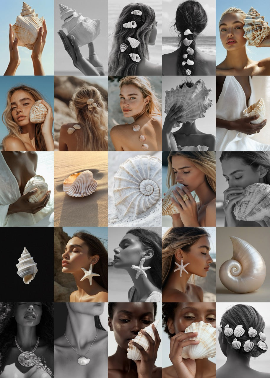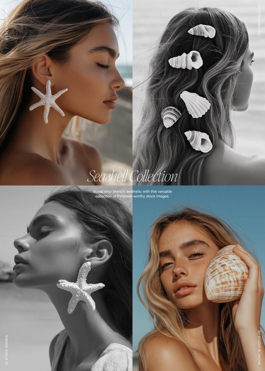 Our Seashell Collection was curated to evoke the spirit of sun-kissed beachy summer days. This collection is an ode to the timeless beauty of the sea, encapsulating the ephemeral charm of seashells through a series of aesthetic images. Our Seashell Collection offers a variety of high-resolution images that will transport you directly to the coast. It features a variety of stunning visuals, from women cradling shells on sandy beaches to editorial-style seashell imagery that's as captivating as it is unique. Each image in this collection has been carefully selected and edited to ensure it aligns with the aesthetic appeal that Pinterest users adore. It's a truly versatile collection that can elevate any project or brand.