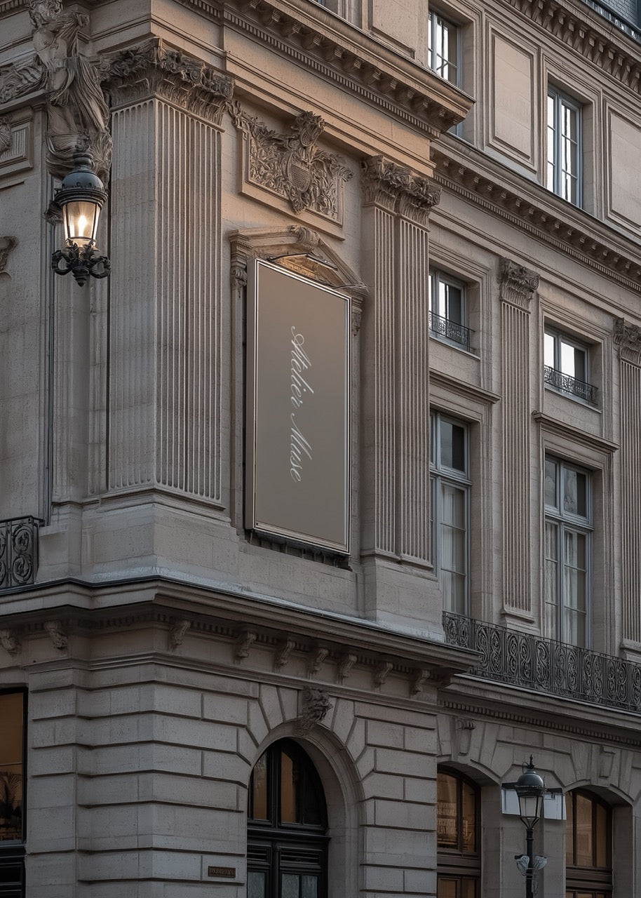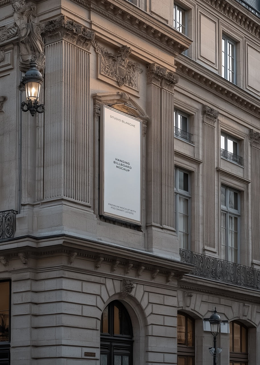 Step into the world of luxury with this chic Parisian street hanging billboard mockup. Featuring a glamorous urban setting, this mockup is tailored for brands seeking to make a bold statement. The stunning Paris backdrop enhances your designs and creates a premium, high-end feel. Perfect for showcasing luxury goods, fashion collections, or premium services, this mockup ensures your branding stands out.