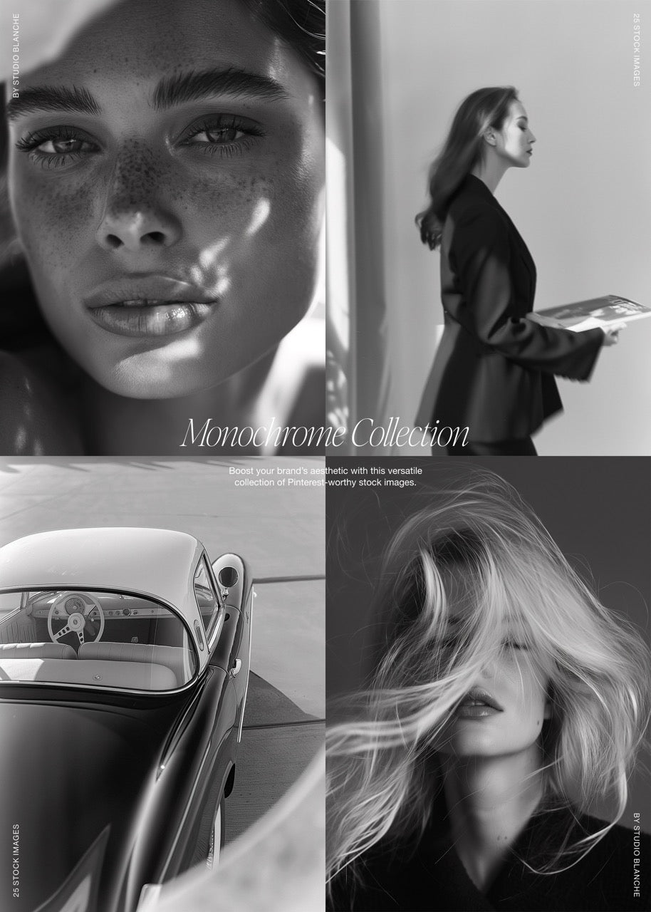 This compelling collection of black and white stock images was designed to add a timeless touch to your brand or project. The collection includes emotive portraits, captivating lifestyle imagery, and stunning close ups, all wrapped up in a striking monochrome palette. Each image in our collection is Pinterest-worthy, crafted to enhance your aesthetic and engage your audience. Whether you're creating social media content, or working on graphic design projects, these high-quality images are your ticket to a stylish, monochrome world.