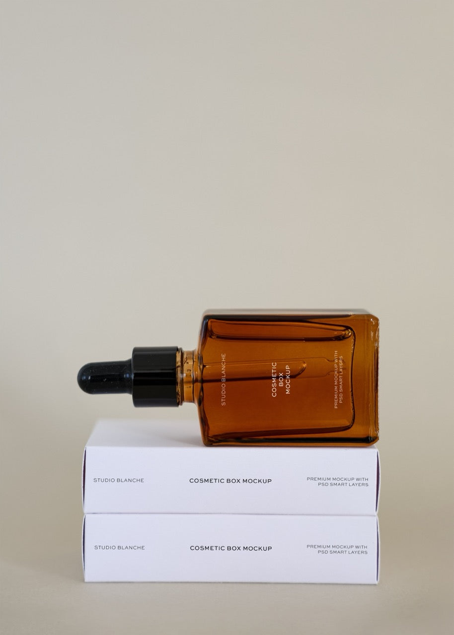 Elevate your beauty brand presentation with this sophisticated amber glass dropper bottle mockup paired with sleek cosmetic boxes, set against a pristine neutral backdrop. Perfect for showcasing serums, essential oils, or luxury skincare products, this premium mockup allows you to create professional product visuals without the expense of photography. The warm amber glass conveys quality and protects light-sensitive formulations, whilst the coordinating packaging boxes demonstrate your complete brand experience.