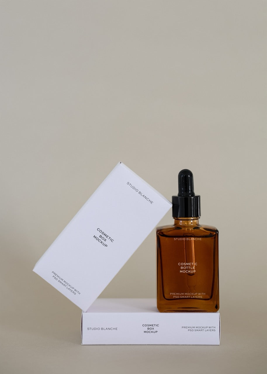 Establish your beauty brand's premium positioning with this sophisticated mockup featuring an amber glass dropper bottle paired with two stylish cosmetic boxes on a refined neutral background. The warm amber glass signals quality ingredients and thoughtful formulation, whilst the dual box presentation offers flexibility to display different sizes, scents, or product types simultaneously. This professional mockup provides the visual credibility that transforms casual browsers into committed customers without the investment of traditional product photography.