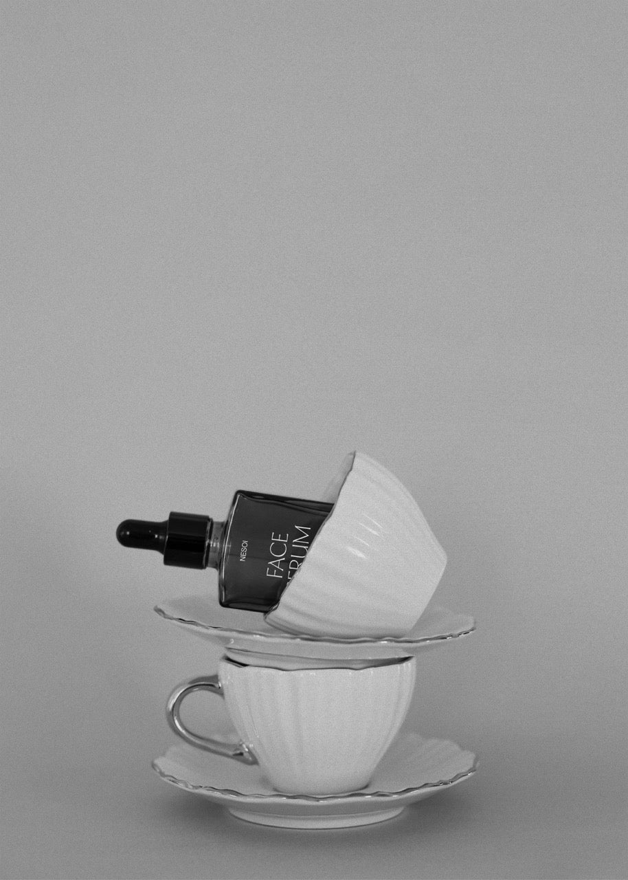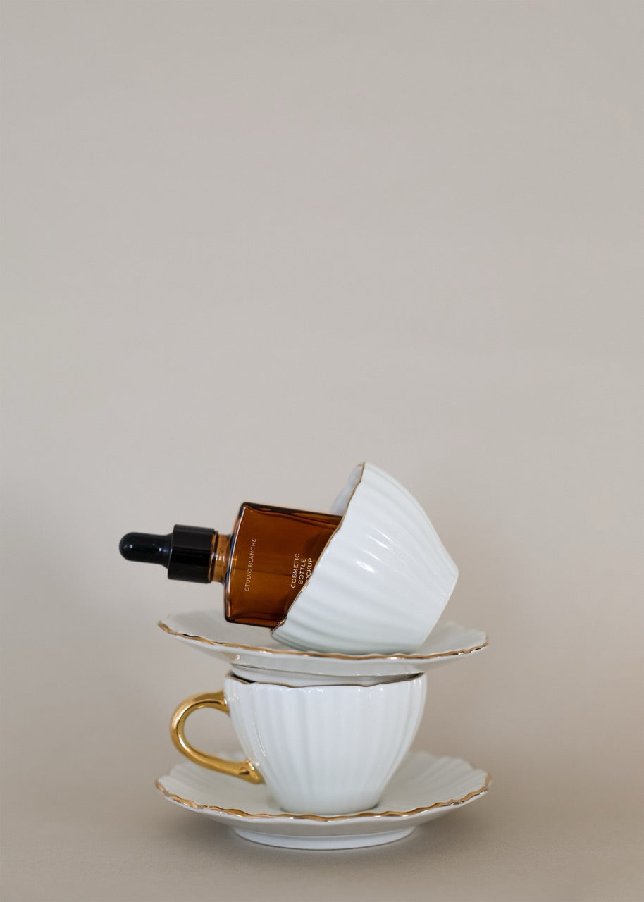Differentiate your beauty brand with this imaginative amber glass dropper bottle mockup, creatively staged within two elegant teacups against a calming neutral background that enhances rather than overwhelms. The amber glass maintains professional credibility and ingredient protection, whilst the double teacup arrangement creates visual intrigue and suggests shared beauty rituals or morning-evening routines. This unique mockup helps you craft distinctive marketing materials that capture attention on crowded social feeds and create the memorable brand moments that foster customer loyalty.