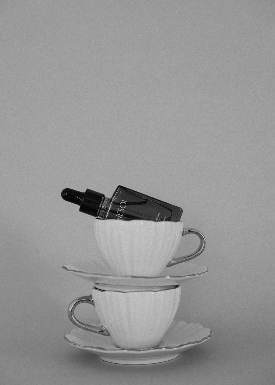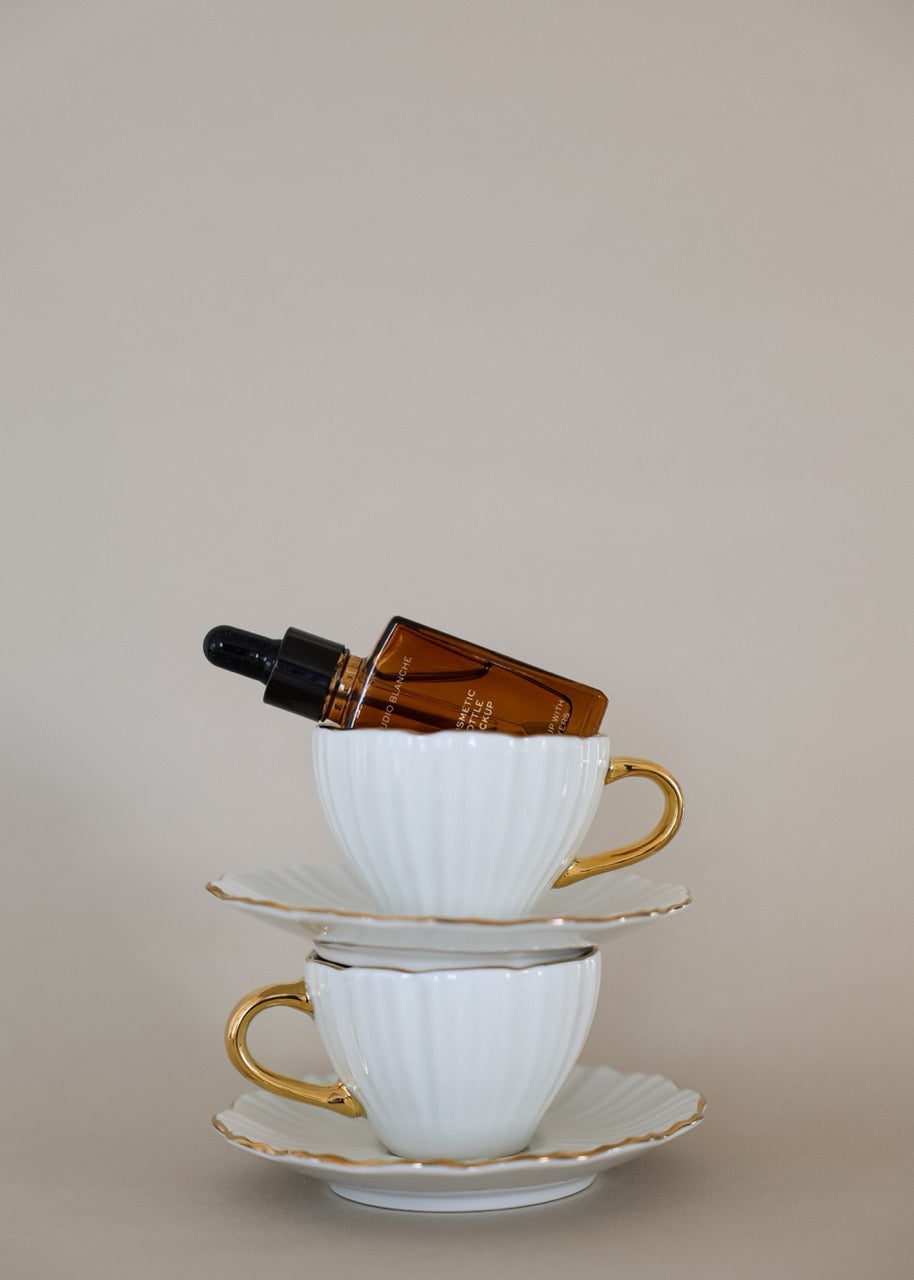 Elevate your beauty brand storytelling with this artfully composed amber glass dropper bottle mockup, thoughtfully arranged within two refined teacups on a sophisticated neutral backdrop. The protective amber glass establishes formulation quality and ingredient integrity, whilst the elegant teacup staging introduces lifestyle aspiration and self-care narrative that resonates emotionally with buyers. This memorable mockup provides the visual differentiation that helps emerging beauty brands establish identity and capture market share in competitive categories.