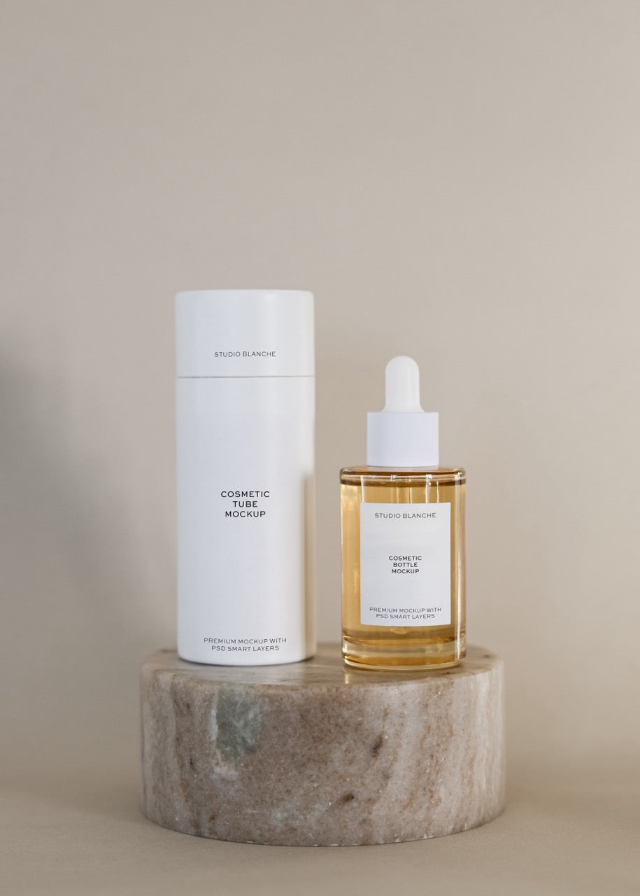 Expand your product presentation possibilities with this versatile mockup pairing a sleek dropper bottle with a complementary cosmetic tube, both showcased against a clean neutral backdrop that accommodates any brand palette. The dropper format suggests concentrated serums or precision treatments, whilst the tube indicates creams, cleansers, or supplementary products, together communicating a comprehensive approach to skincare that encourages basket-building. This practical mockup enables you to visualise your complete product range professionally and persuasively, accelerating design decisions and customer conversion.