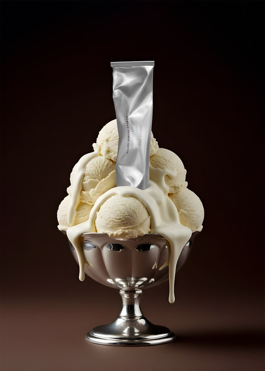 Make a show-stopping impression with this gloriously over-the-top mockup that presents your silver cosmetic tube atop a vintage ice cream sundae glass overflowing with vanilla scoops and cascading cream. The theatrical composition exudes pure indulgence and playful luxury, perfect for beauty brands that aren't afraid to be bold and memorable. This deliciously decadent styling transforms your product into the cherry on top of every beauty lover's collection.