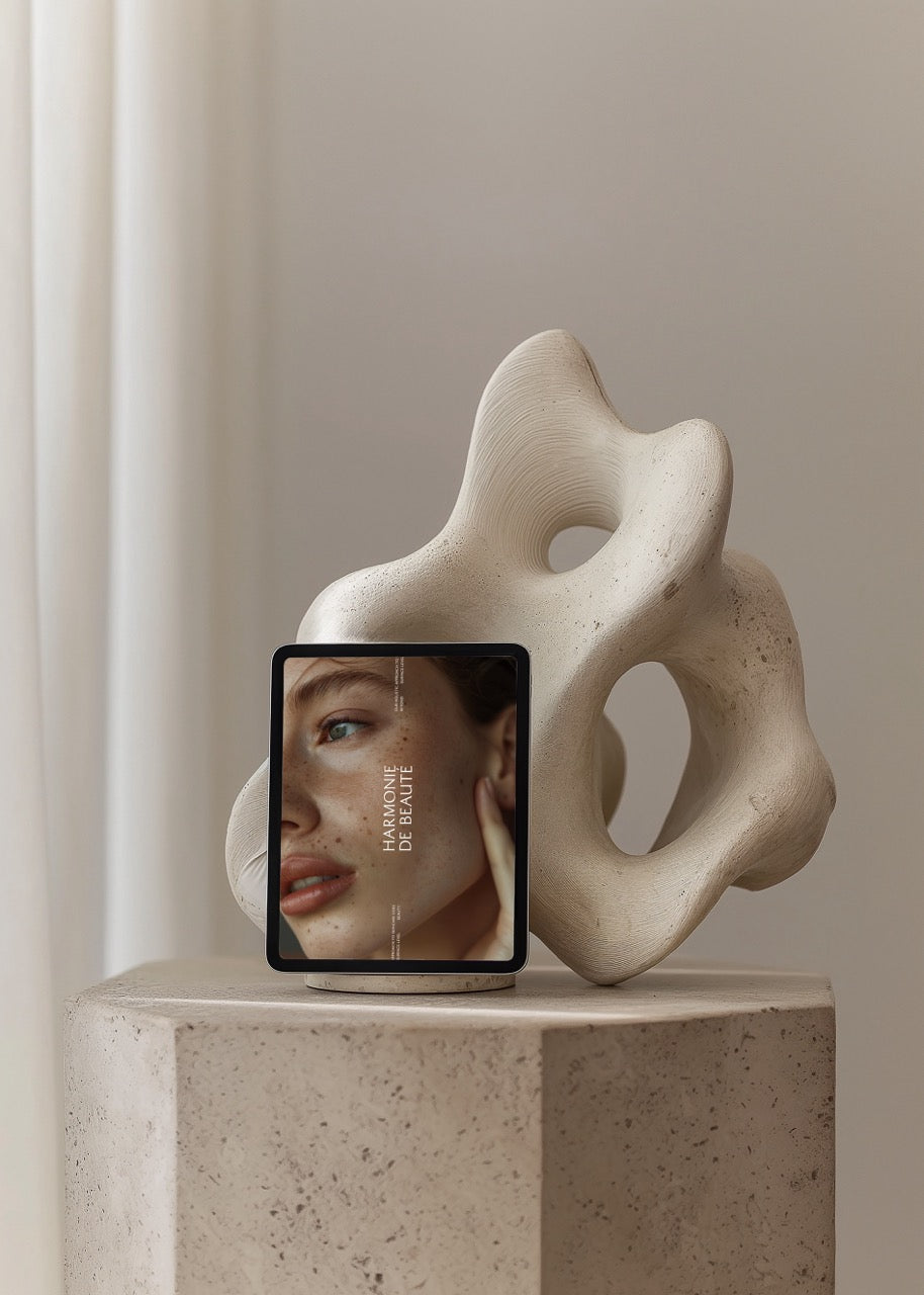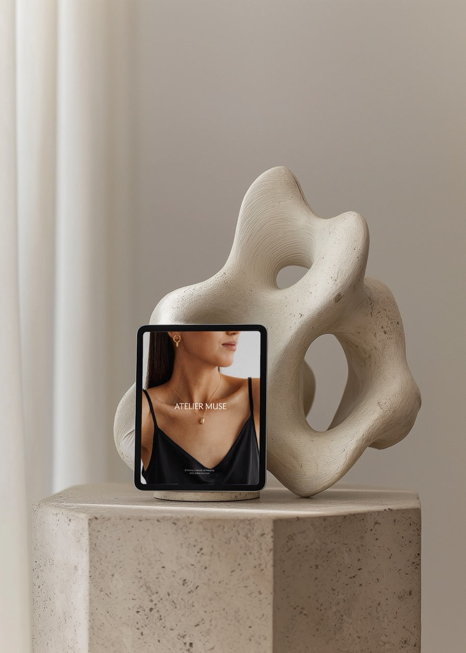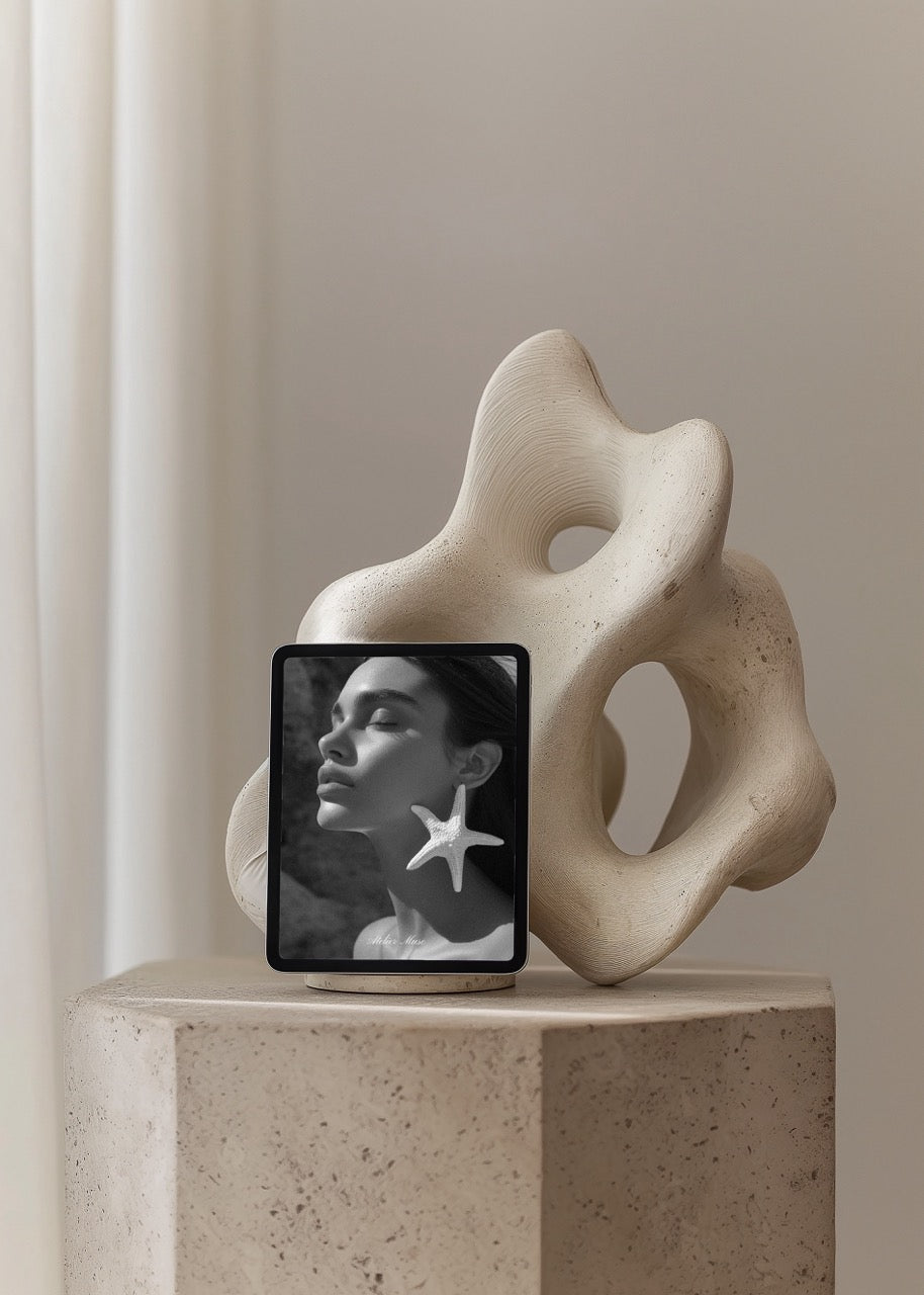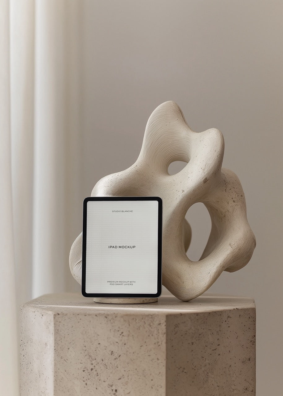 Showcase your designs with our chic Modern iPad Mockup. This iPad display setup is designed with a neutral aesthetic in mind, making it the ideal backdrop for your digital artwork or website design. Inspired by minimalist principles, this mockup will allow your design to take centre stage, capturing your audience's attention with its subtle yet impactful presentation. Set against a bright and airy interior backdrop, the iPad is perched on a refined travertine pedestal, exuding an aura of sophistication.