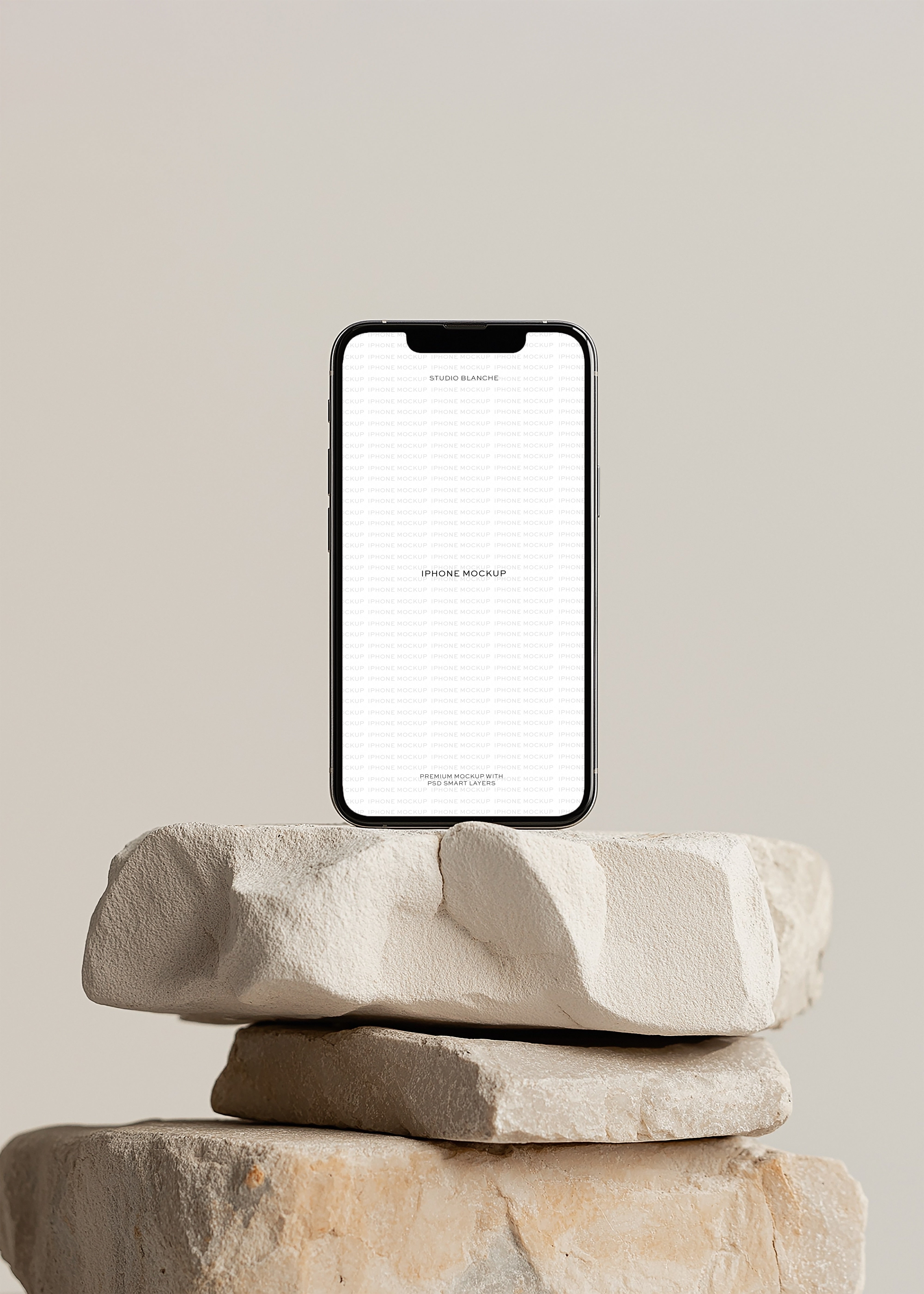 Experience the difference and elevate your project presentations with our distinctive iPhone Mockup. The mockup features an iPhone, propped on a travertine props, the neutral colour palette paves the way for your designs to shine. Our mockup is designed to be versatile and easy to use. Simply place your design on the screen, adjust to your liking, and voilà - your work is ready to impress. Ideal for website design presentations, app showcases, or social media posts, this mockup provides a canvas that effortlessly mirrors the quality of your work.