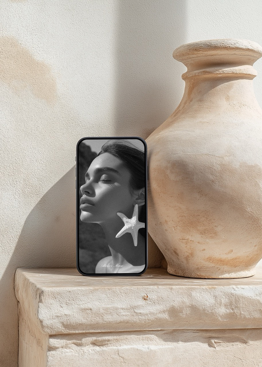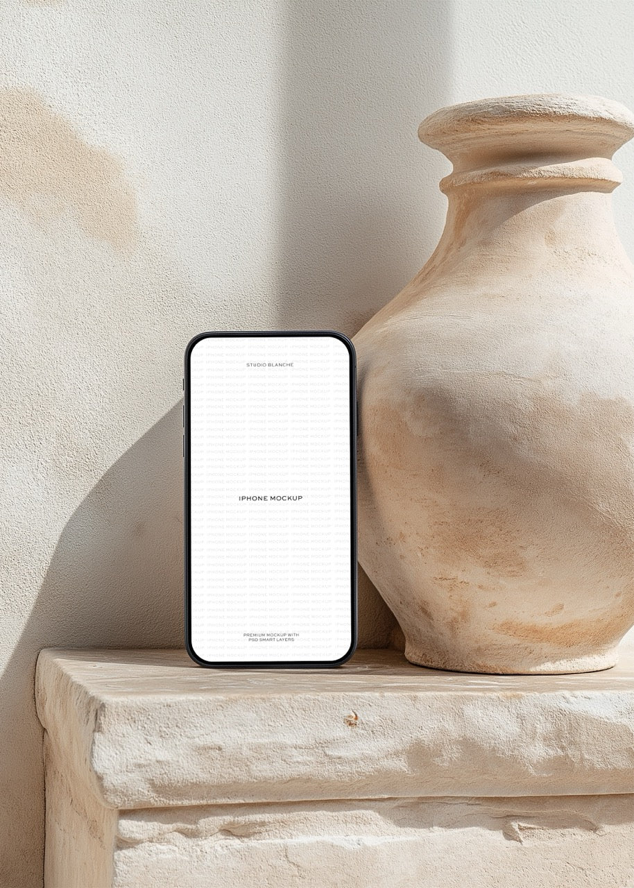 Transform your design presentations with our iPhone Mockup, featuring a sleek iPhone resting beside an elegant, sandstone vase. This modern and minimalistic mockup is the perfect way to showcase your stationery designs, app interfaces, or branding projects with both realism and sophistication. Whether you're impressing clients, enhancing your portfolio, or creating visuals for your online store, this mockup provides the polished and professional aesthetic your work deserves. This template brings depth, texture, and authenticity to your designs, ensuring they stand out and leave a lasting impression.