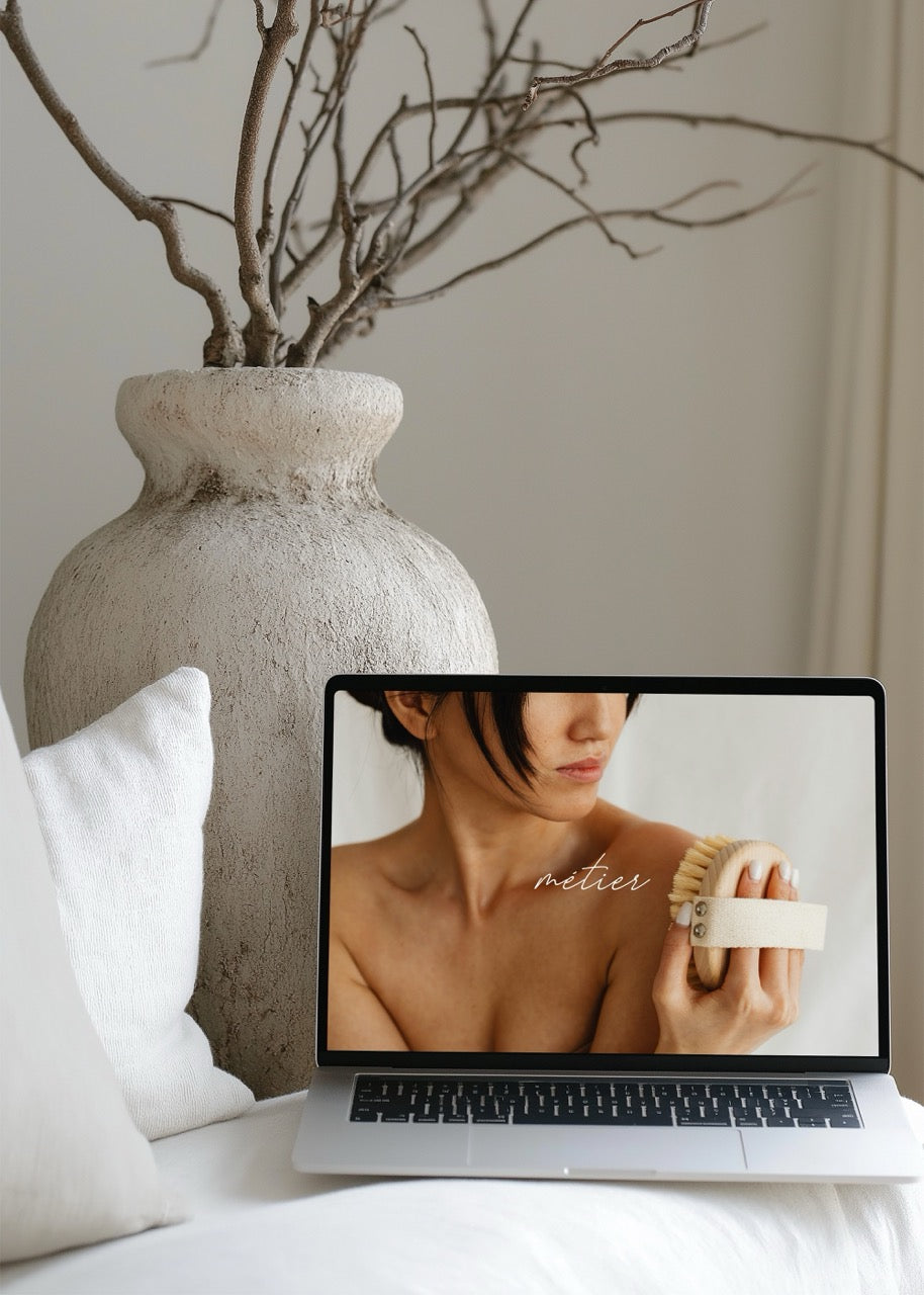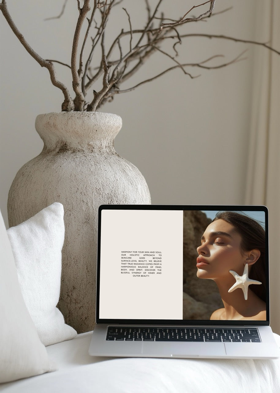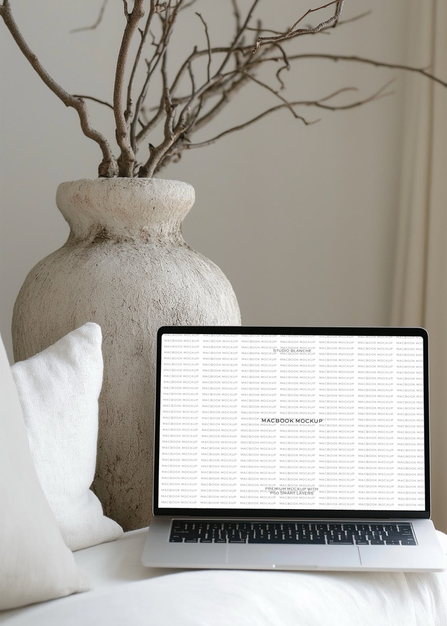 Showcase your designs with our chic Modern MacBook Mockup. This MacBook display setup is designed with a neutral aesthetic in mind, making it the ideal backdrop for your digital artwork or website design. Inspired by minimalist principles, this mockup will allow your design to take centre stage, capturing your audience's attention with its subtle yet impactful presentation. Set against a bright and airy interior backdrop, the MacBook is placed on a contemporary sofa exuding an aura of sophistication.