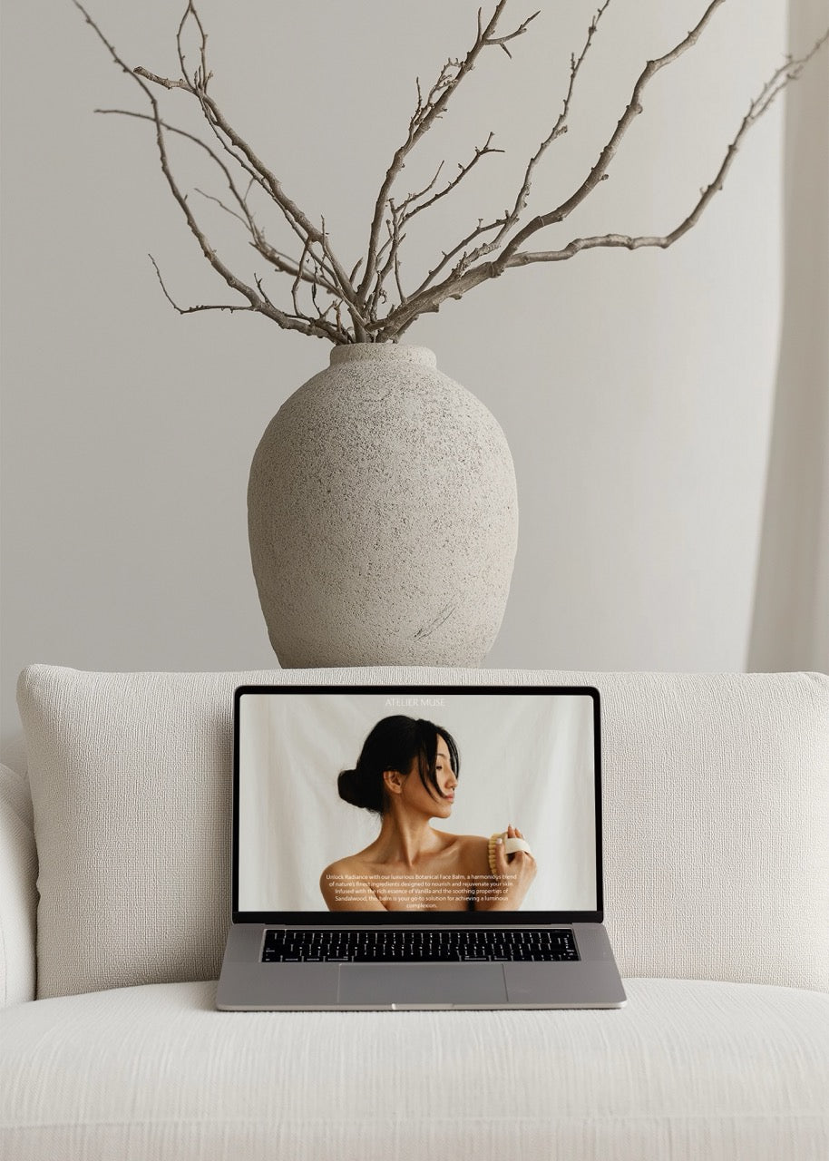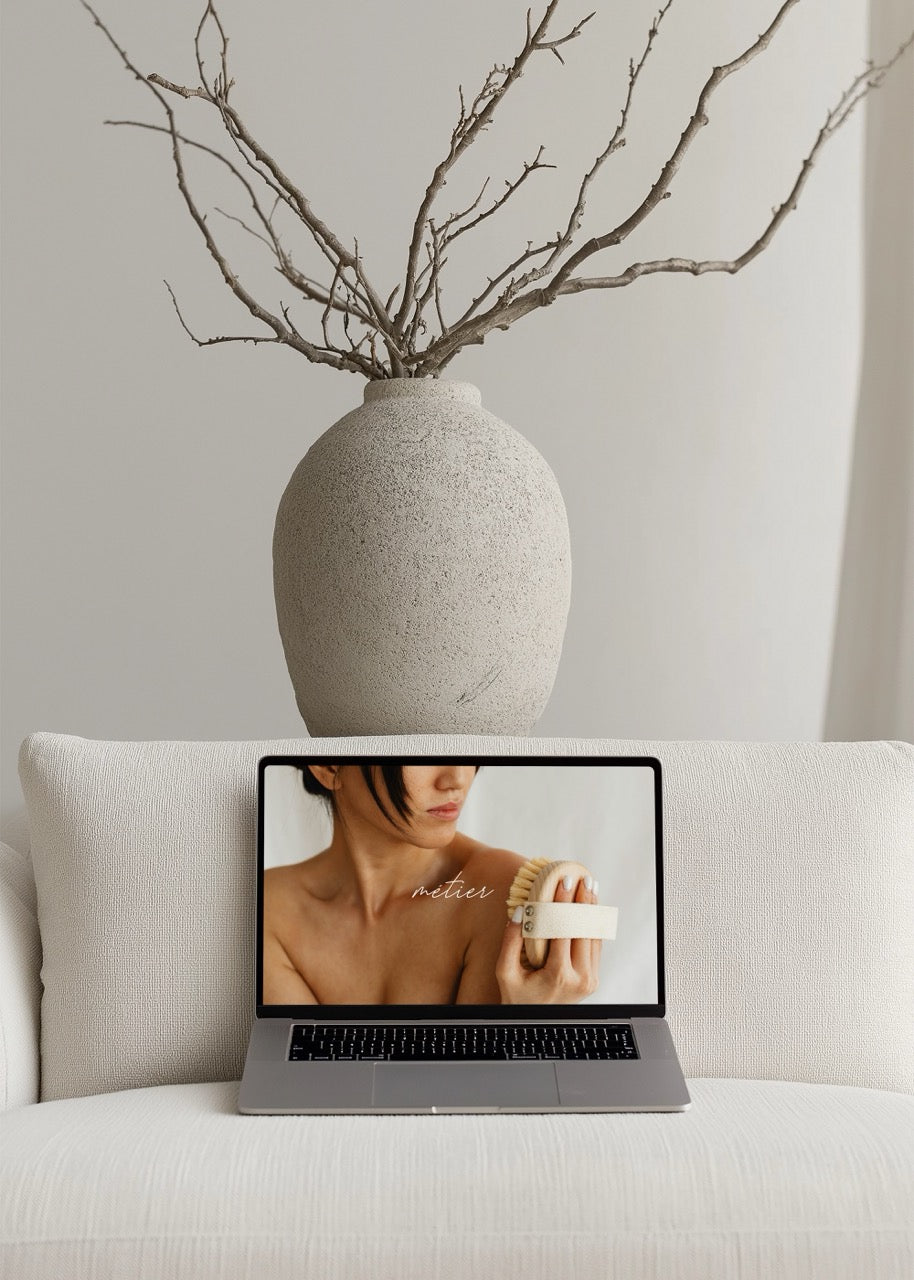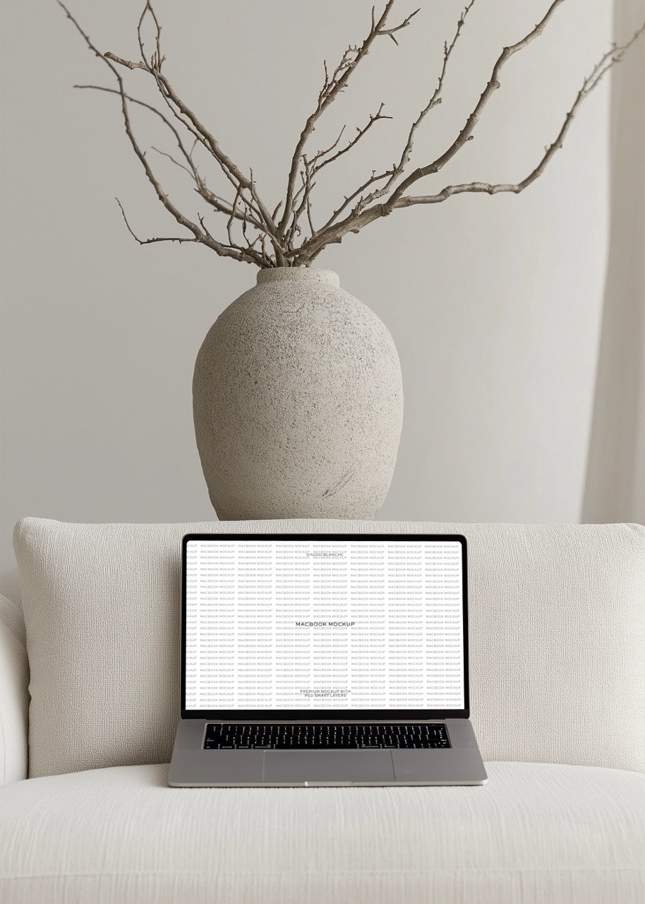 Showcase your designs with our chic Modern MacBook Mockup. This MacBook display setup is designed with a neutral aesthetic in mind, making it the ideal backdrop for your digital artwork or website design. Inspired by minimalist principles, this mockup will allow your design to take centre stage, capturing your audience's attention with its subtle yet impactful presentation. Set against a bright and airy interior backdrop, the MacBook is placed on a light cream modern sofa exuding an aura of sophistication.