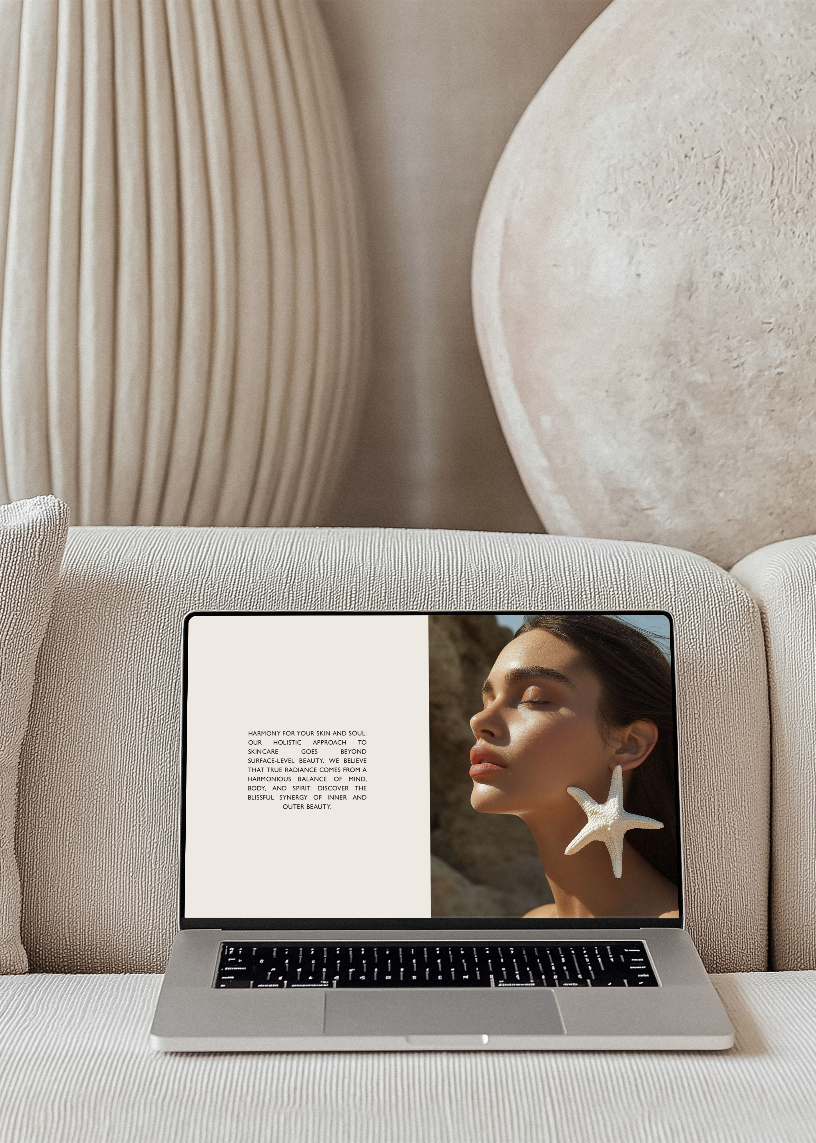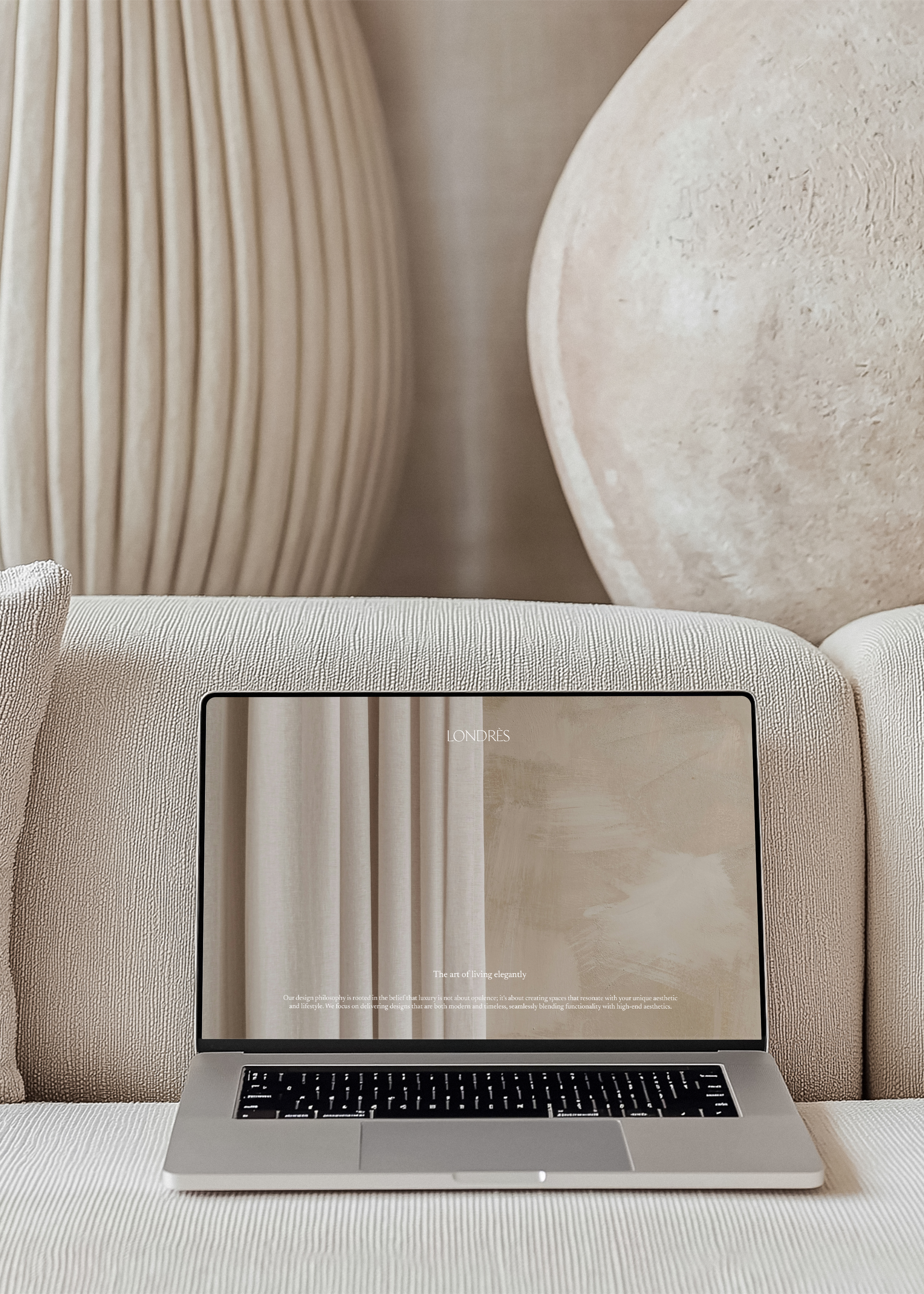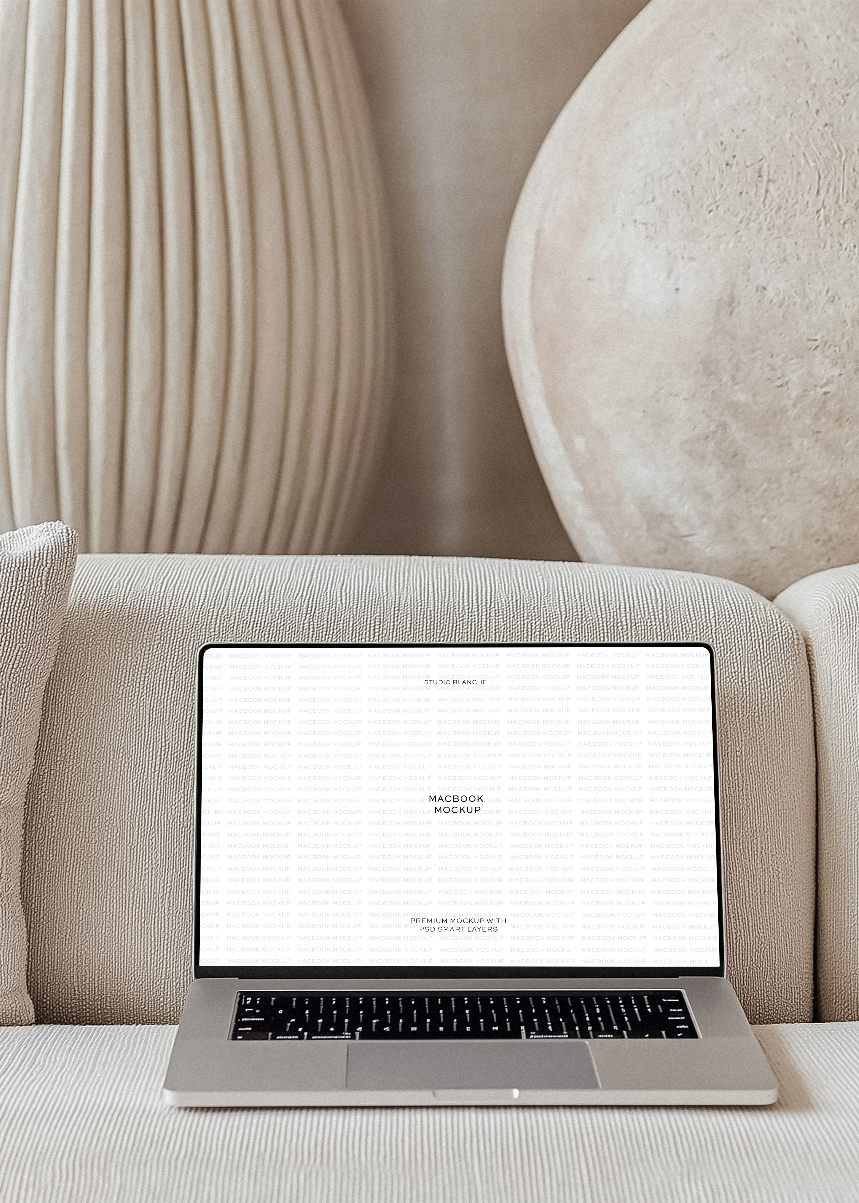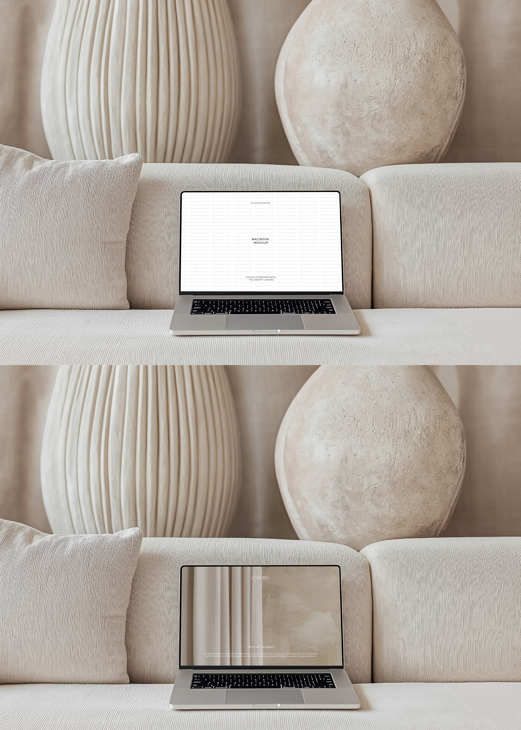 Introduce your designs with our stylish MacBook Mockup. This MacBook display setup is crafted with a neutral aesthetic, making it the perfect canvas for your digital artwork or website design. The MacBook is positioned on a light cream sofa against a bright and airy interior backdrop, radiating an air of sophistication. What sets this mockup apart is its landscape orientation, which makes it particularly suitable for website banners. So, whether you're looking to showcase your latest website design or digital art, this Modern MacBook Mockup is the perfect tool to make your work stand out