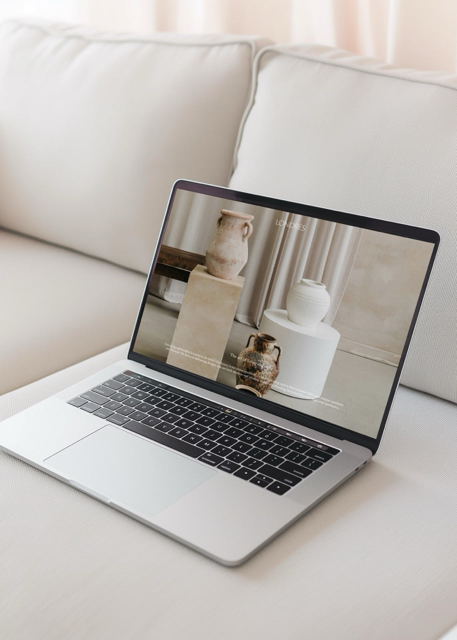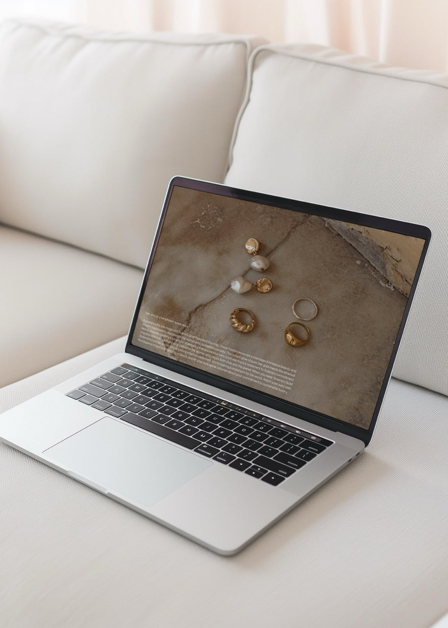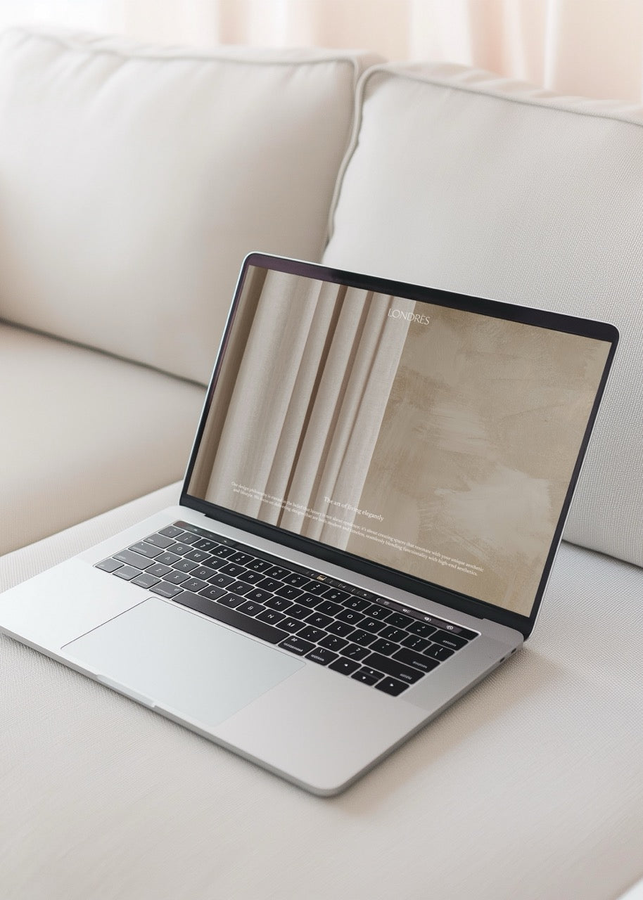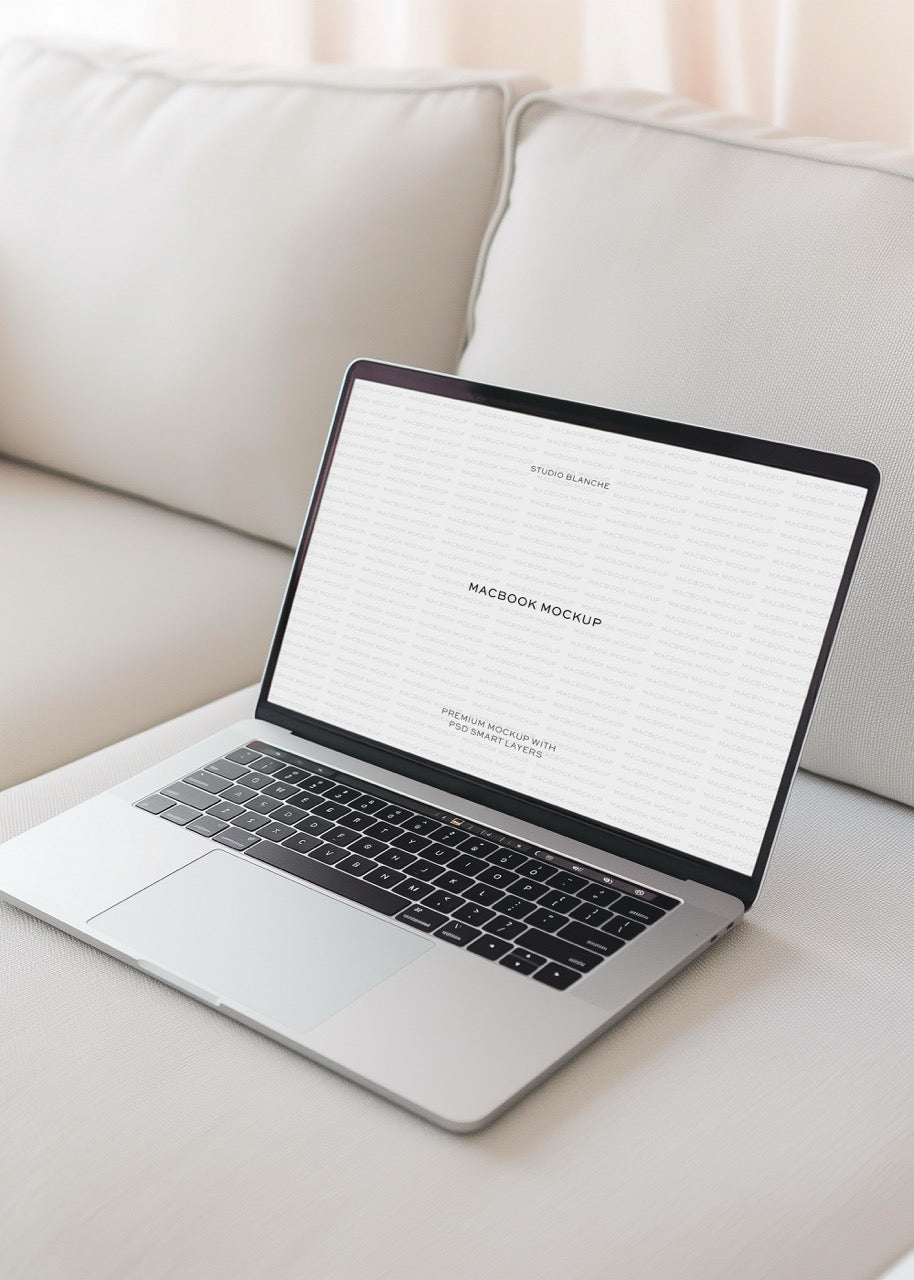 Showcase your designs with our chic Modern MacBook Mockup. This MacBook display setup is designed with a neutral aesthetic in mind, making it the ideal backdrop for your digital artwork or website design. Inspired by minimalist principles, this mockup will allow your design to take centre stage, capturing your audience's attention with its subtle yet impactful presentation. Set against a bright and airy interior backdrop, the MacBook is placed on a contemporary sofa exuding an aura of sophistication.