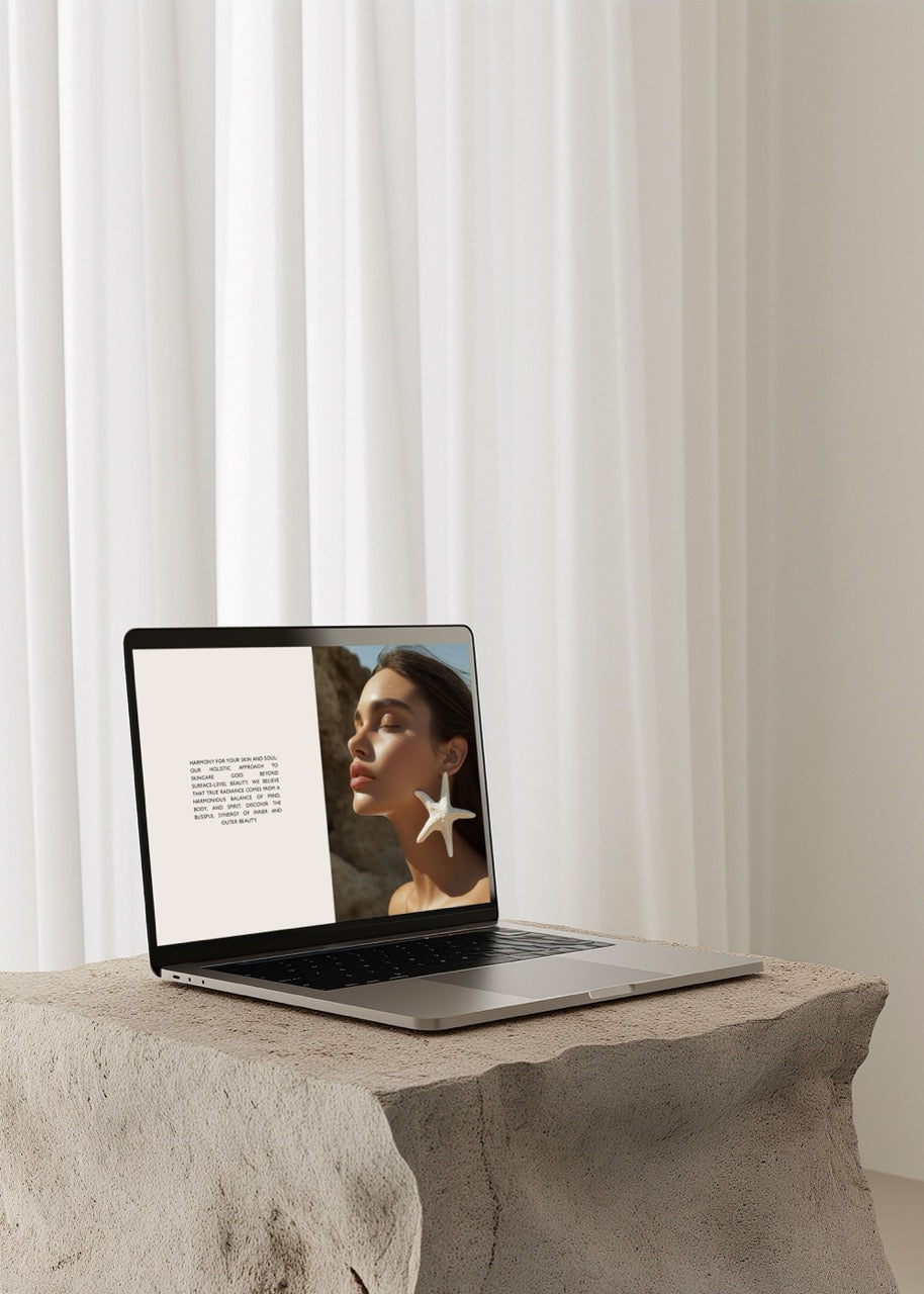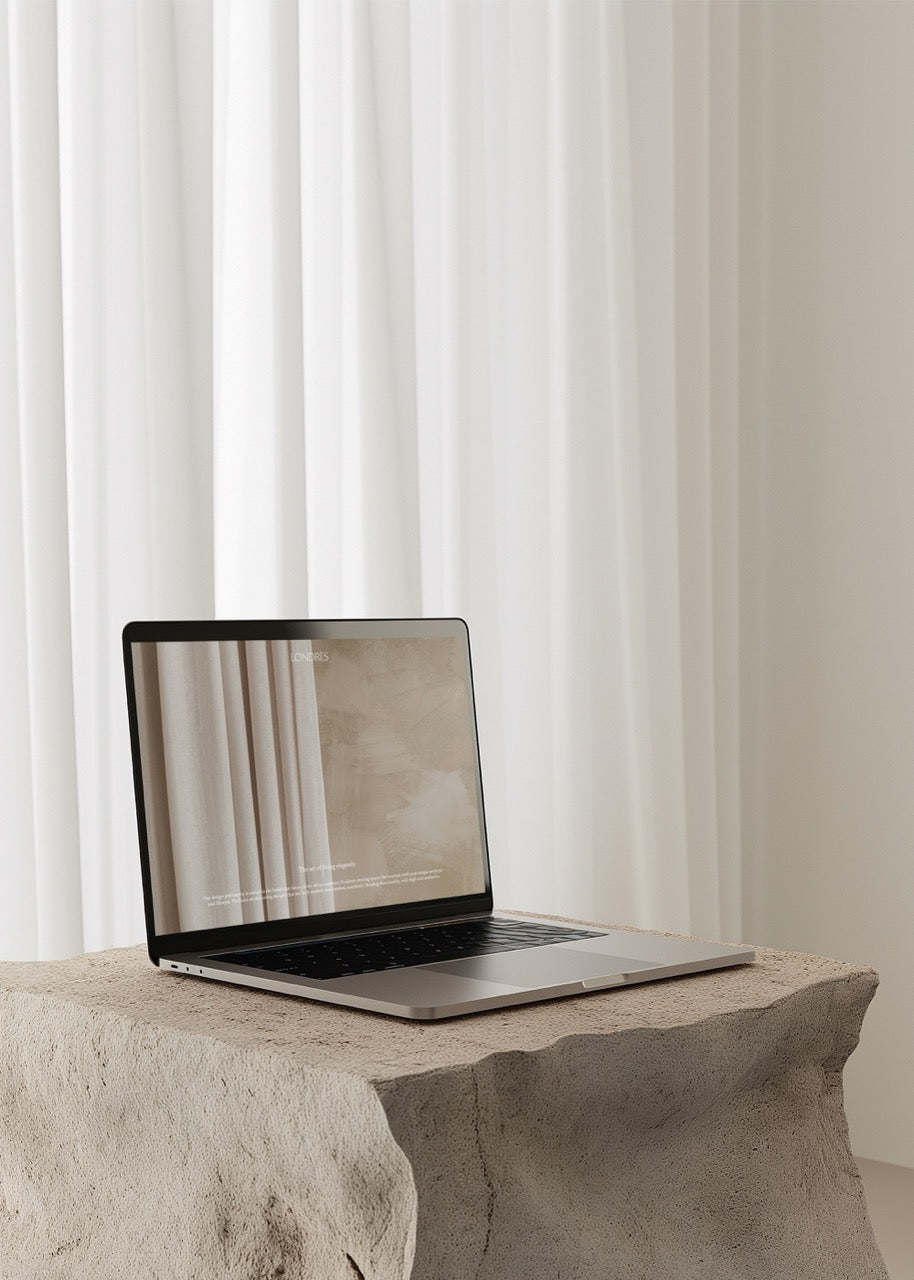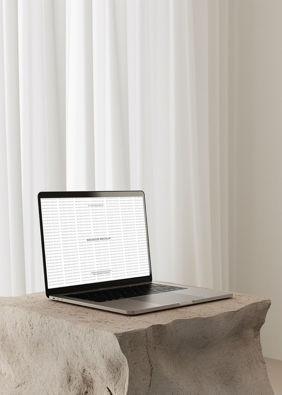 Showcase your designs with our chic Modern MacBook Mockup. This MacBook display setup is designed with a neutral aesthetic in mind, making it the ideal backdrop for your digital artwork or website design. Inspired by minimalist principles, this mockup will allow your design to take centre stage, capturing your audience's attention with its subtle yet impactful presentation. Set against a bright and airy interior backdrop, the MacBook is placed on a travertine pedestal exuding an aura of sophistication.