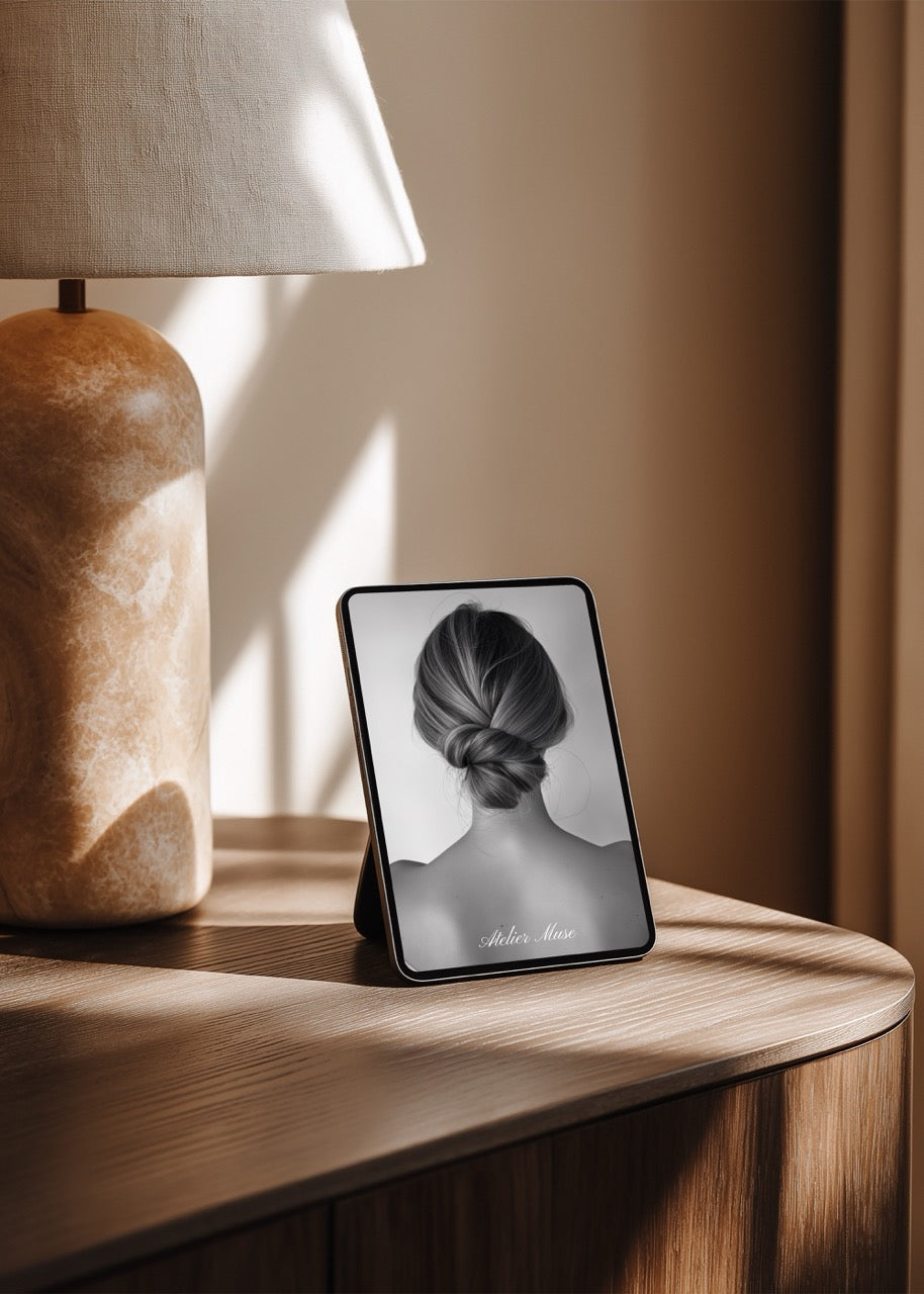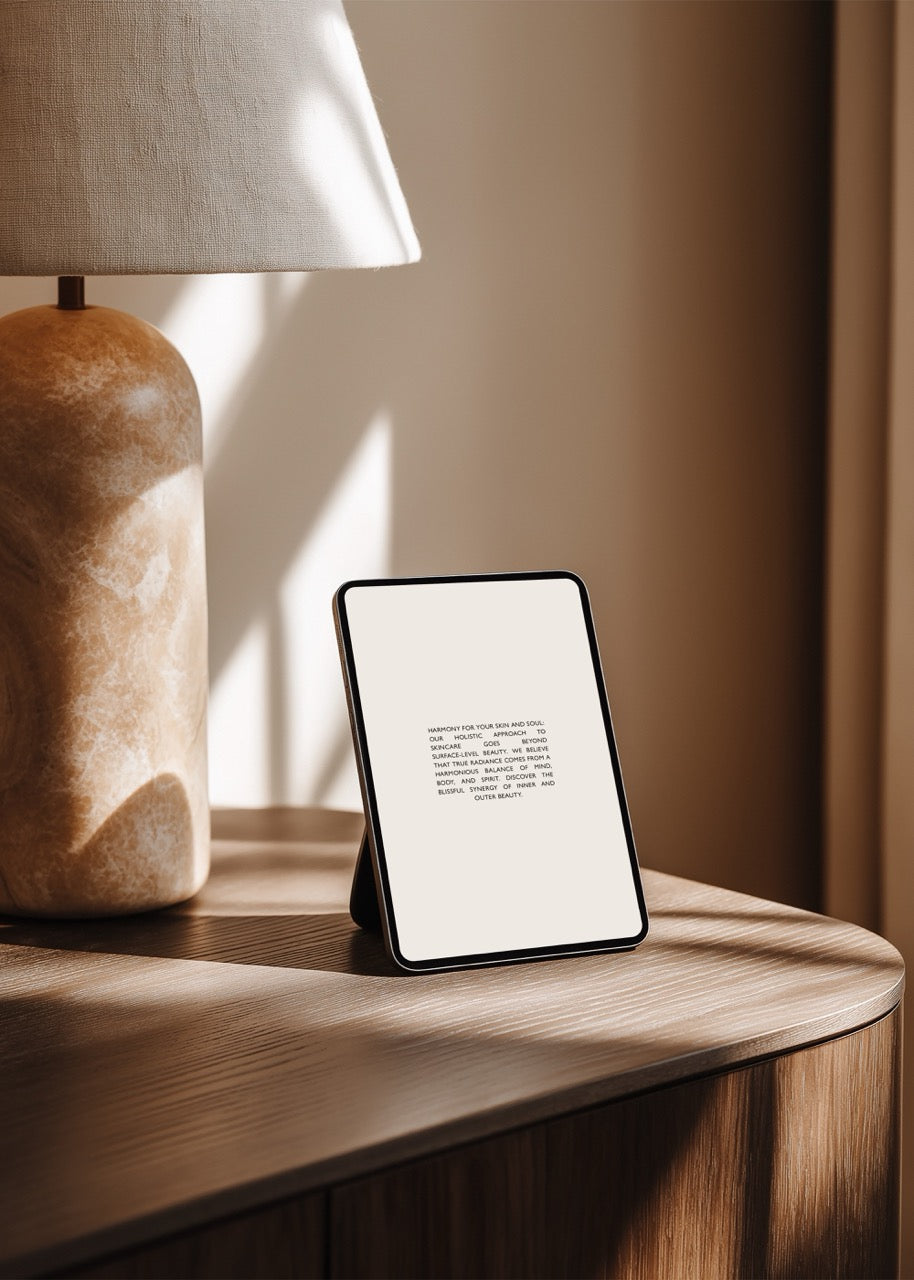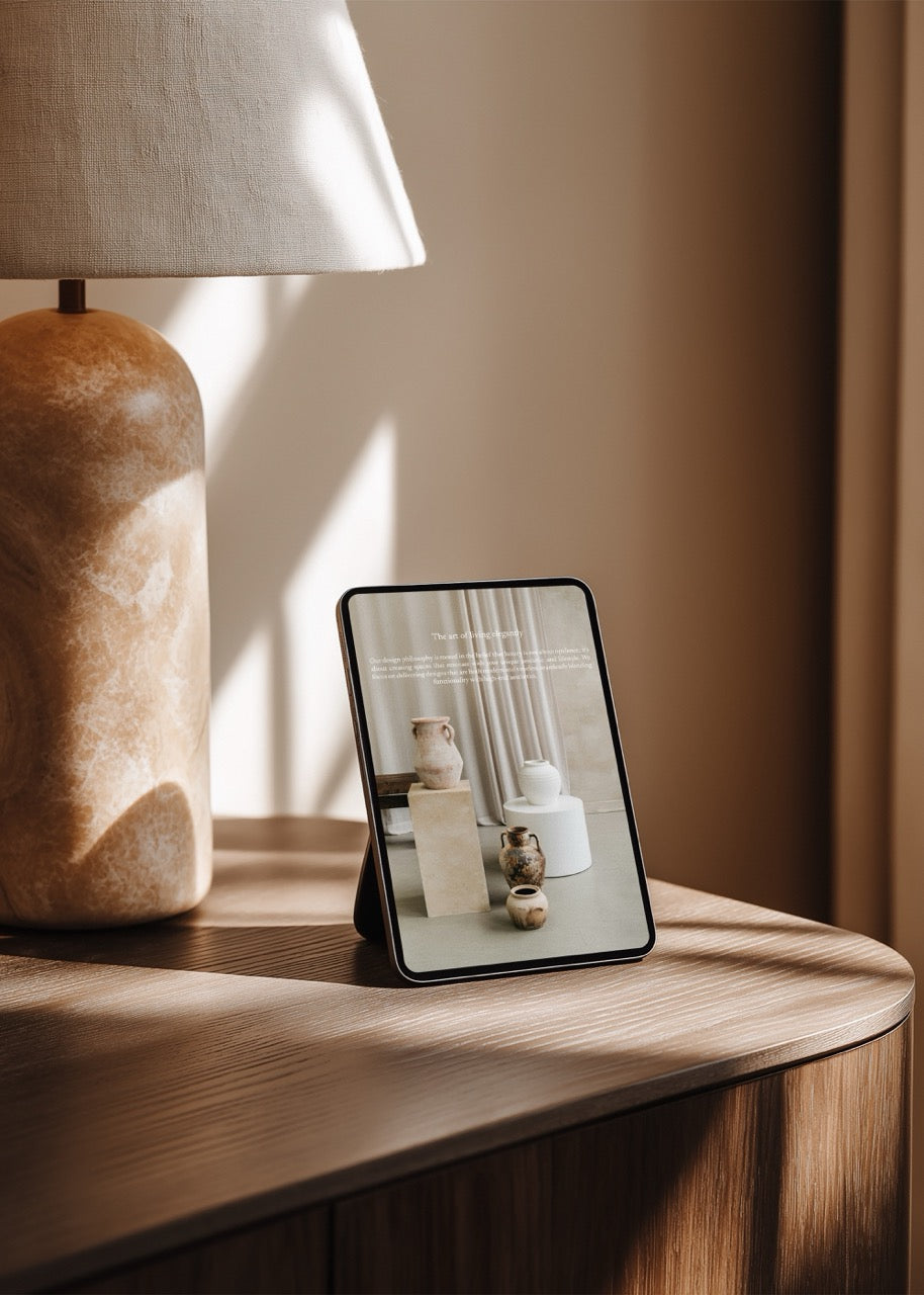 Showcase your digital creativity on this exquisitely styled iPad mockup where every element - from the natural lighting to the stunning desk scene - reinforces professional excellence. Ideal for presenting websites, applications, or digital portfolios in a setting that speaks to luxury positioning and sophisticated taste. Make your work shine in its best light.