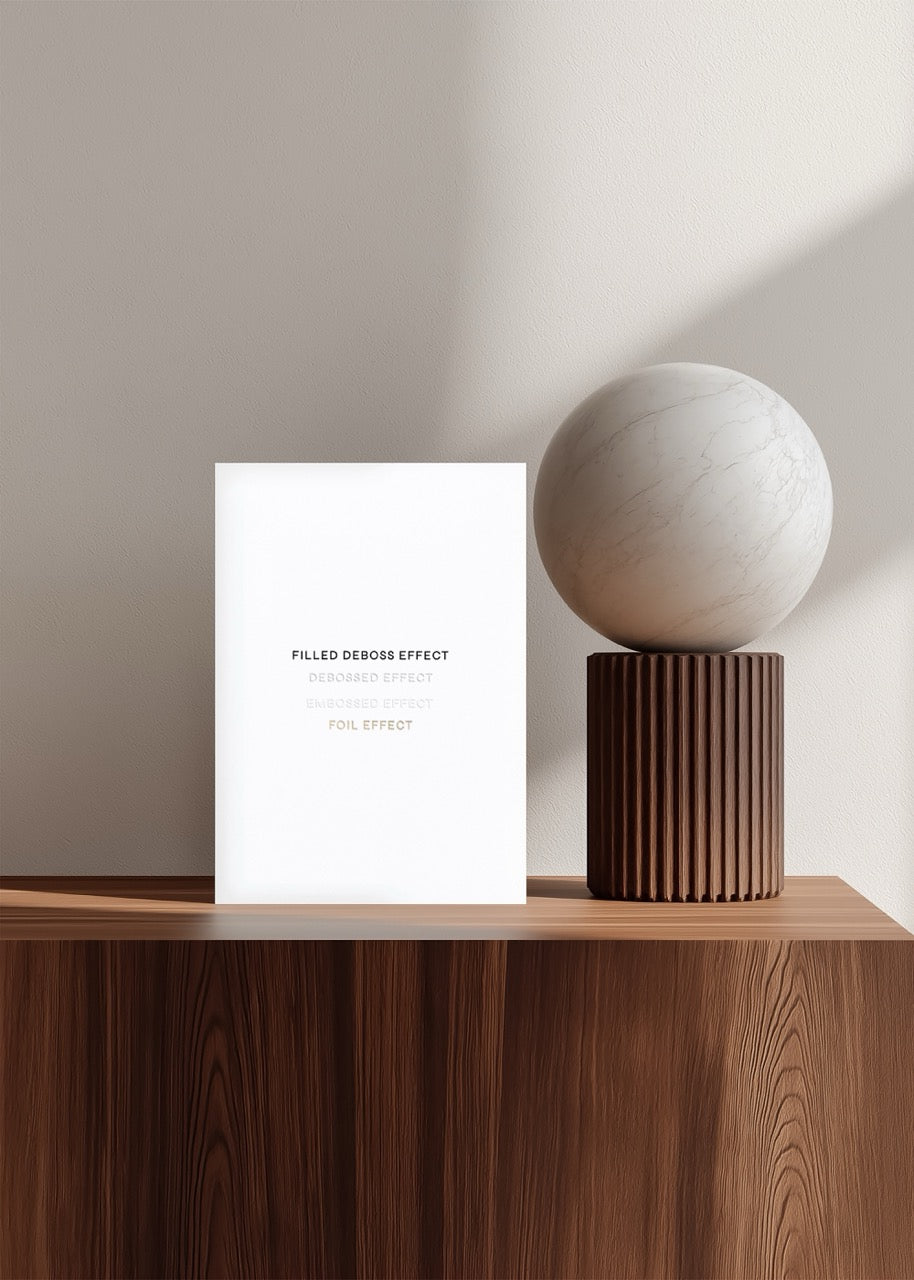 1 PSD file with smart layers including four print effects: filled deboss, blind deboss, blind emboss and gold foil.