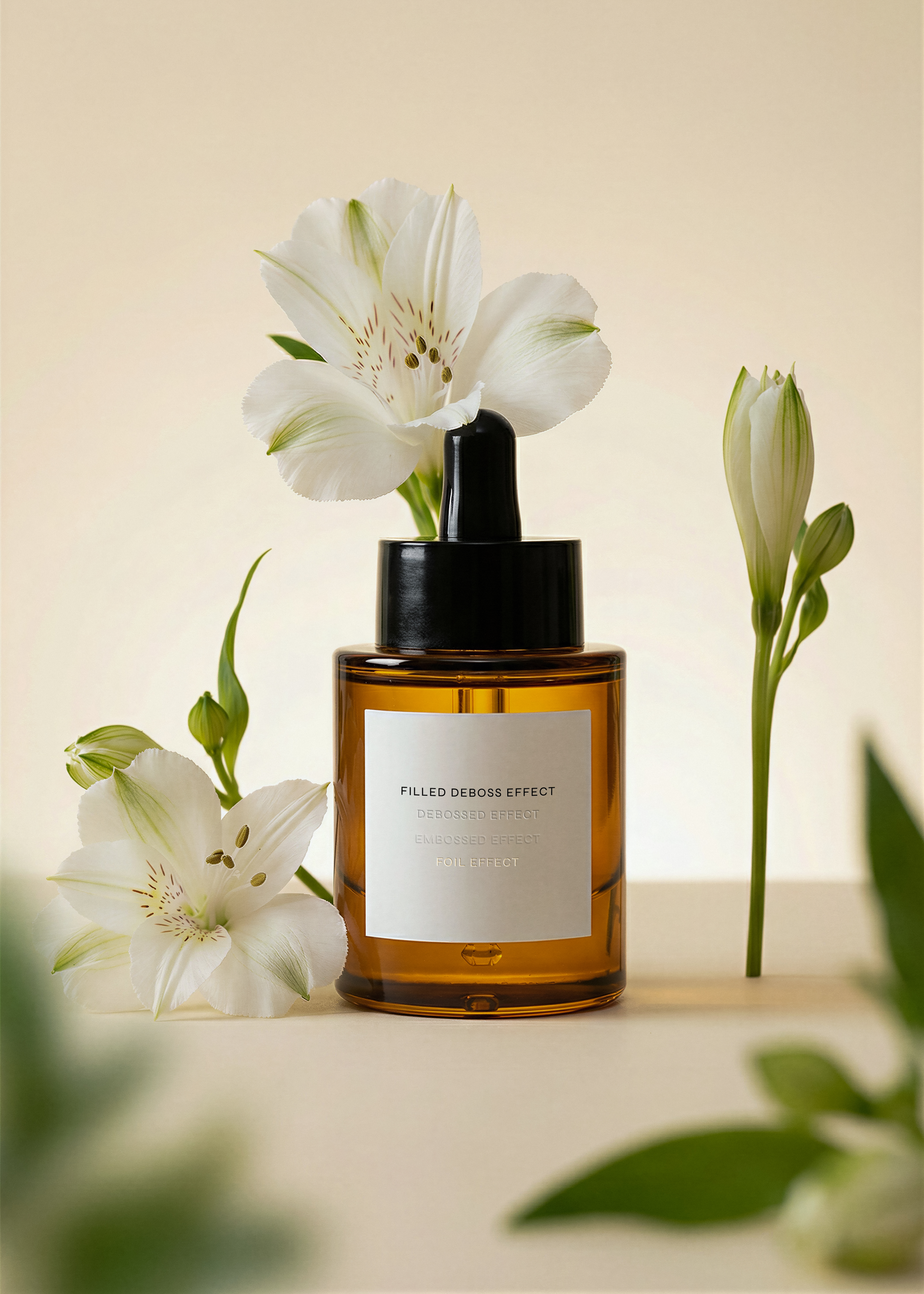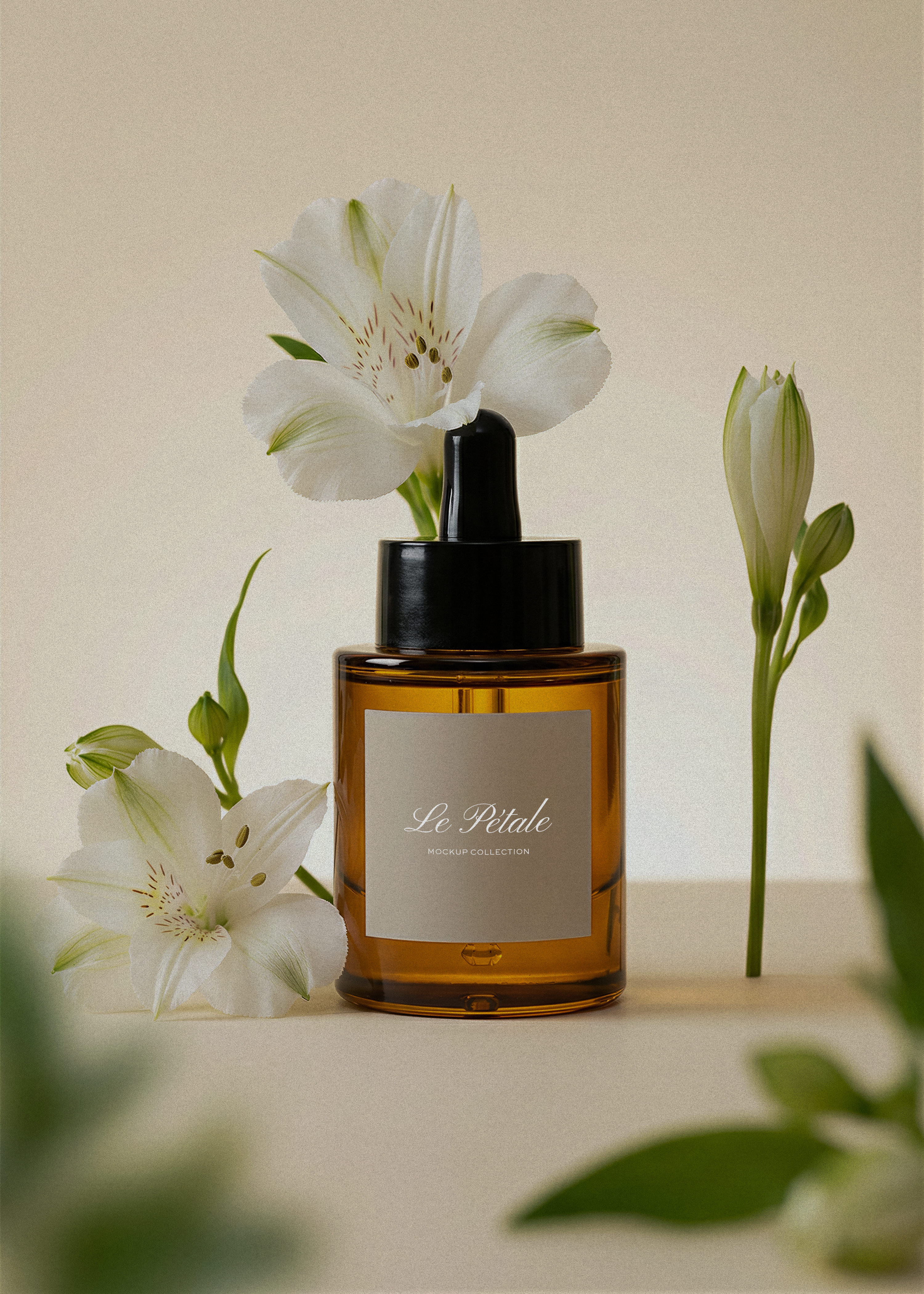 With its soft floral surrounds and clean aesthetic, this dropper bottle mockup is designed to position serums and facial oils at the premium end of the beauty market.