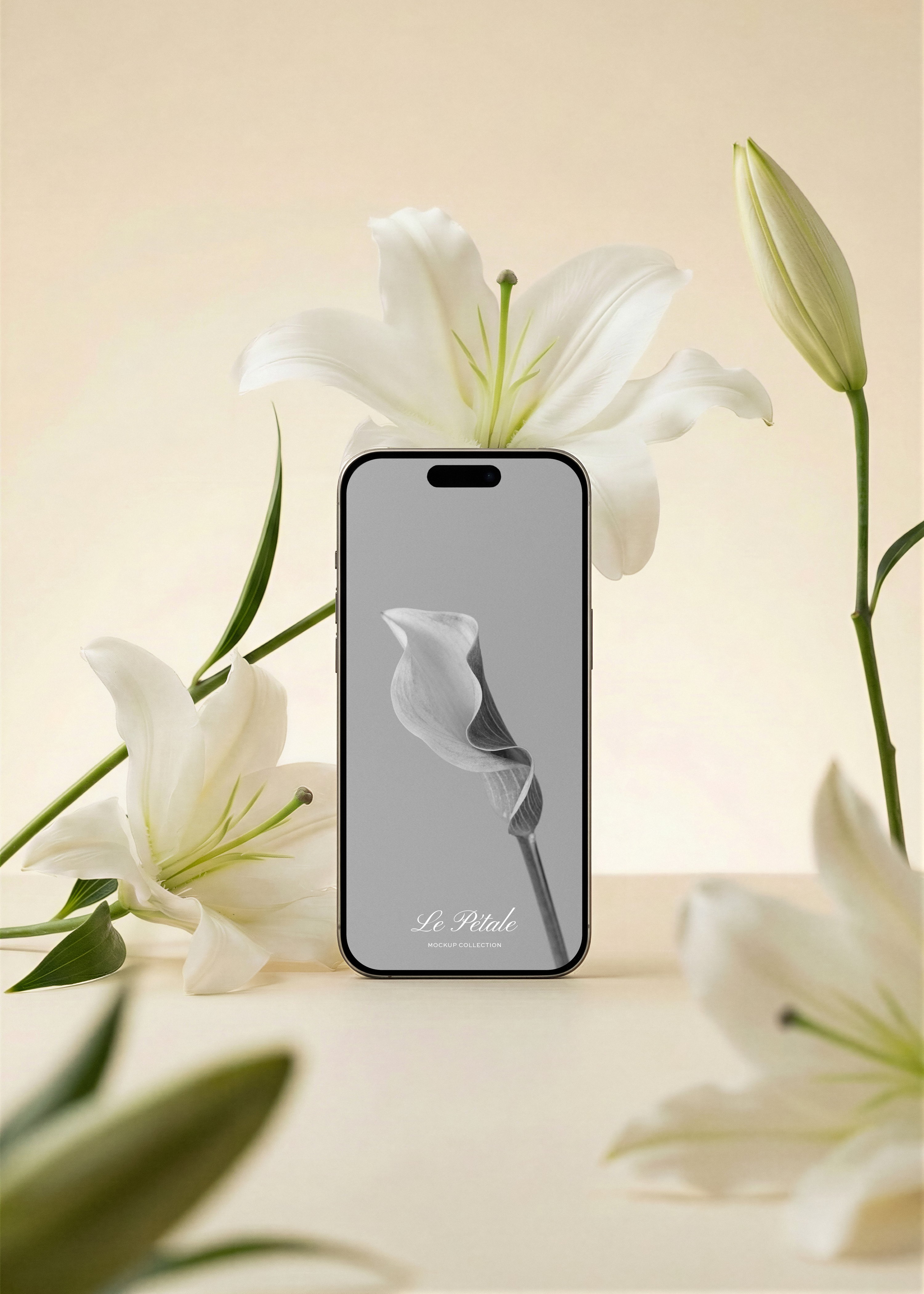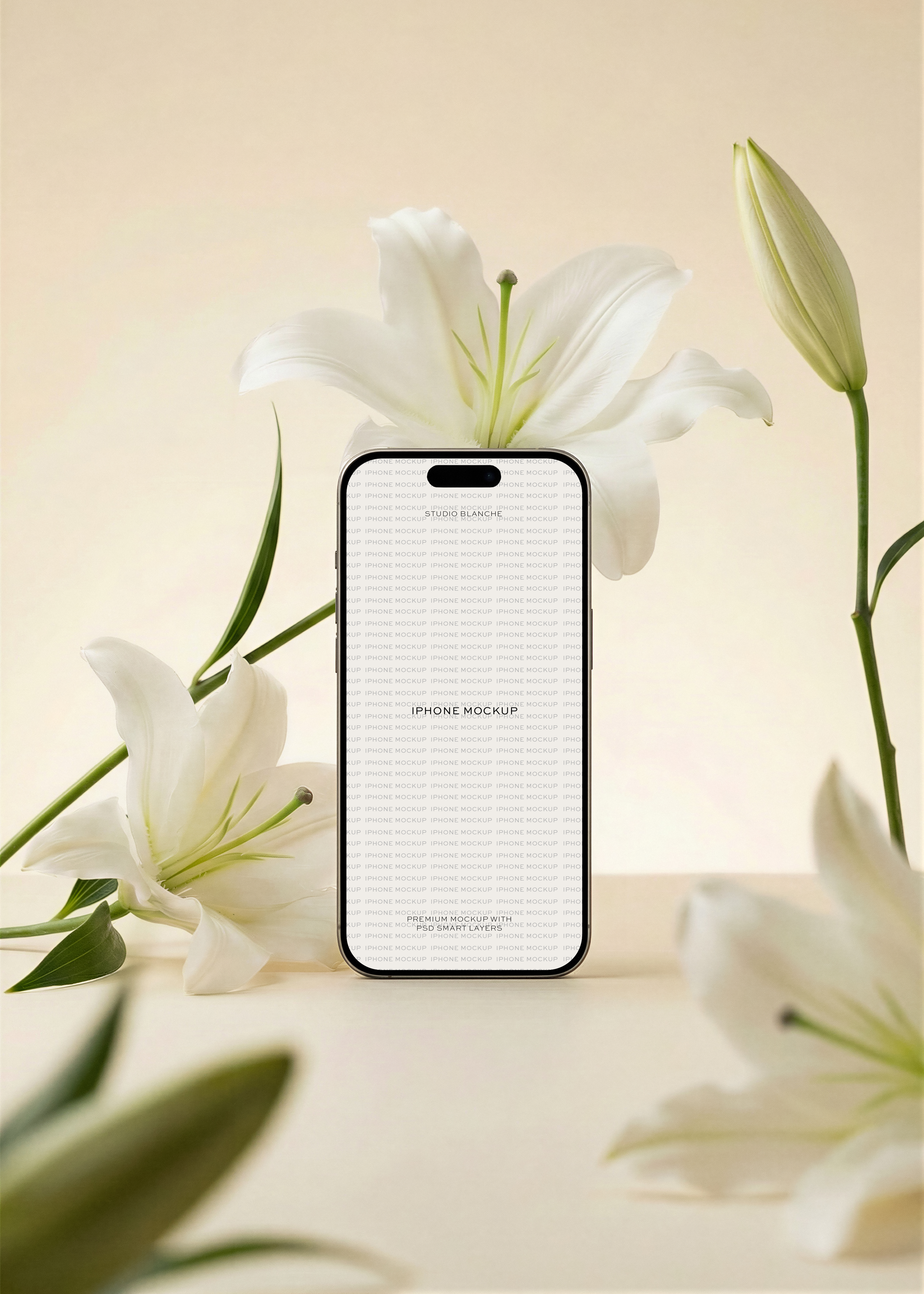 Present your digital brand in full bloom. This iPhone mockup offers a beautifully styled backdrop for UI design, social media, or e-commerce presentations.