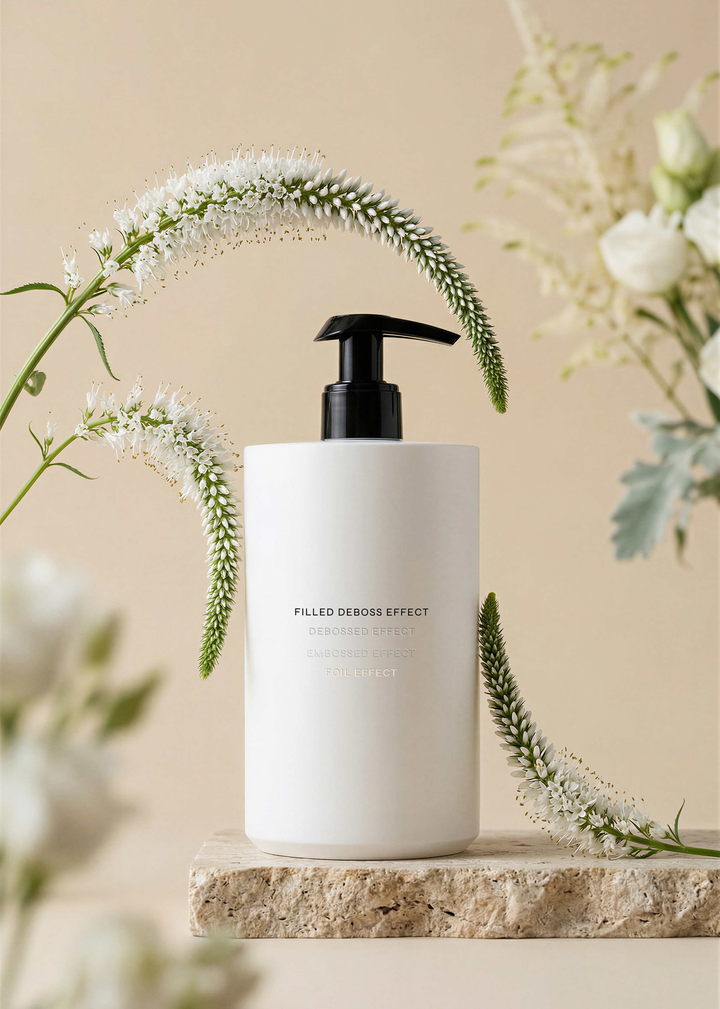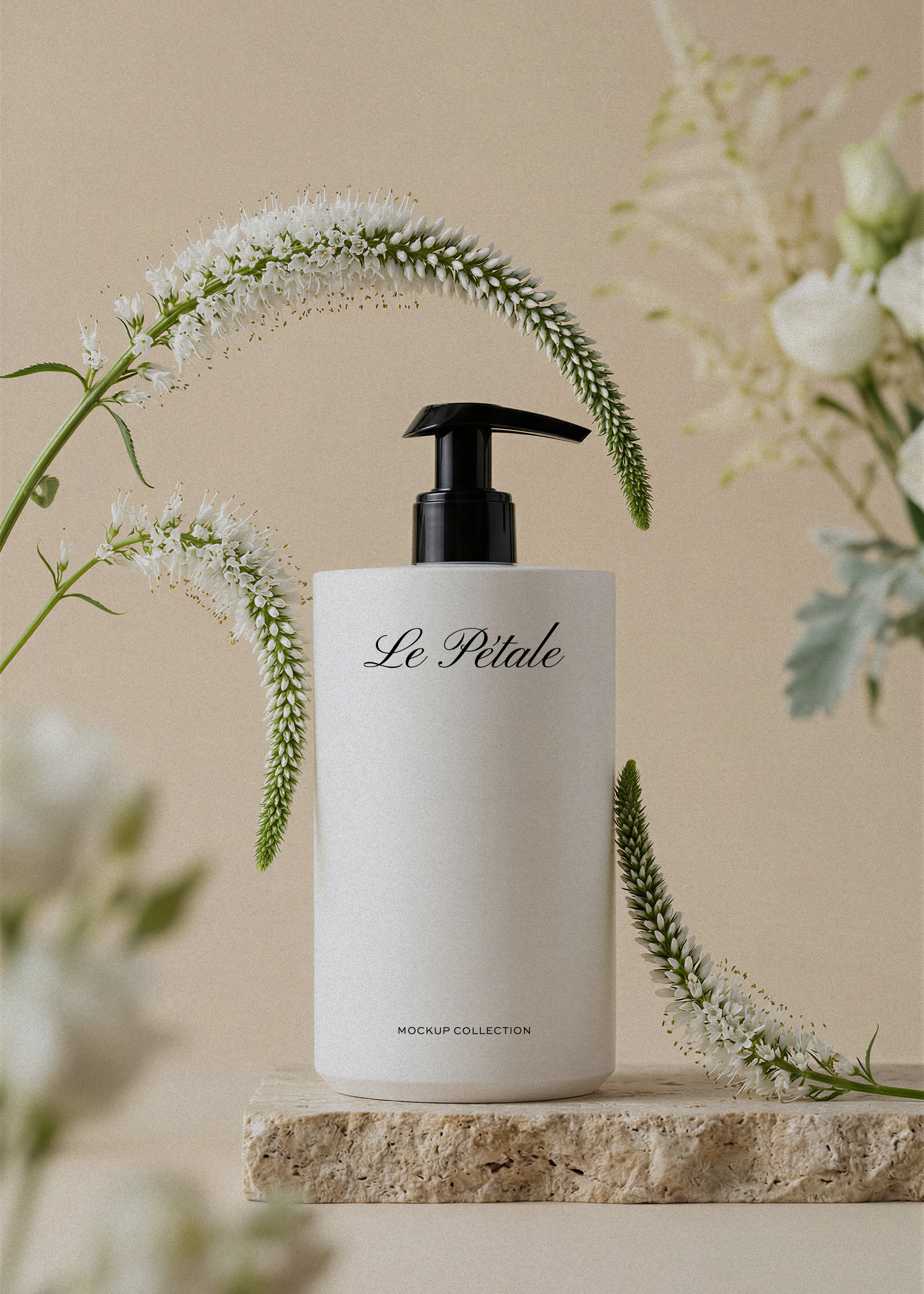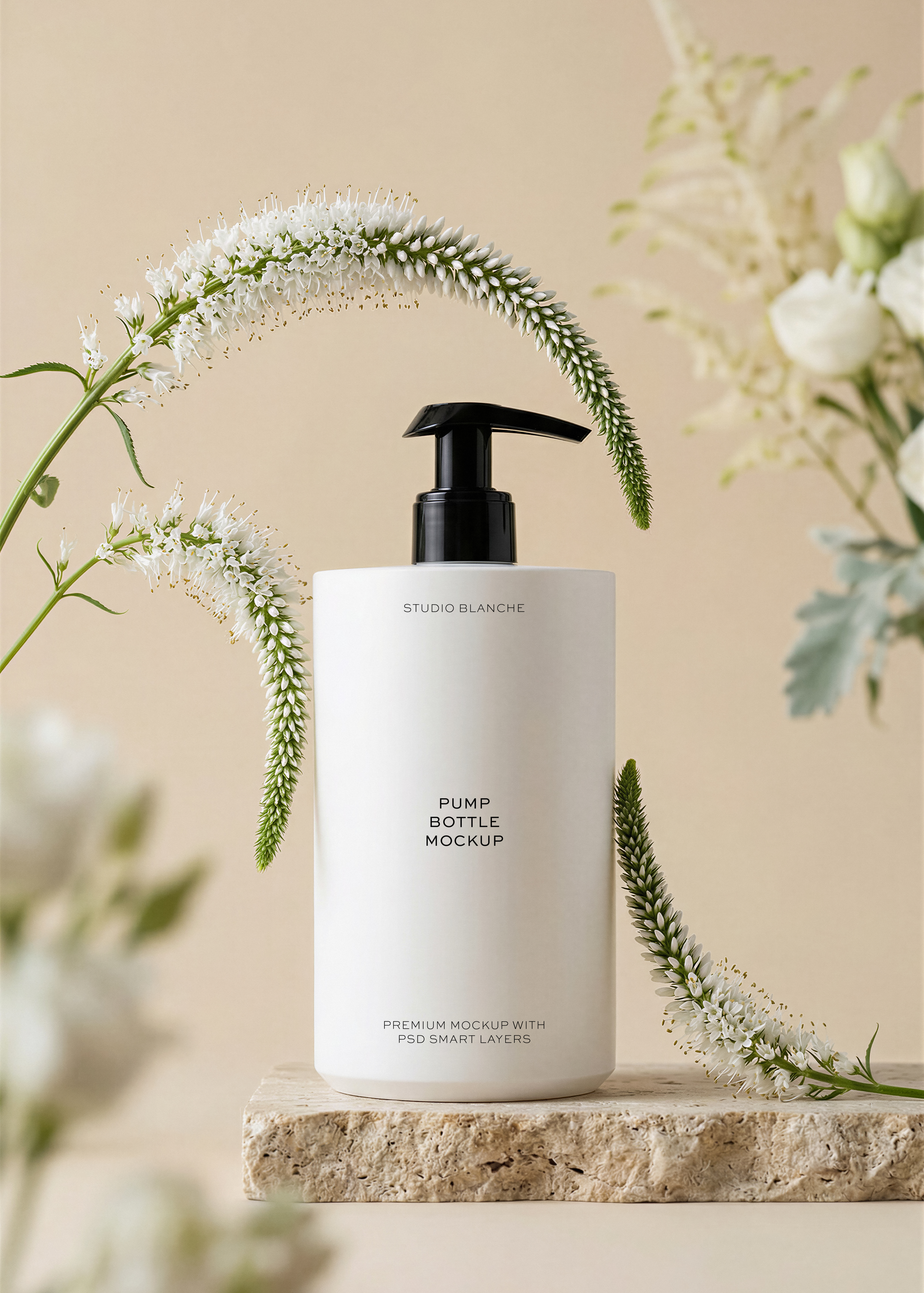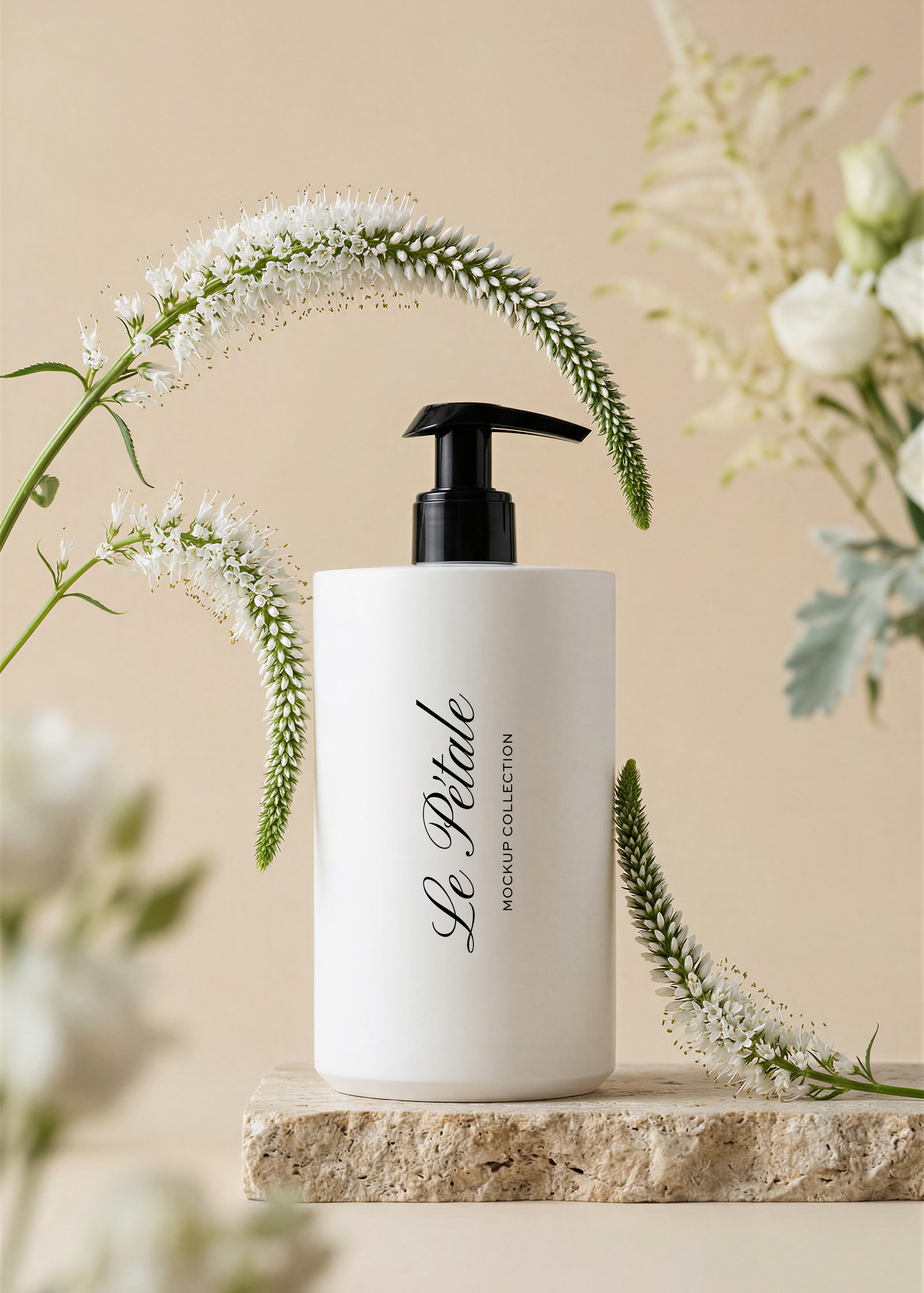 This pump bottle mockup, styled amongst delicate blooms and warm neutral tones, is an ideal canvas for hand care, body lotion, or luxury soap branding.
