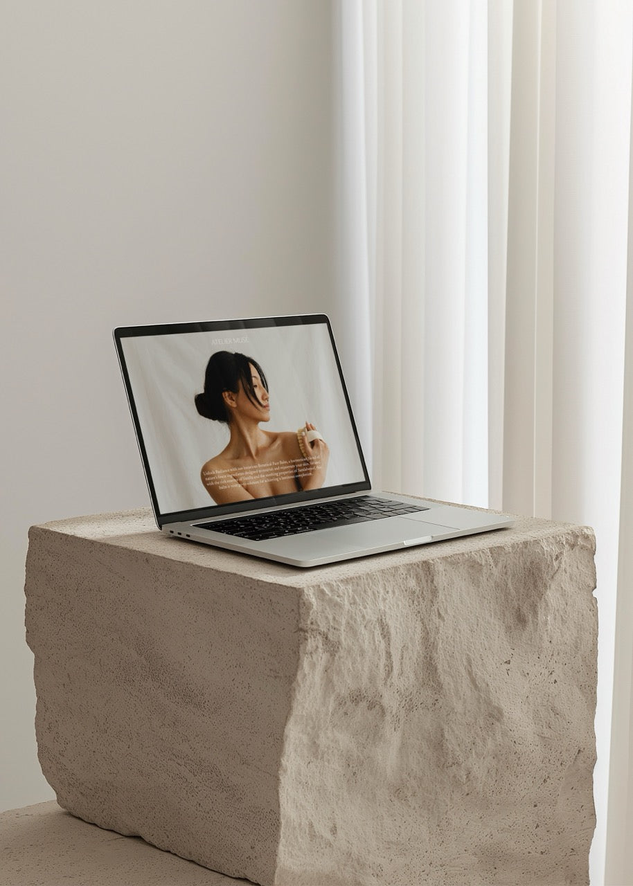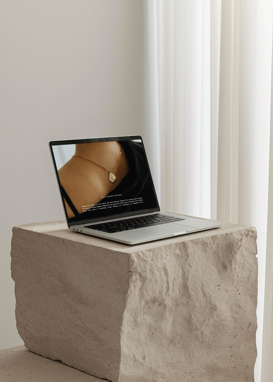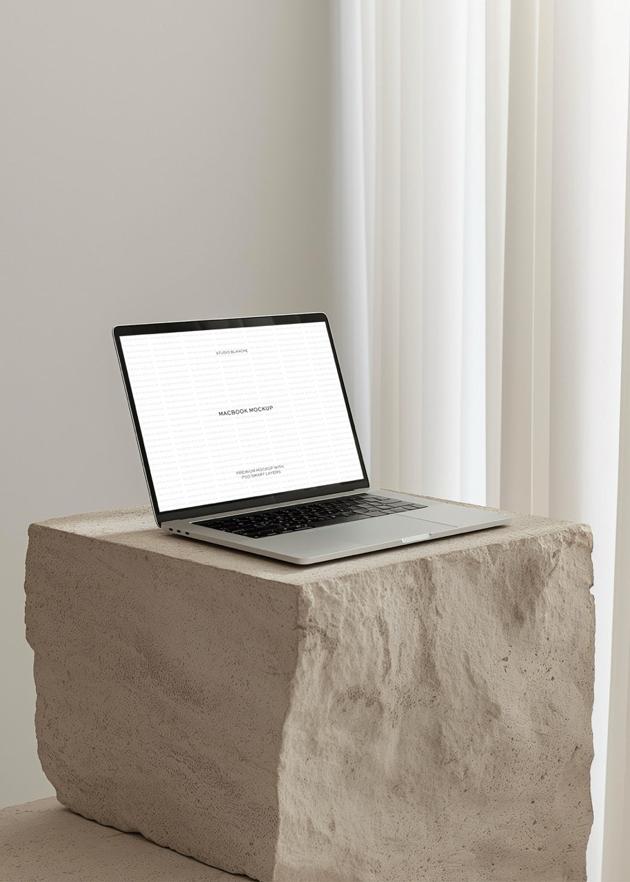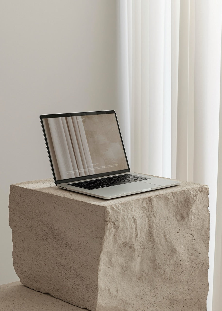 Showcase your designs with our chic Modern MacBook Mockup. This MacBook display setup is designed with a neutral aesthetic in mind, making it the ideal backdrop for your digital artwork or website design. Inspired by minimalist principles, this mockup will allow your design to take centre stage, capturing your audience's attention with its subtle yet impactful presentation. Set against a bright and airy interior backdrop, the MacBook is placed on a travertine pedestal exuding an aura of sophistication.