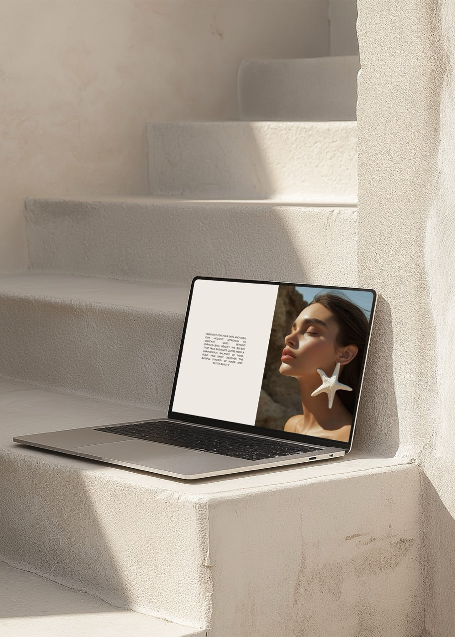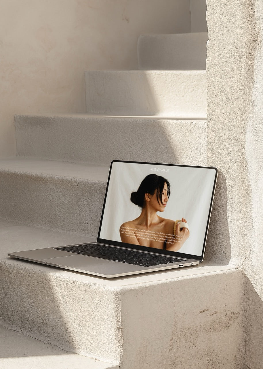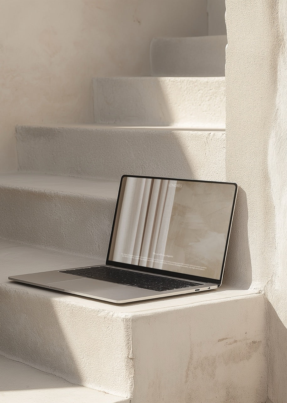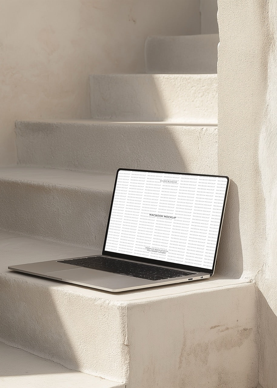 Showcase your designs with our chic Modern MacBook Mockup. This MacBook display setup is designed with a neutral aesthetic in mind, making it the ideal backdrop for your digital artwork or website design. Inspired by minimalist principles, this mockup will allow your design to take centre stage, capturing your audience's attention with its subtle yet impactful presentation. Set against a bright and airy interior backdrop, the MacBook is places on stone steps, exuding an aura of minimalism.