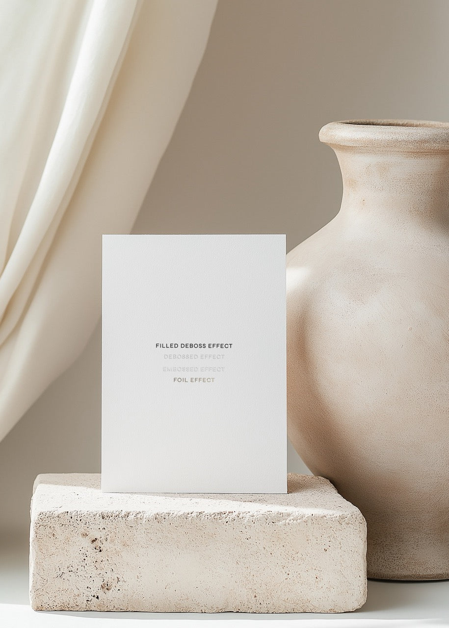 1 PSD file with smart layers including four print effects: filled deboss, blind deboss, blind emboss and gold foil.