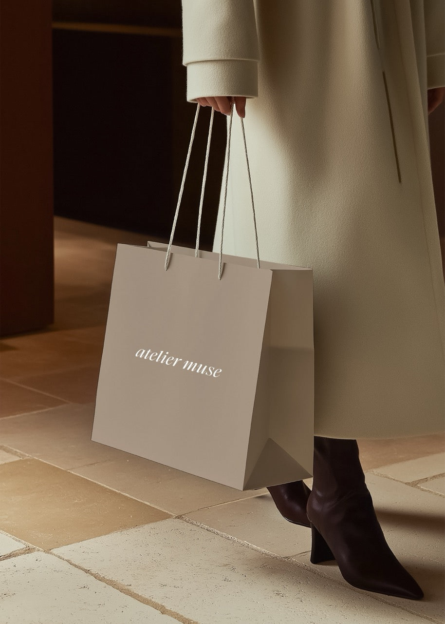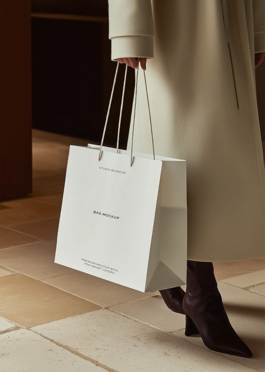 Showcase your brand’s sophistication with our paper shopping bag mockup, expertly crafted for those who appreciate minimalism and fashion-forward design. Captured in a stylish handheld pose, this mockup not only highlights your logo but also offers four luxurious print finish effects ensuring your vision stands out. Perfect for fashion boutiques and creative professionals, this high-quality mockup is the ideal tool to impress clients and elevate your portfolio. Make your brand unforgettable with a touch of modern elegance.