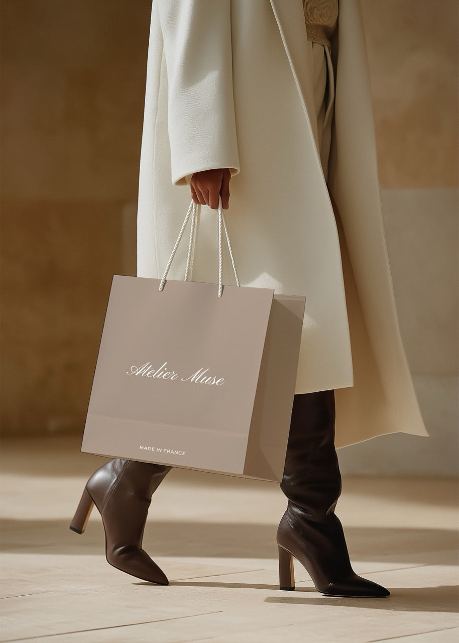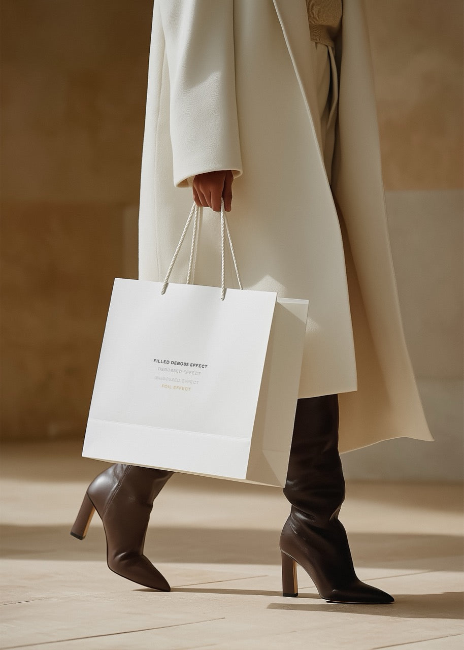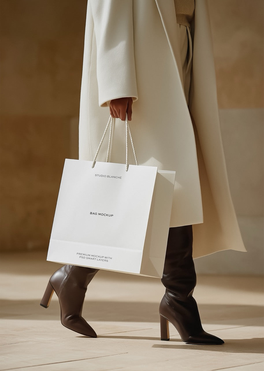Elevate your branding with this exclusive Shopping Bag Mockup, where every detail speaks of quality and prestige. The dynamic pose, luxurious paper texture, and fashion-forward scene make this template perfect for promoting high-end collections or designer launches. Give your brand the spotlight it deserves.