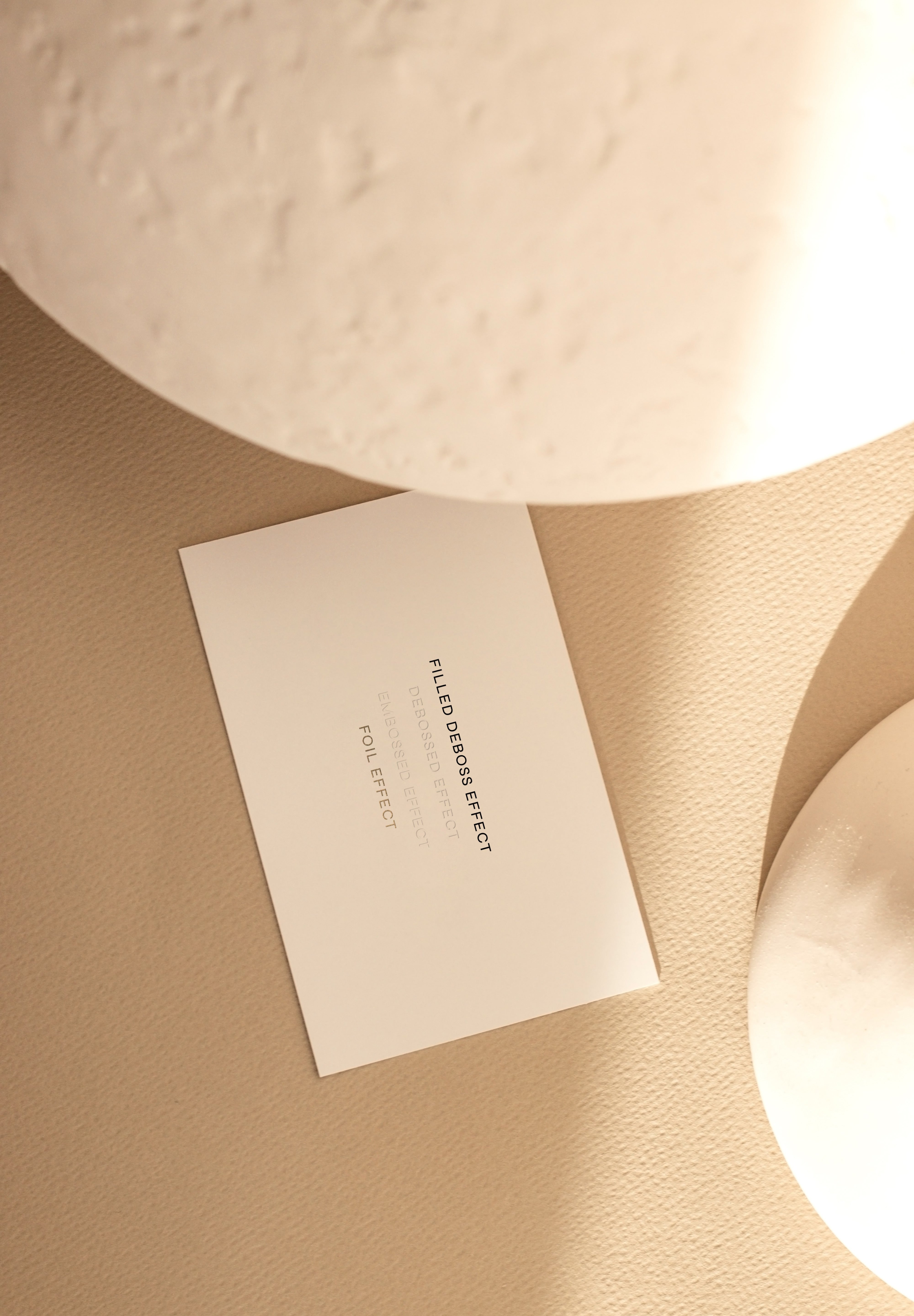 1 PSD file with smart layers including four print effects: filled deboss, blind deboss, blind emboss and gold foil.