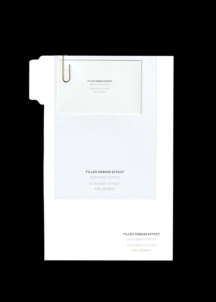 1 PSD file with smart layers including four print effects: filled deboss, blind deboss, blind emboss and gold foil.