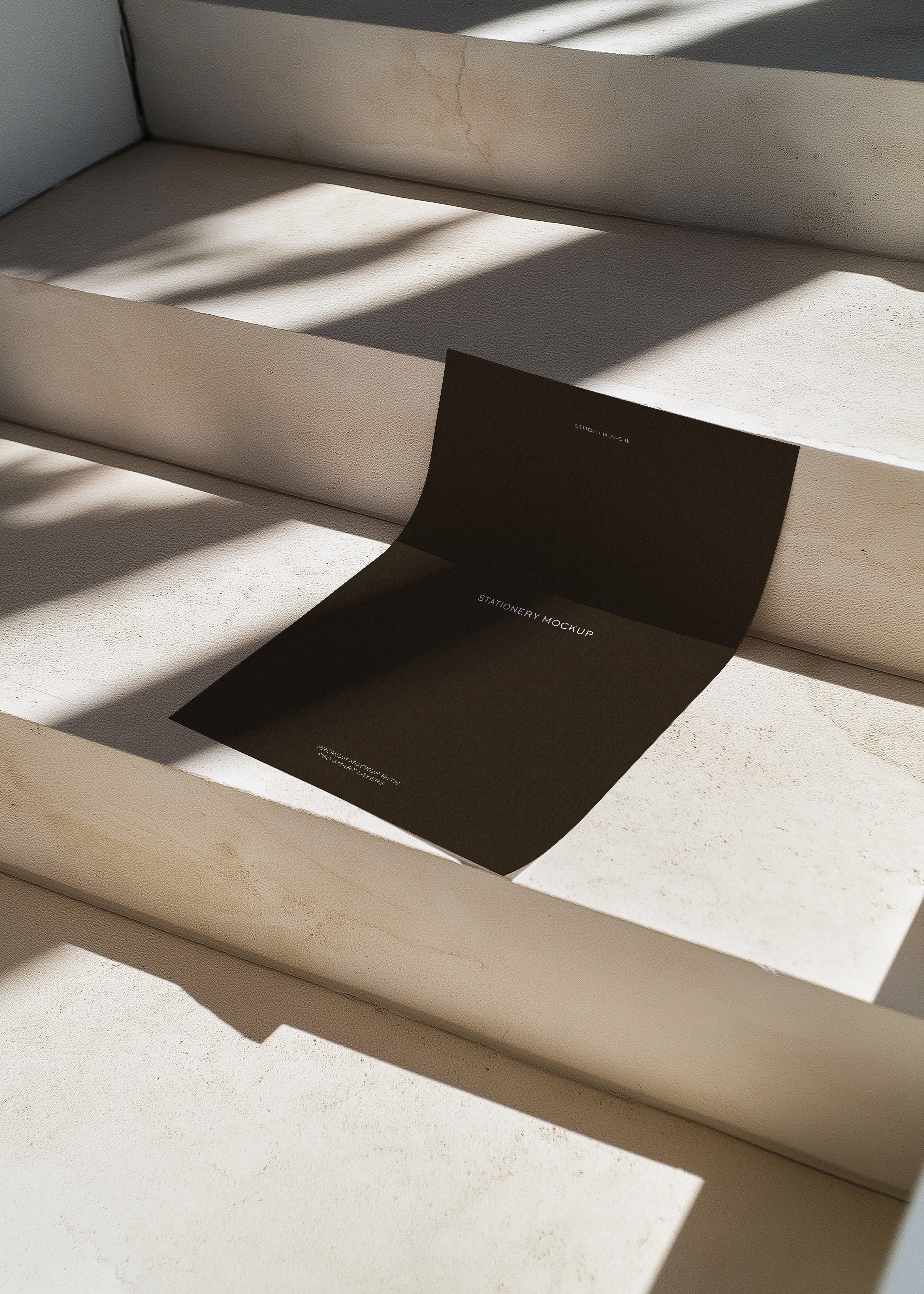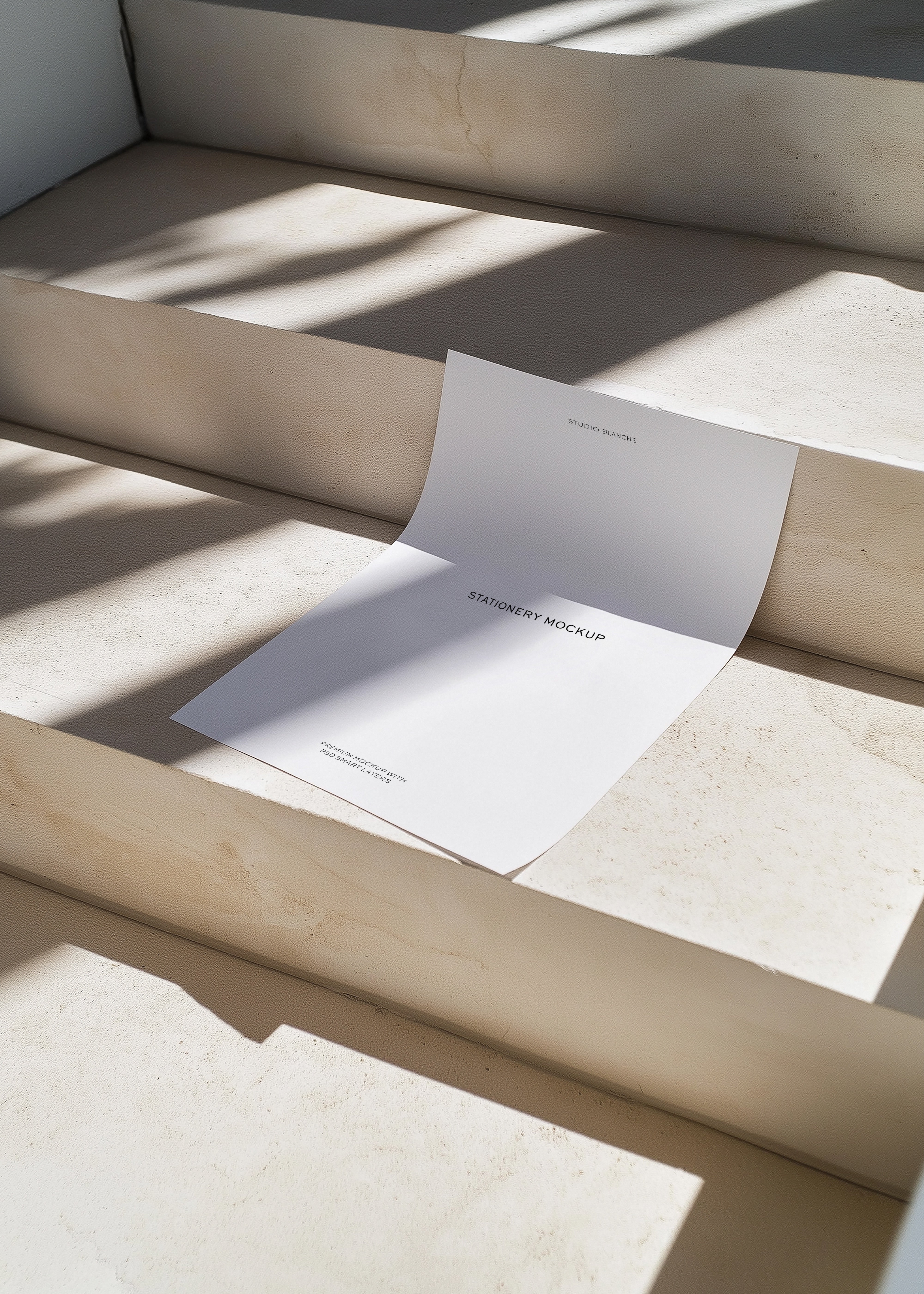 Our Stationery Card Mockup is a meeting point for innovation and reality. The white paper card, set against the backdrop of stone steps, provides a minimal aesthetic that allows your designs to come to life. This neutral aesthetic allows your design to take center stage, free from distraction.