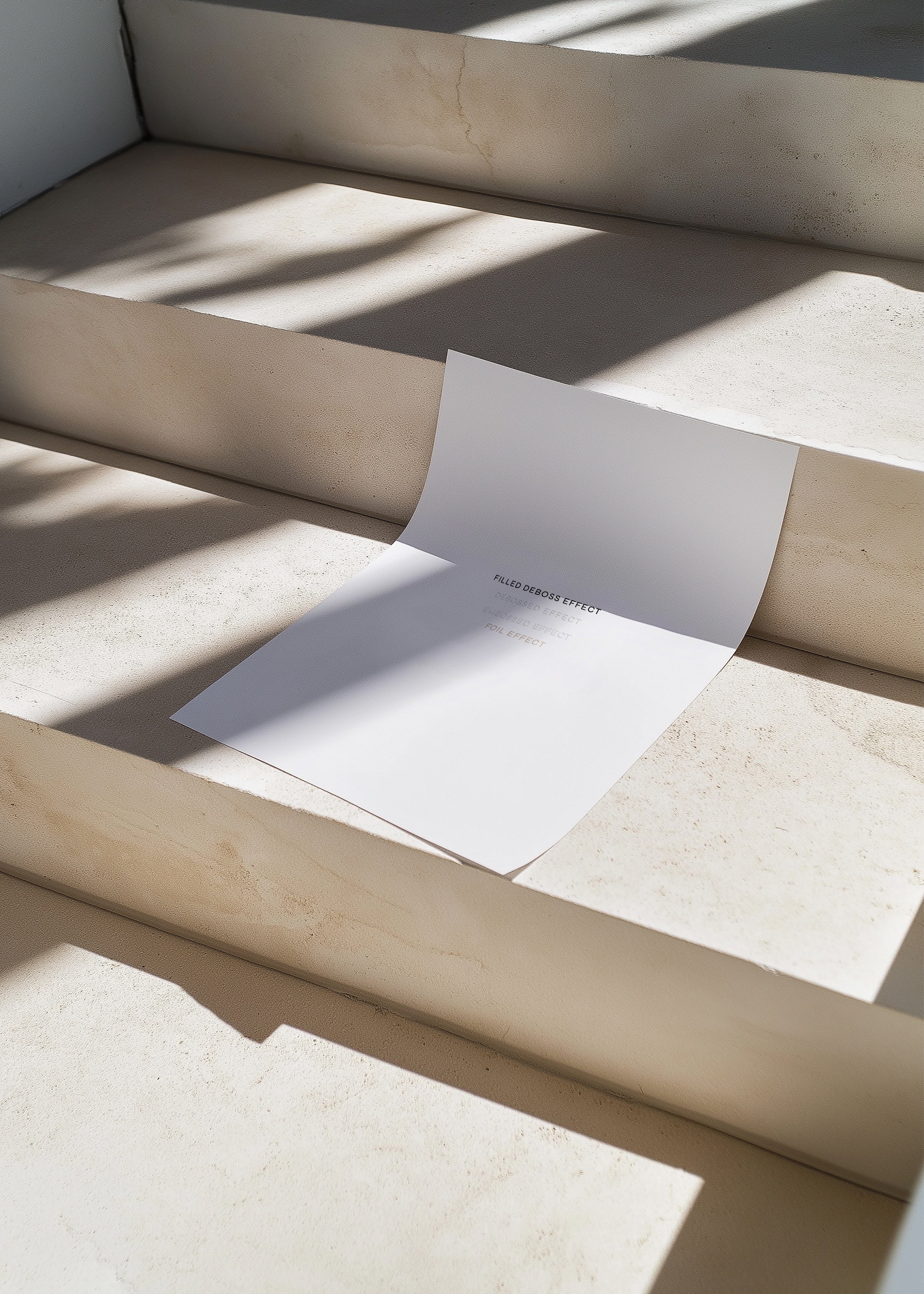 1 PSD file with smart layers including four print effects: filled deboss, blind deboss, blind emboss and gold foil.