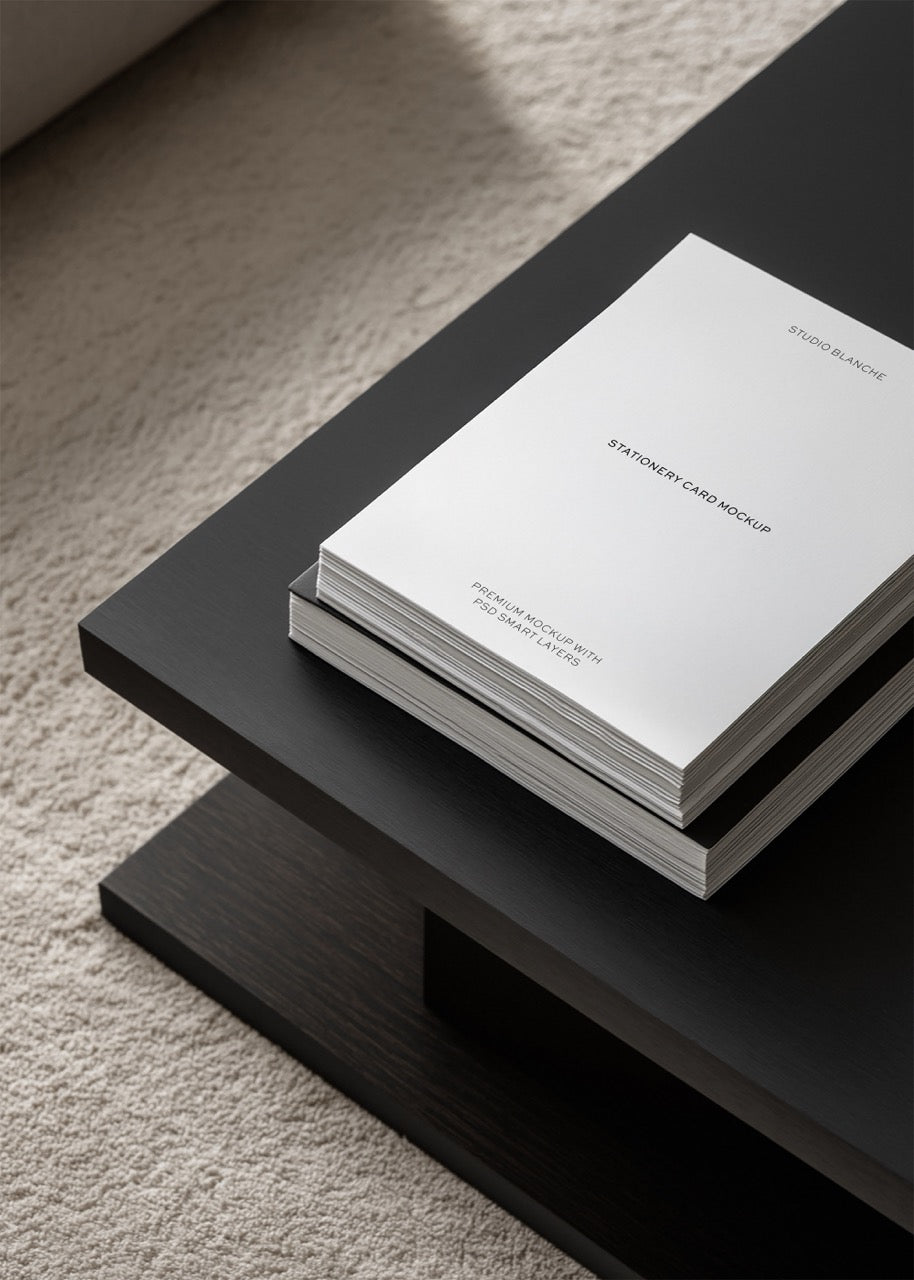 Let your stationery projects command attention with this A4 Card Mockup, featuring a striking arrangement atop carefully selected books and a polished wooden coffee table. The rich interplay of natural materials and subtle shadows provides a gallery-worthy backdrop, highlighting the textures and colours of your design. Perfect for showcasing everything from personalised cards to branded stationery, this mockup places your creations at the forefront of sophistication, helping you stand out with confidence and style.