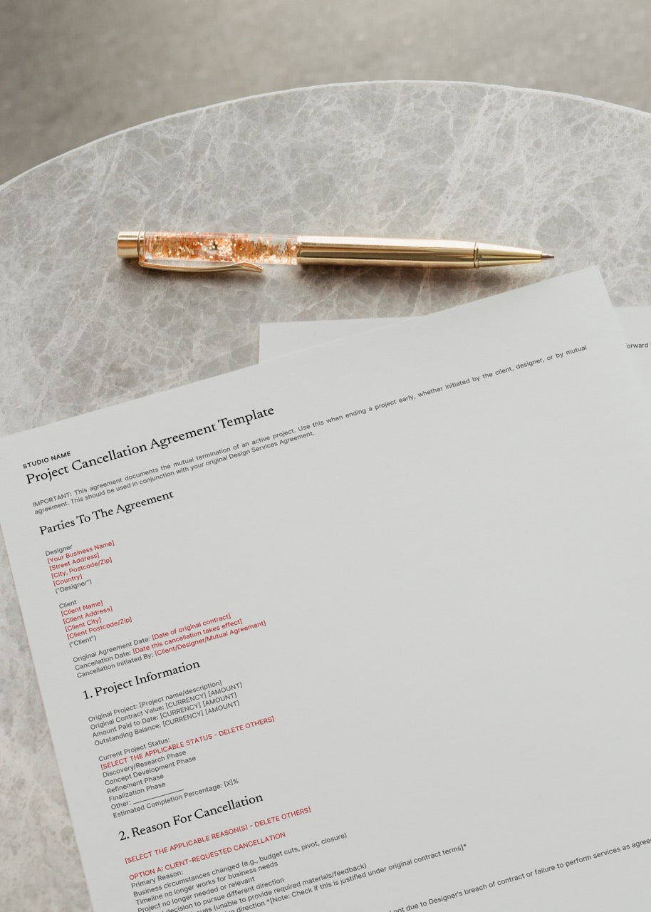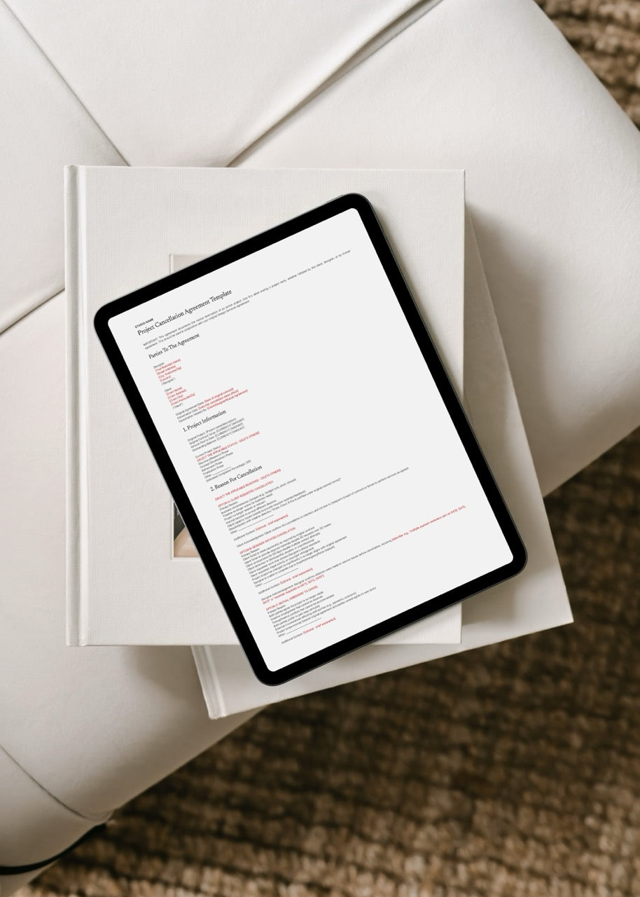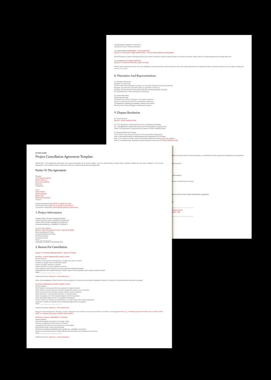 Projects fall apart. It happens. Clients disappear mid-project, or suddenly pivot to something completely different. Sometimes you realise a working relationship just isn't viable. Other times, life gets in the way and the work can't get finished. Without proper documentation, a cancelled project turns into a nightmare - disputes over payment, fights about who owns what, confusion about usage rights. An email saying "let's just cancel this" isn't protection. It's a liability waiting to happen. You need a formal agreement that spells out exactly who owes what, what happens to the work you've already completed, and whether the client can actually use any of the designs you've created. This Project Cancellation Agreement covers every scenario: client-initiated cancellations, when you need to terminate, mutual decisions to part ways, or terminations due to contract breaches. You'll get clear financial settlement terms, IP protection that actually holds up, and optional non-disparagement clauses for when things end badly. Professional documentation that protects you when projects don't go as planned.